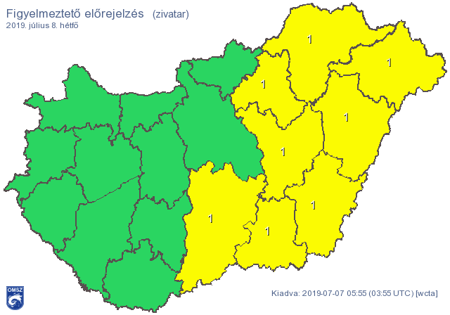 Hétfőn is több hullámban számíthatunk zivatarok kialakulása az országban több helyen. Délen és délkeleten heves zivatarok is lehetnek. Az éjszaka második felében fokozatosan megszűnik a csapadék. Az említett jelenségeket viharos (60-90 km/h) vagy károkozó széllökés (> 90 km/h), jégeső (akár > 2-3 cm ) és esetleg felhőszakadás (> 30-40 mm) kísérheti.