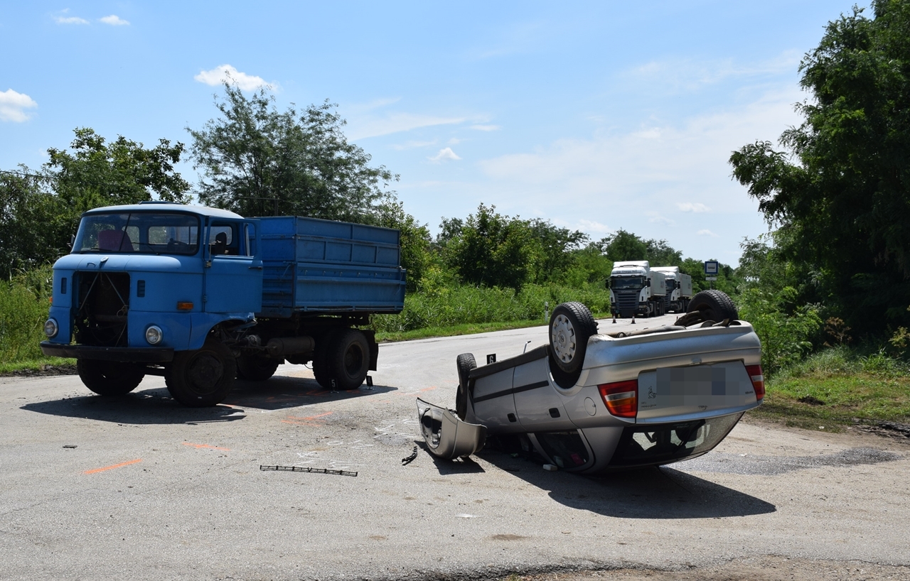 A Gyula és Elek közötti úton délelőtt háromnegyed tizenegy körül egy személyautó és egy tehergépkocsi ütközött össze. A balesetben a gépkocsi vezetője és utasa könnyebben megsérült.