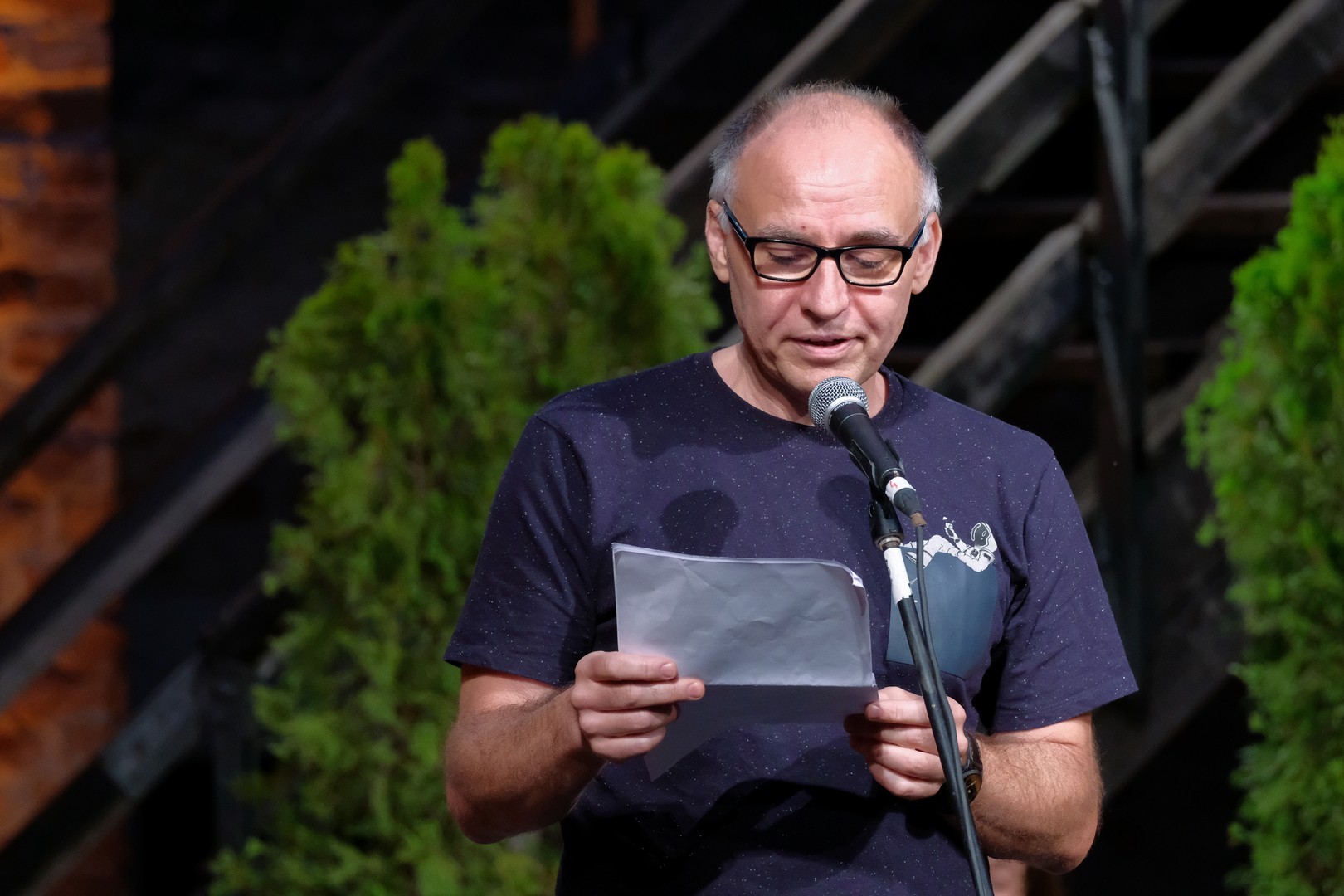 Elek Tibor utalt arra is, hogy a humorfesztivál korábbi moderátora Tarján Tamás volt, aki két éve örökre eltávozott az élők közül. Mint mondta, ő maga nem fogja tudni pótolni, csillogó humorát, felkészültségét is csak követni próbálja, majd színpadra szólította az est első felvonásának hat íróját, Temesi Ferencet, Egressy Zoltánt, Tóth Lászlót, Szabó T. Annát, Székely Csabát és Sántha Attilát, valamint Szirtes Edina „Mókus” hegedűművészt, zeneszerzőt és énekest, aki a zenei átmenetekről gondoskodott improvizatív muzsikájával.
