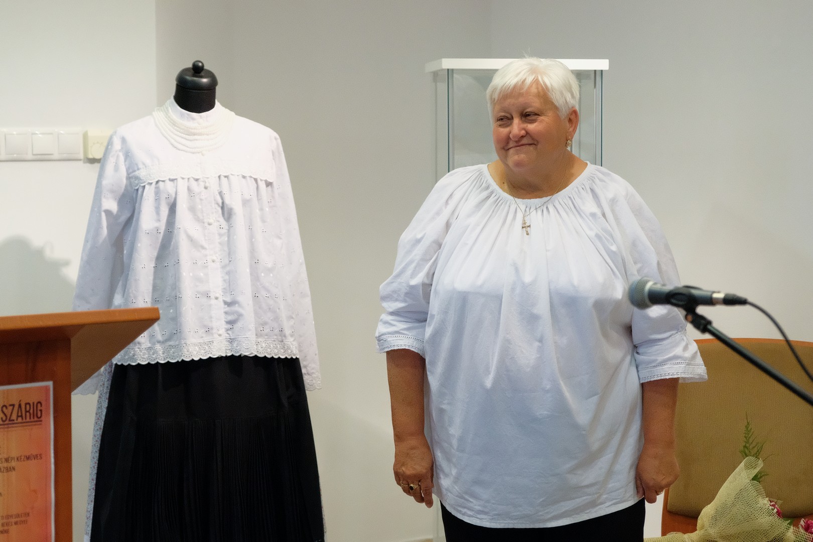 Balogh Ferencné népviselet-készítőt, népi kézművest Pozsárné Kaczkó Zita mutatta be a jelenlévőknek. A Tájvízház vezetője kiemelte: a gyulai alkotó immár visszatérő vendégük, legutóbb az adventi időszakban díszítették, illatosították a teret gyönyörű mézeskalácsai. Ezúttal újdonságot hozott az intézmény falai közé, hisz népviselet-kiállítás még nem volt a Tájvízházban. A Pendelytől a gatyaszárig című válogatás a Dél-Alföldtől Somogyon és a Rábaközön át a Székelyföldig mutatja be azt a hagyományos magyar népi viseletkultúrát, amely mára elszakadt a mindennapi élettől, mutatott rá köszöntő szavaiban Pozsárné Kaczkó Zita.