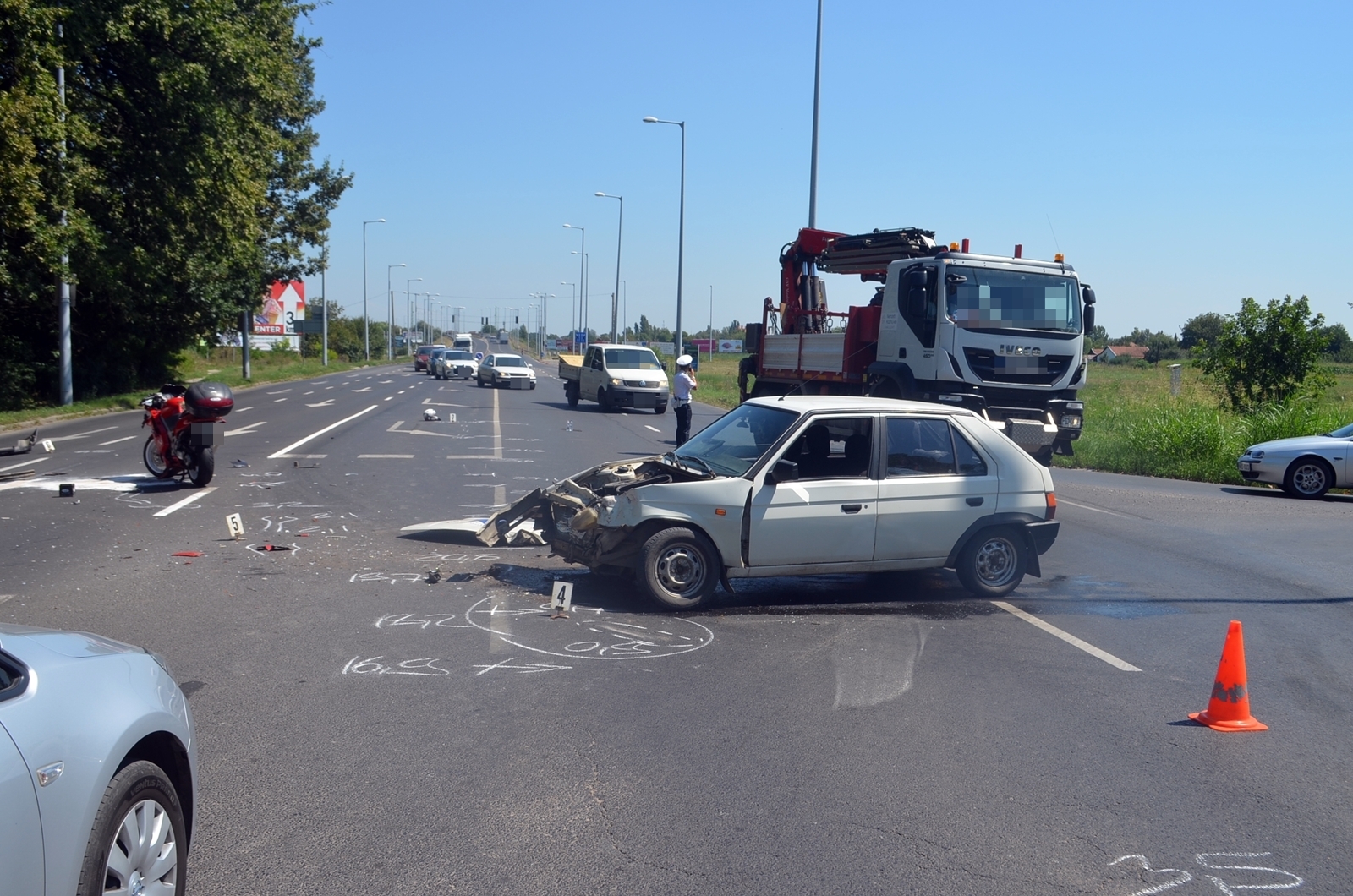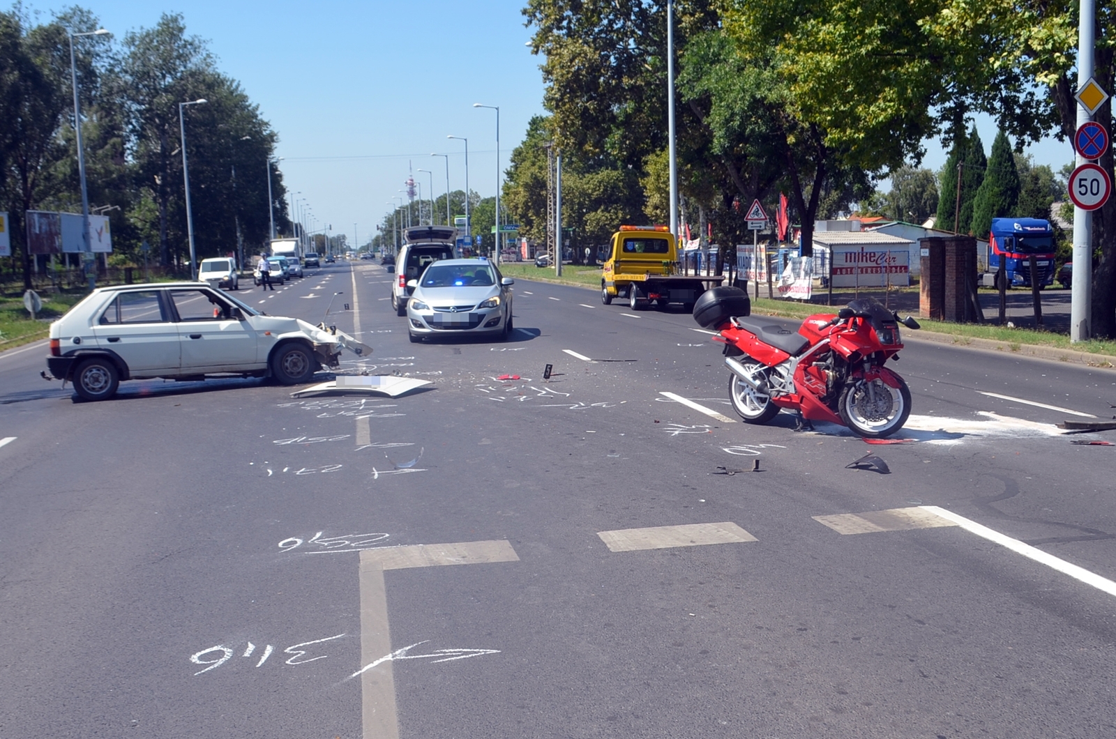 Békéscsabán, a Szarvasi úton, a Pataky László utcai kereszteződésnél dél körül összeütközött egy személyautó és egy motorkerékpáros. Utóbbi az elsődleges információk szerint nyolc napon belül gyógyuló sérülést szenvedett.