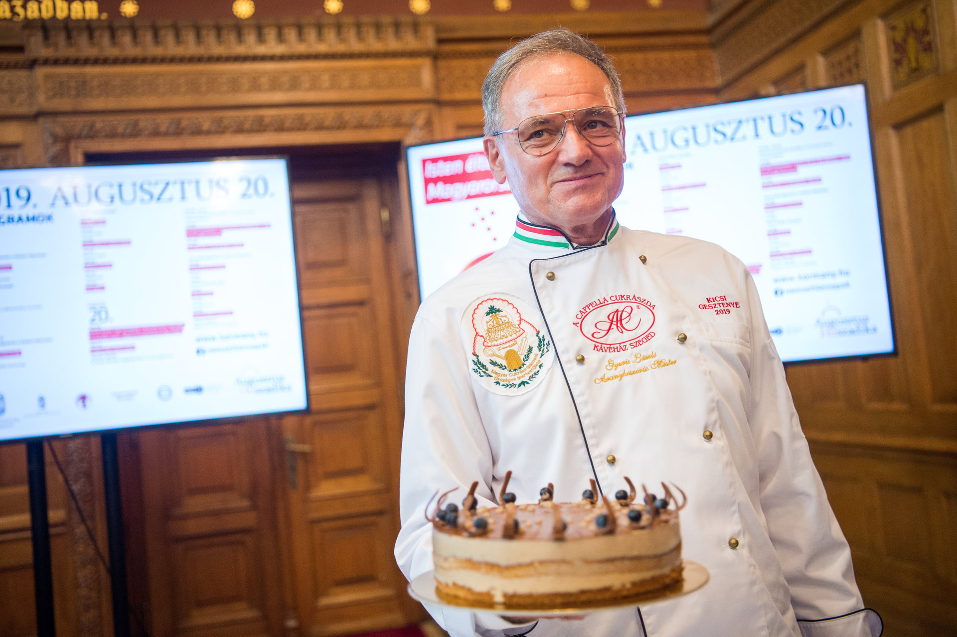 Gyuris László, a szegedi A Cappella Cukrászda cukrászmestere mutatja alkotását, a Magyarország cukormentes tortájának választott Kicsi Gesztenye elnevezésű tortát az augusztus 20-i ünnepi rendezvények szervezőinek sajtótájékoztatóján az Országház Vadásztermében 2019. július 31-én