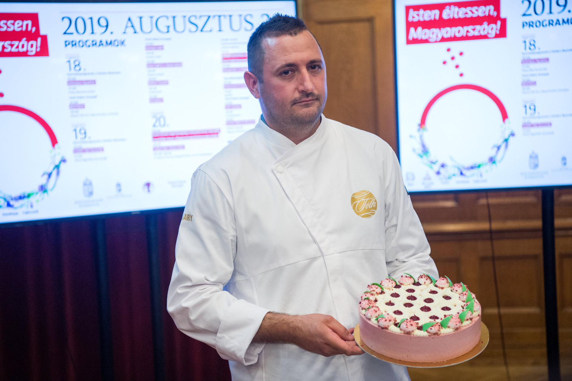 Tóth Norbert, a dunaföldvári Tóth Cukrászda cukrászmestere mutatja alkotását, a Magyarország tortájának választott Boldogasszony csipkéje elnevezésű tortát az augusztus 20-i ünnepi rendezvények szervezőinek sajtótájékoztatóján az Országház Vadásztermében 2019. július 31-én