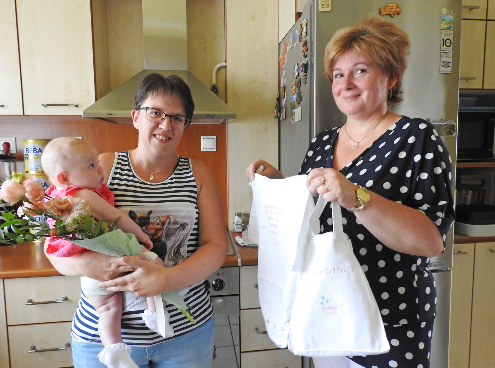 Kiss Tamásné önkormányzati képviselő köszöntötte az életének lassan ötödik hónapjába lépő Gregor Lucát és édesanyját, Gregor Erika Csillát augusztus 28-án a gyulai Babaruha program keretében.