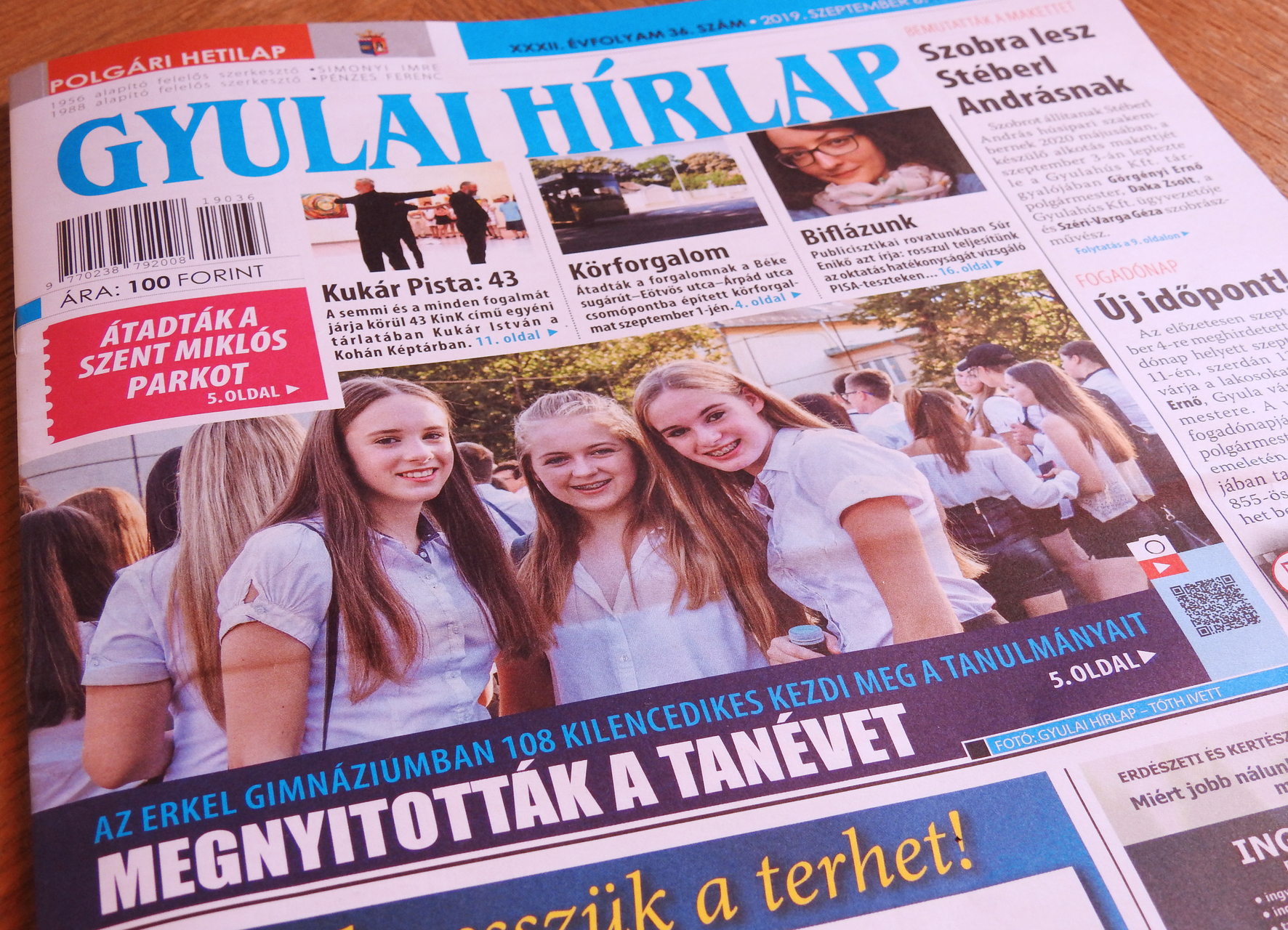 A friss Gyulai Hírlapban többek között arról írunk, hogy a héten bemutatták a Stéberl András húsipari szakembernek készülő szobor makettjét. Széri-Varga Géza szobrászművész alkotását 2020 májusában leplezik le. Címlapfotónk az Erkel Ferenc gimnázium tanévnyitóján készült. A tanintézménynek szeptembertől Zámori Ida az új igazgatója. E heti lapszámunkban arról is hírt adunk, hogy a napokban átadták a Béke sugárúti körforgalmat és a felújított Szent Miklós parkot. Előbbi 130 millió forintba, utóbbi több mint 250 millió forintba került. Az újságban emellett cikket közlünk a nagycsaládosoknak nyújtott iskolakezdési támogatásról, Kukár István legújabb kiállításáról és három fürdővárosi balesetről. Arról is beszámolunk, hogy összeállt Gyulán a baloldali ellenzék, a polgármesterjelöltjük Leel-Őssy Gábor. A hírlapból emellett azt is megtudhatják olvasóink, hogy a Városbarátok összegyűjtötték az önkormányzati választáson való induláshoz szükséges ajánlóíveket. Lapunkból természetesen ezúttal sem hiányozhatnak a sporthírek, az állandó rovatok és a jegyzet.
