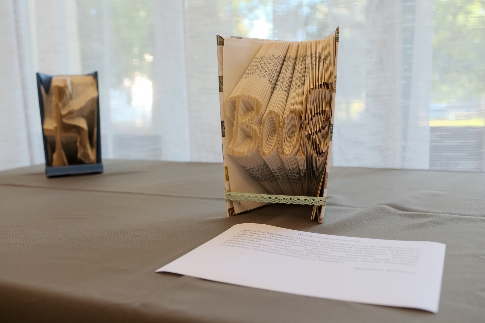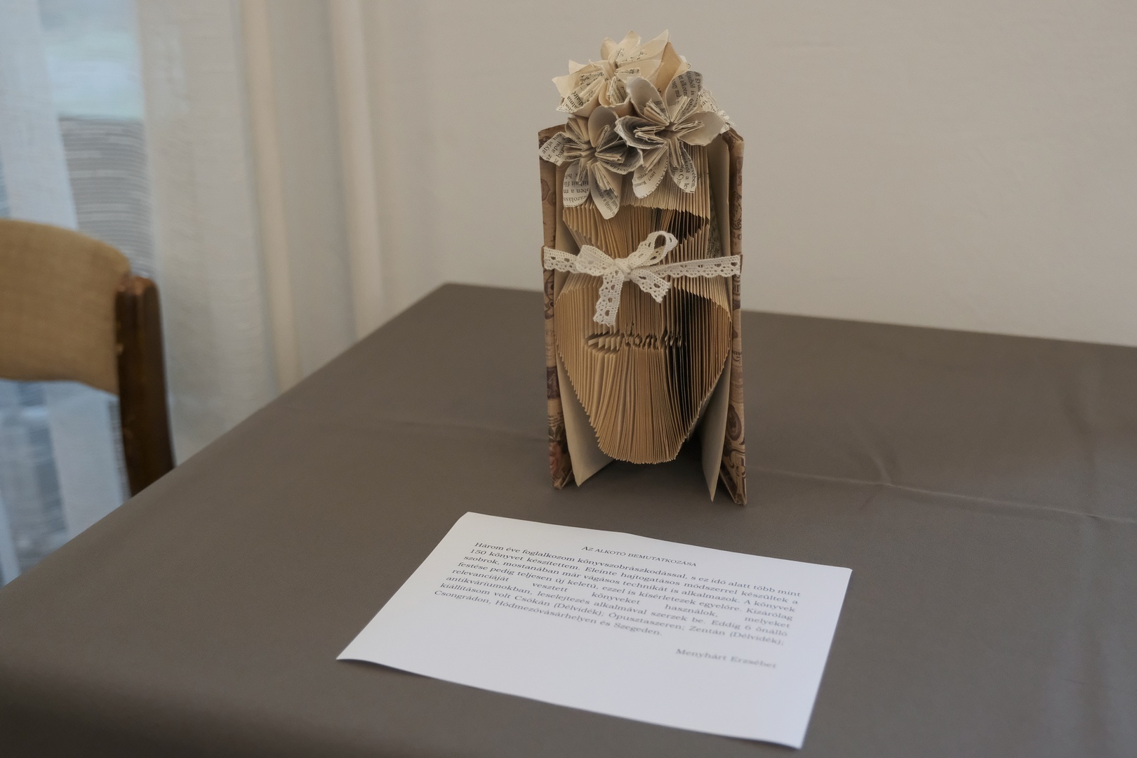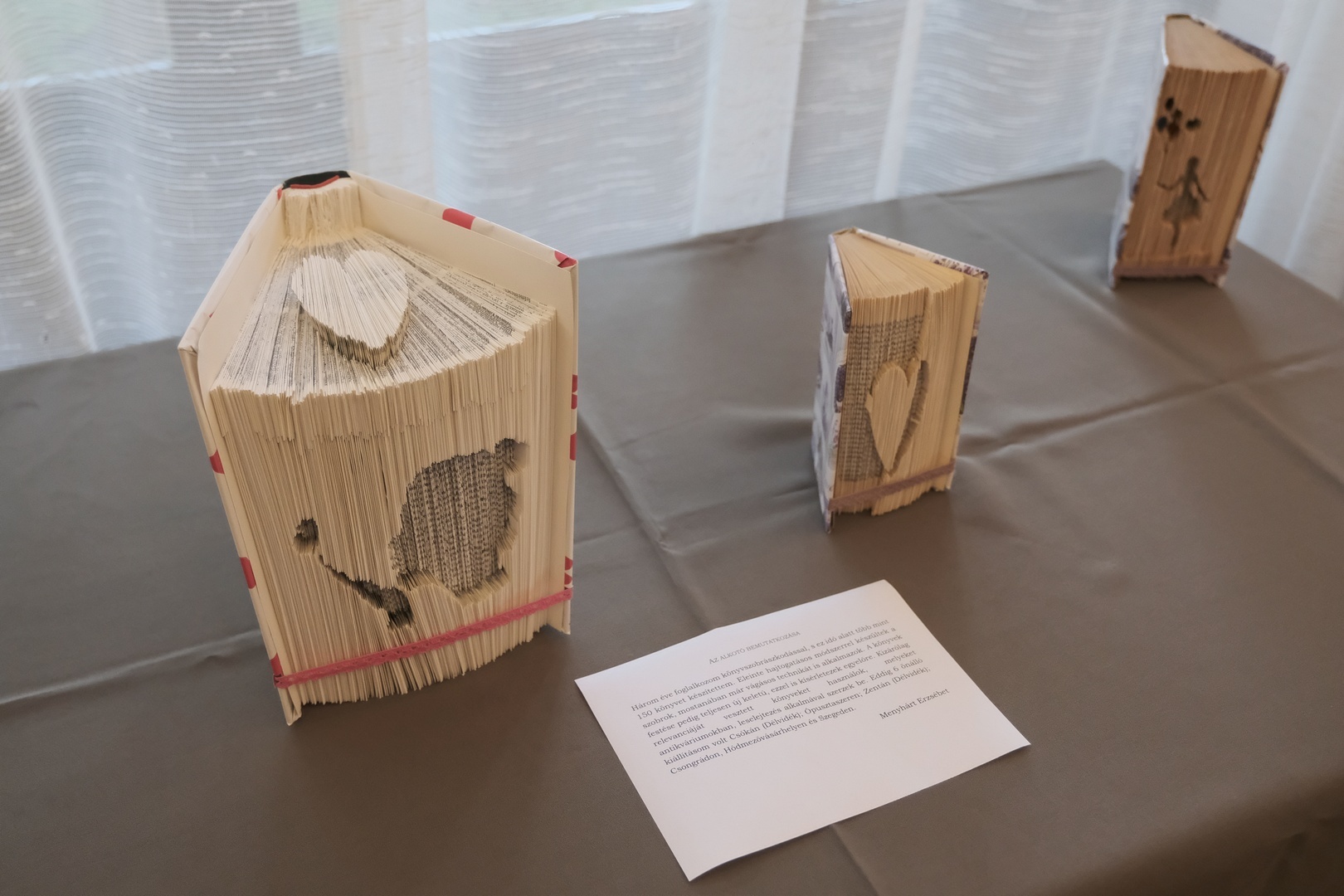 A gyulai születésű magyar-történelem szakos tanárnak ez már a hetedik kiállítása, tudtuk meg a megnyitón. Már amikor az első megnyílt, nagy vágya lett, hogy az anyagot hazahozhassa, és itt, a szülővárosában is bemutassa, mutatott rá Menyhárt Erzsébet. Könyvszobrászattal három éve foglalkozik. Kezdetben nem voltak pontosak a papírhajtásai, nem volt se szép, se olvasható az eredmény, de addig gyakorolt, amíg el nem érte azt a képet, amire azt mondhatta, megfelel. Délutánok, napok mentek rá erre. Ma már akár másfél óra alatt is képes elkészíteni egy egyszerűbb kompozíciót.