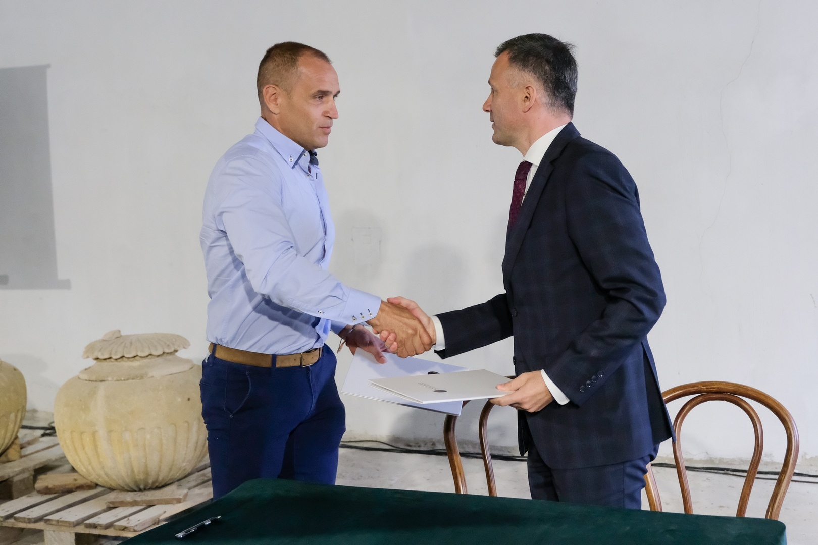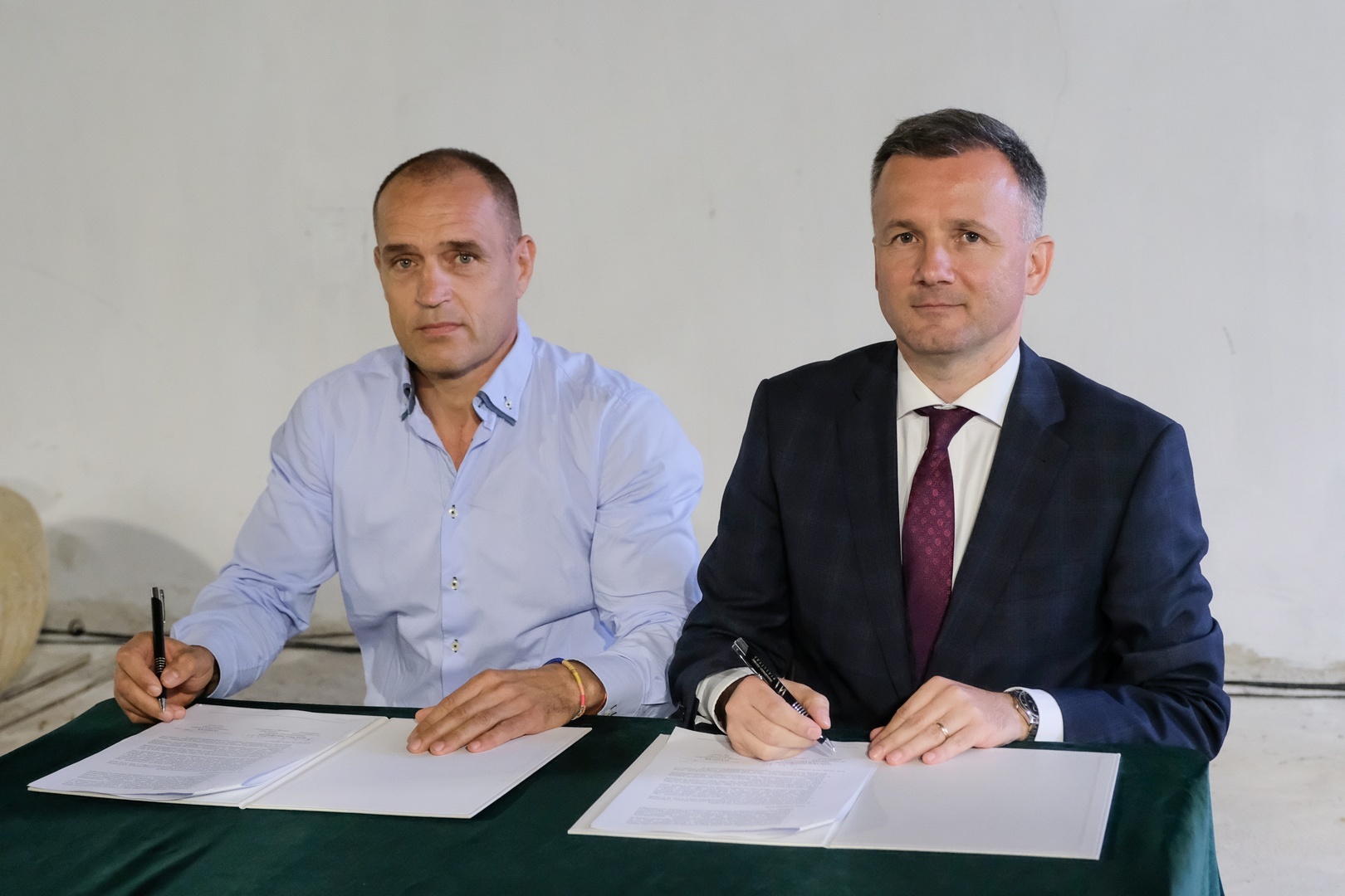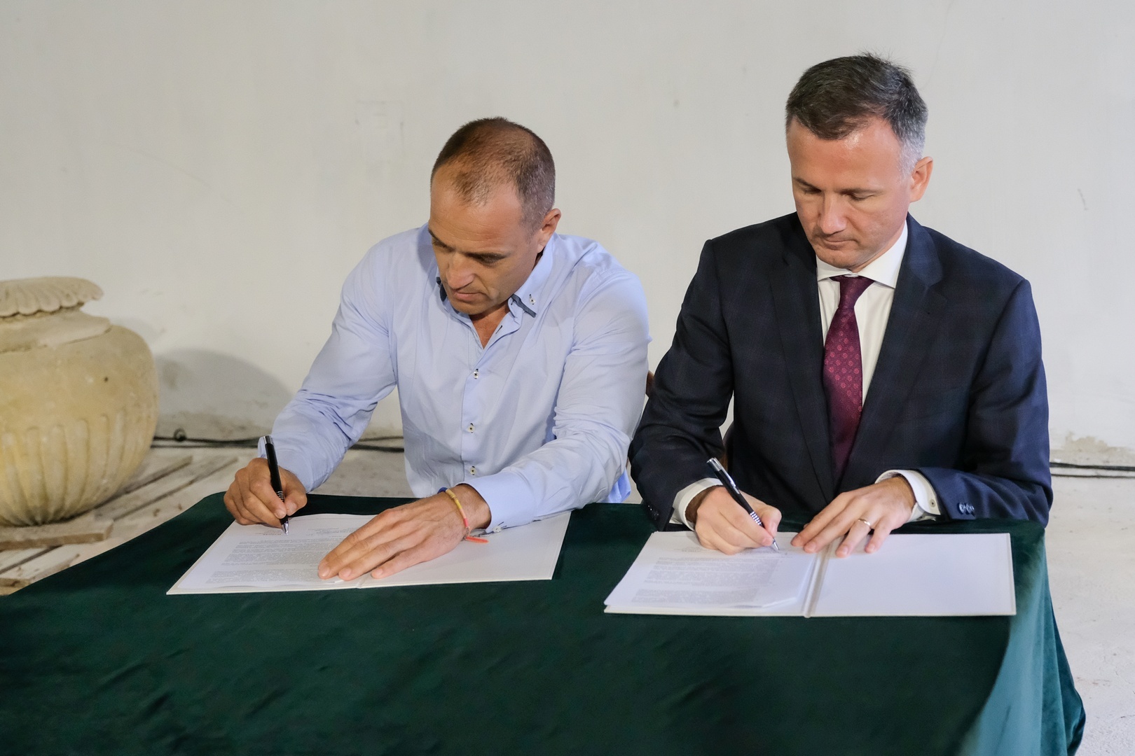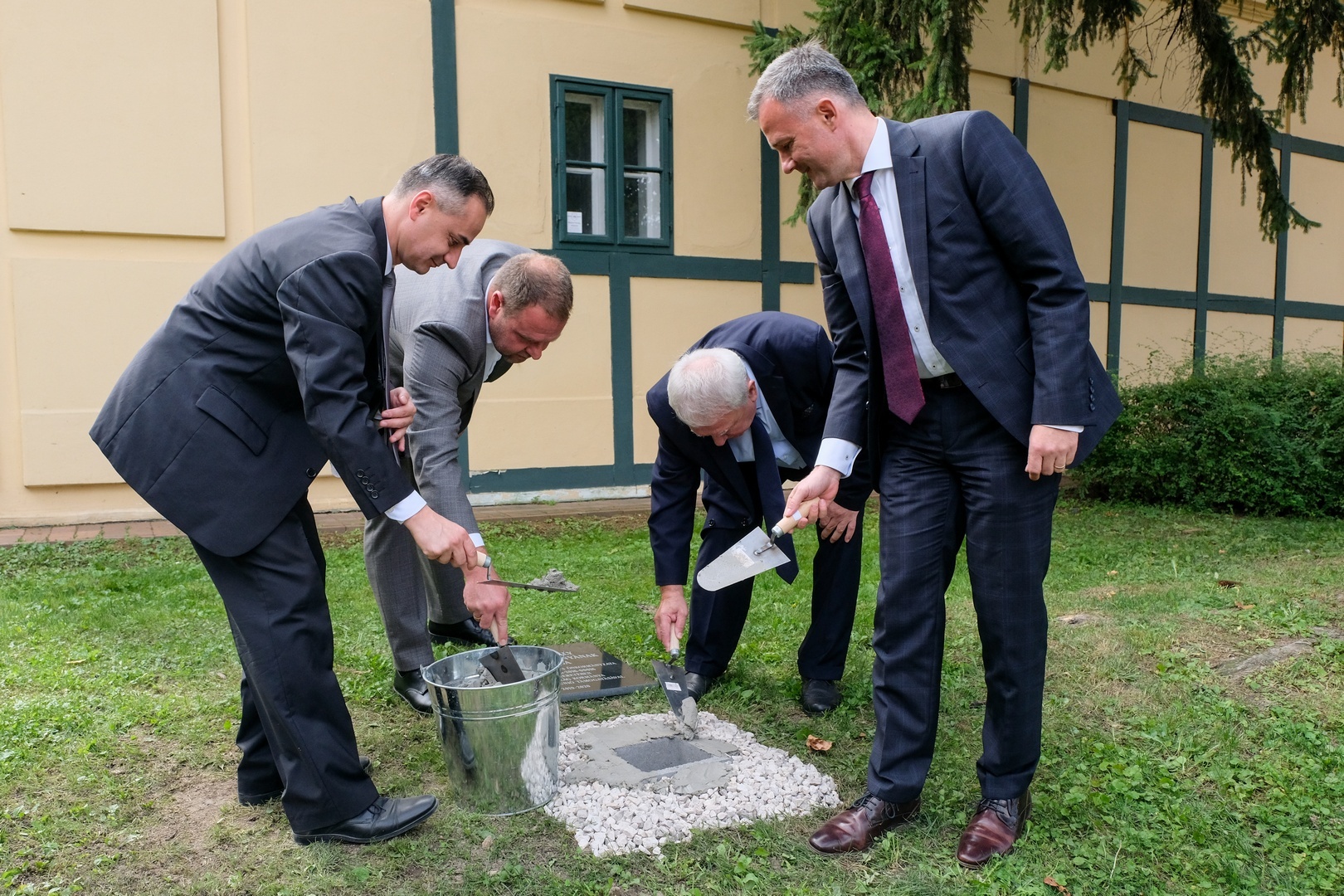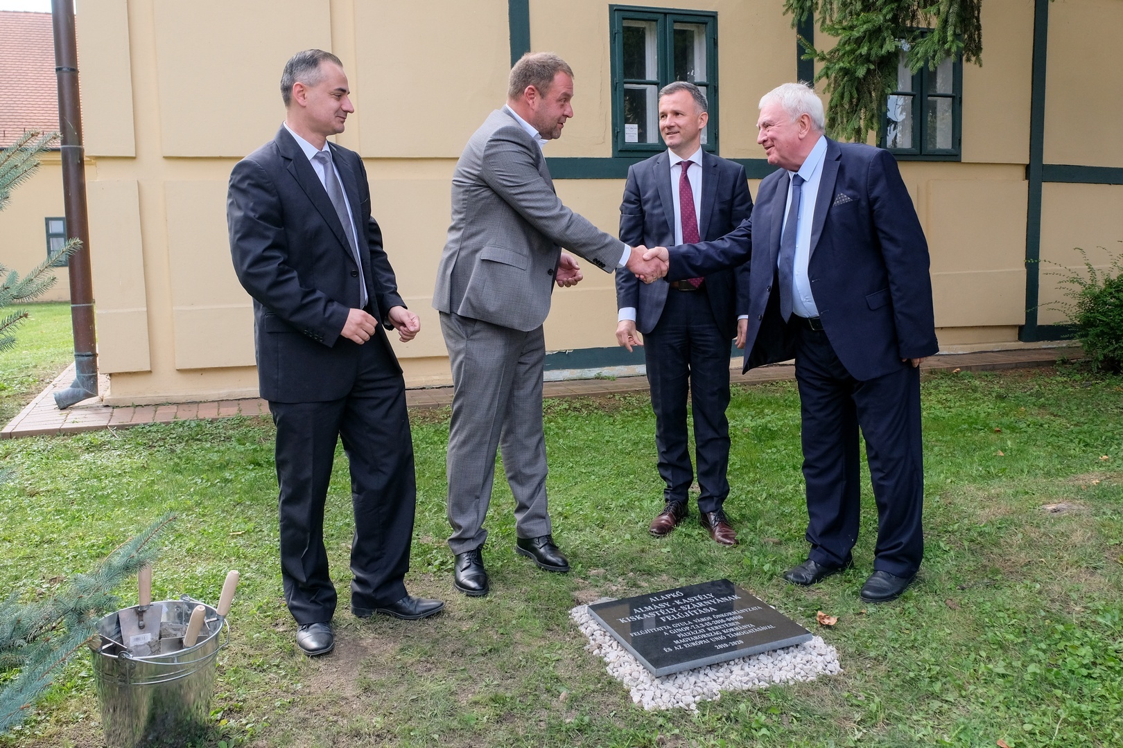 A köszöntők után Piskolty Tibor, a Futizo Kft. ügyvezetője és Görgényi Ernő írták alá a kivitelezői szerződést, majd a polgármester, Kovács József, Virág Zsolt és Guller Zoltán helyezték el az alapkövet.