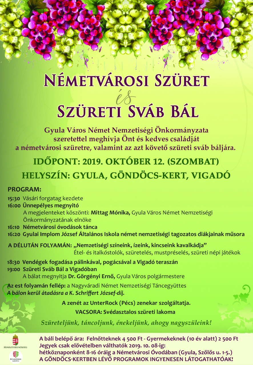 Németvárosi szüretre és sváb bálba várja a hétvégén a fürdővárosiakat Gyula Város Német Nemzetiségi Önkormányzata. Az egész napos rendezvényen étel- és italkóstolóval, szüreteléssel és vásári forgataggal várják a látogatókat.