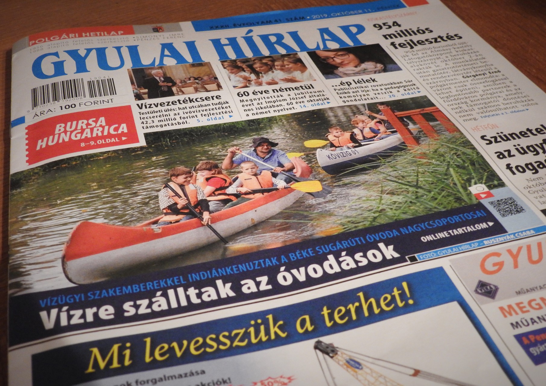 A friss Gyulai Hírlapban többek között arról írunk, hogy a napokban lerakták az Almásy-kastély megújuló kiskastélyszárnyának alapkövét. A beruházás 954 millió forintba kerül, az épületben gasztrotörténeti bemutatótermet, látványkonyhát és rendezvényteret alakítanak ki. Címlapfotónk az Élővíz-csatornán készült, ahol a Béke sugárúti óvoda nagycsoportosai indiánkenukon szálltak vízre. E heti lapszámunkban arról is hírt adunk, hogy 60 évvel ezelőtt vezették be az Implom-iskolában a német nemzetiségi nyelvoktatást. Az évforduló alkalmából ünnepséget szervezett az intézmény. Beszámolunk arról is, hogy az idősek világnapja alkalmából szervezett rendezvényen megválasztották az év nagymamáját és az év nagypapáját. A városi sportcsarnokban a Diploma Honoris kitüntetést is átadták. Az újságban emellett cikket közlünk a gyulai képviselő-testület legutóbbi üléséről, az október 6-i városi ünnepségről, a gyulai terepraliverseny fürdővárosi eredményeiről, és arról, hogy fennállásának negyvenedik évfordulóját ünnepelte az 5-ös iskola. Lapunkból természetesen ezúttal sem hiányozhatnak az állandó rovatok és a jegyzet.