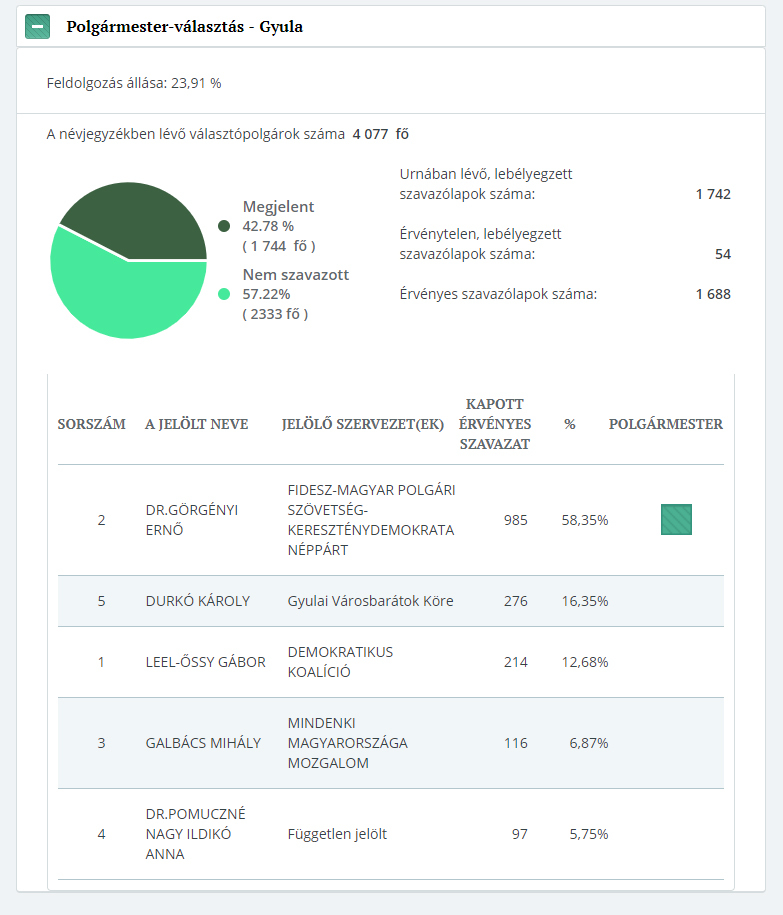 Görgényi Ernő polgármesterjelölt vezet 23,91%-os feldolgozásnál
