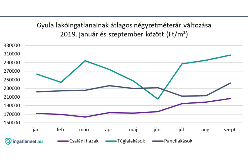 Az idei évben mind az eladásra kínált gyulai lakások, mind a házak árai megemelkedtek. A legnagyobb mértékű 24 százalékos drágulás a családi házak átlagos négyzetméter áraiban történt. Ez esetben a januári 170 ezer Ft/m²-es átlagárak szeptemberre 210 ezer Ft/m²-re ugrottak.