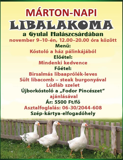 Ismét megrendezi a Márton-napi libalakoma elnevezésű gasztroeseményét november 9-én és 10-én a városunkban található Halászcsárda étterem.