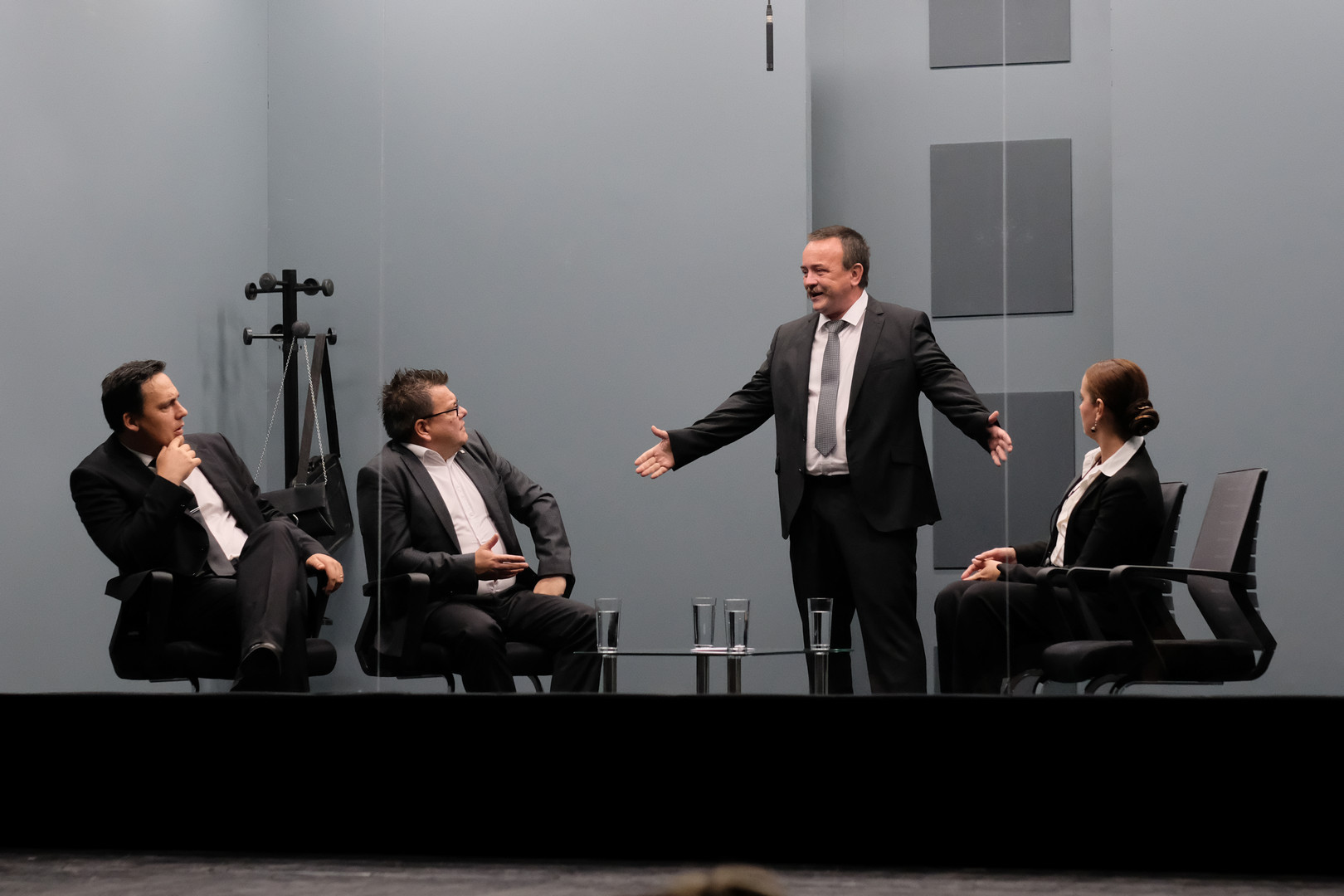 Az egyes karakterek, a máz alatti valódi arcok és jellemek ebben a helyzetben bontakoznak ki. Annak lehetünk tanúi, hogy a vezetői szék megszerzéséért, a pénzért, az anyagi jólétért mit meg nem teszünk. Mercét (Márdirosz Ágnes) például az édesanyja halálának a híre se mozdítja ki az egyre feszültebbé, embertelenebbé váló pozícióharcból. Ezt vágja hozzá Ferran is, az egyetlen, aki ringben marad, amíg meg nem tudja, hogy igazából rajta kívül nincs is más pályázó: a többiek mind a cég pszichológusai. Enric (Kiss László) is, akit ő maga leplez le már a játék elején.