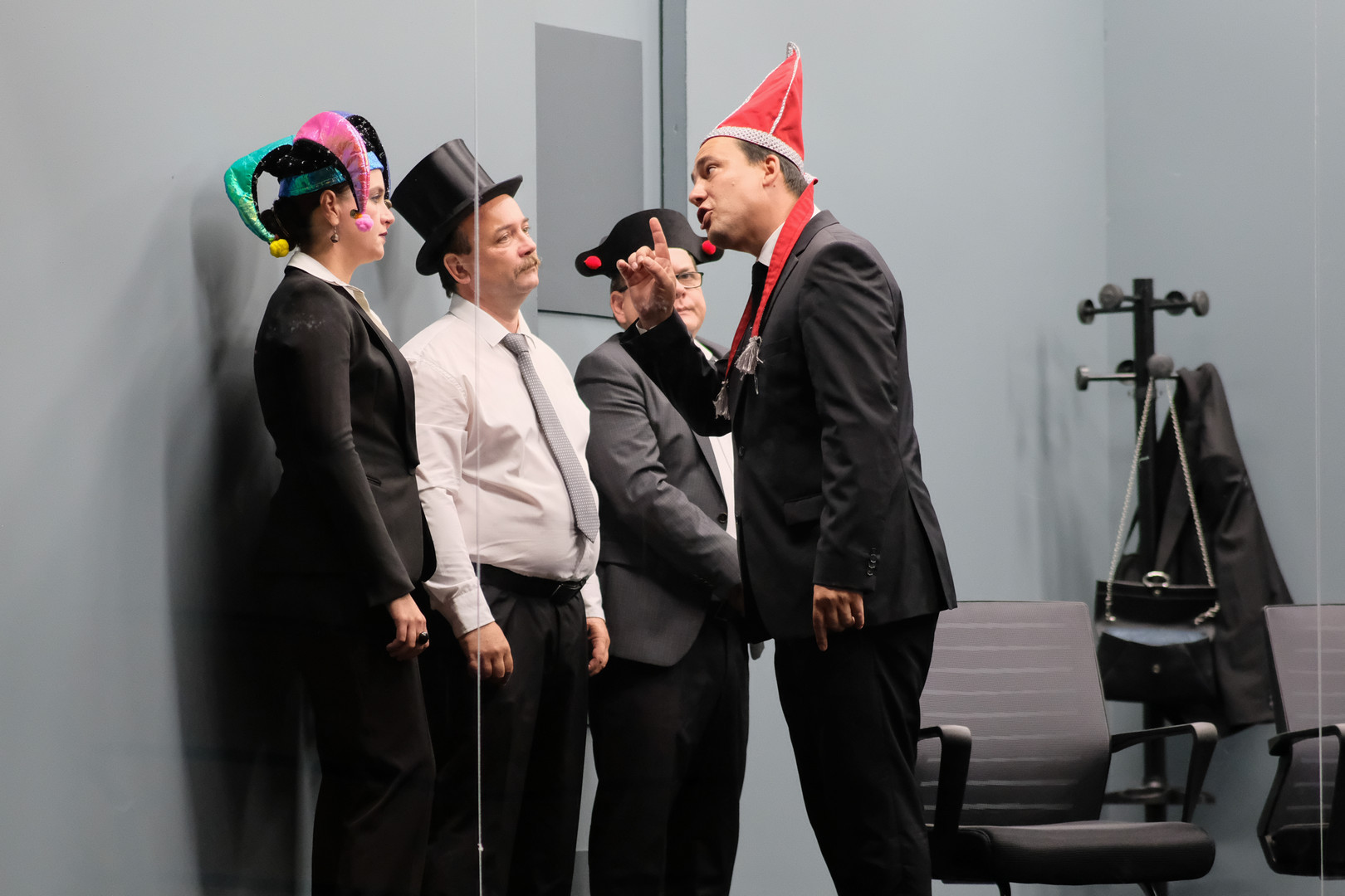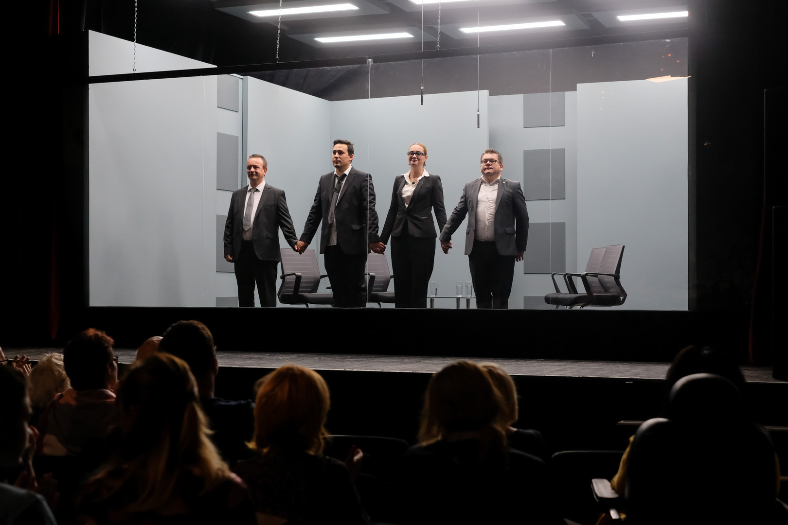 Minden gyalázatuk ellenére a színpadon okos szereplőket és okos karaktereket látunk. Ahhoz, hogy követni tudjuk a gondolatmenetüket, alaposan oda kellett figyelnünk. Ezen könnyített a minimalista, modern díszlet (díszlettervező: Szűcs-Olcsváry Gellért): a neonokkal megvilágított szobában négy szürke irodai szék, egy asztal, rajta négy pohár víz és egy szürke fiókos szekrény kapott helyett. A játékteret a közönségtől egy plexilap választotta el, így a publikum úgy érezhette, mintha maga is az interjúztatók táborába tartózna.