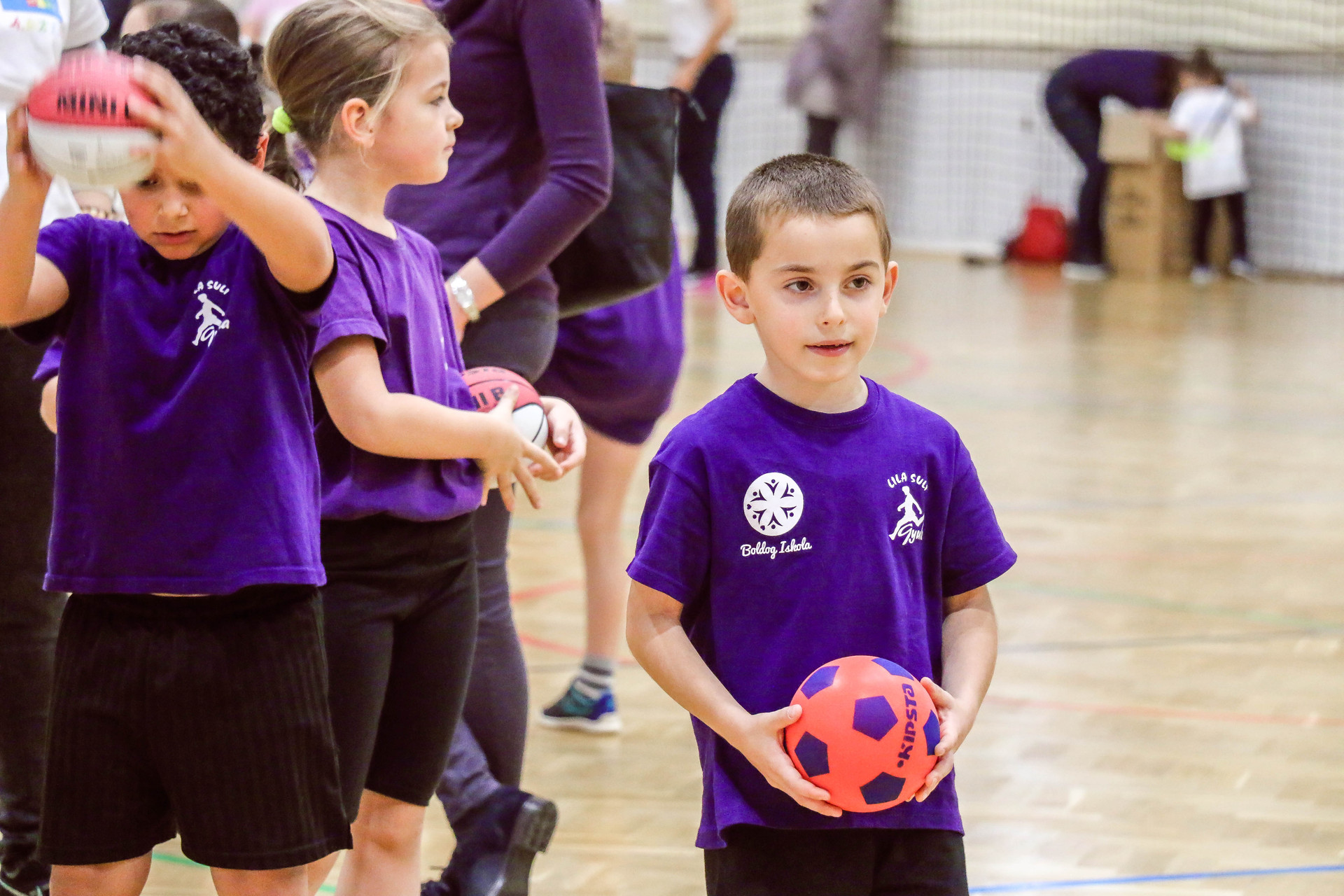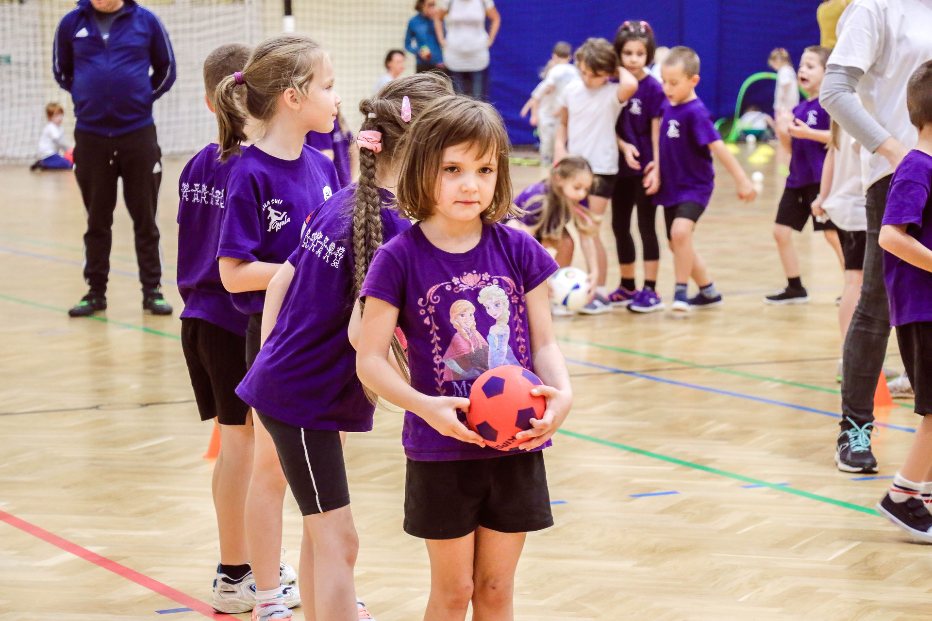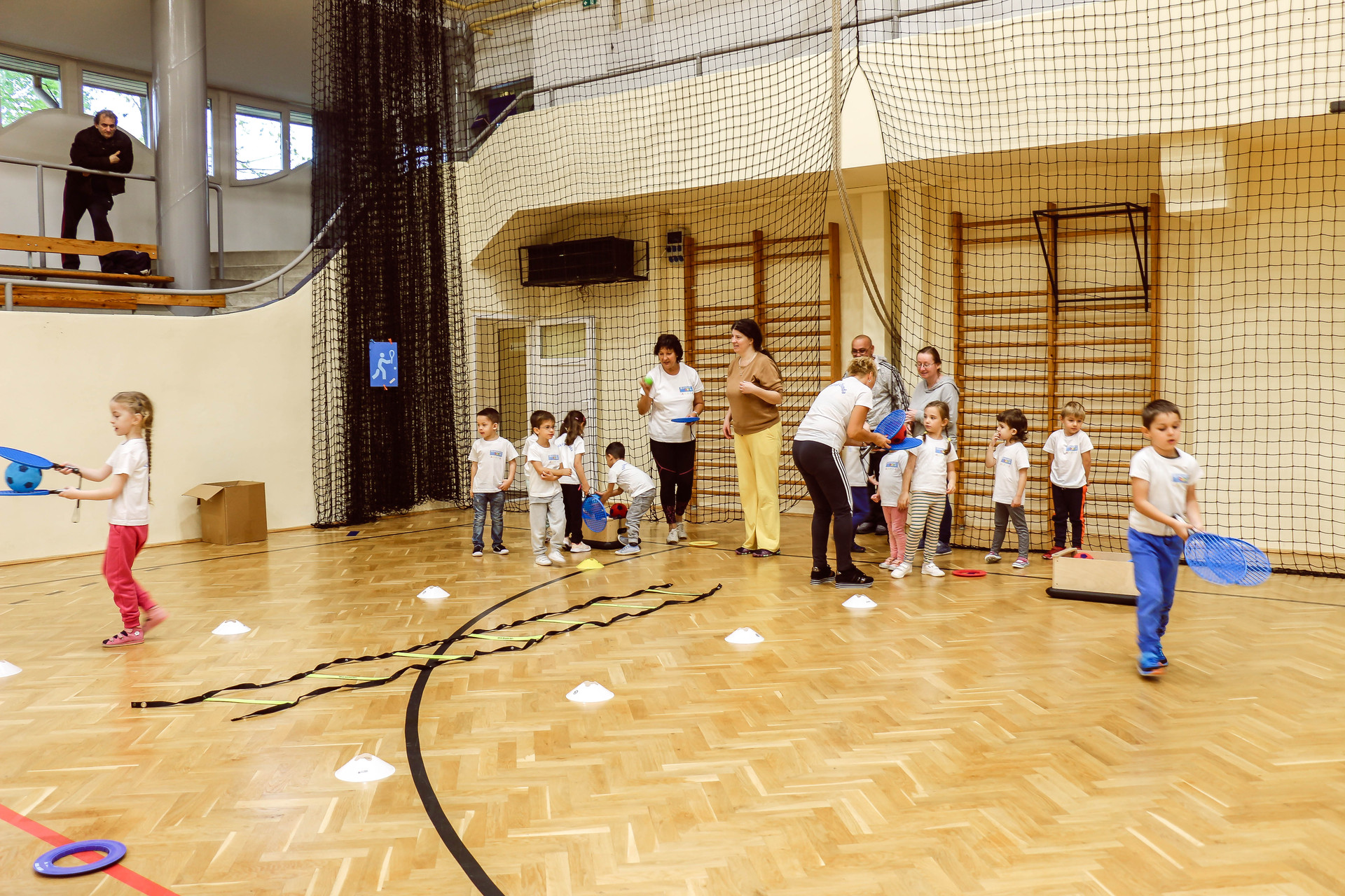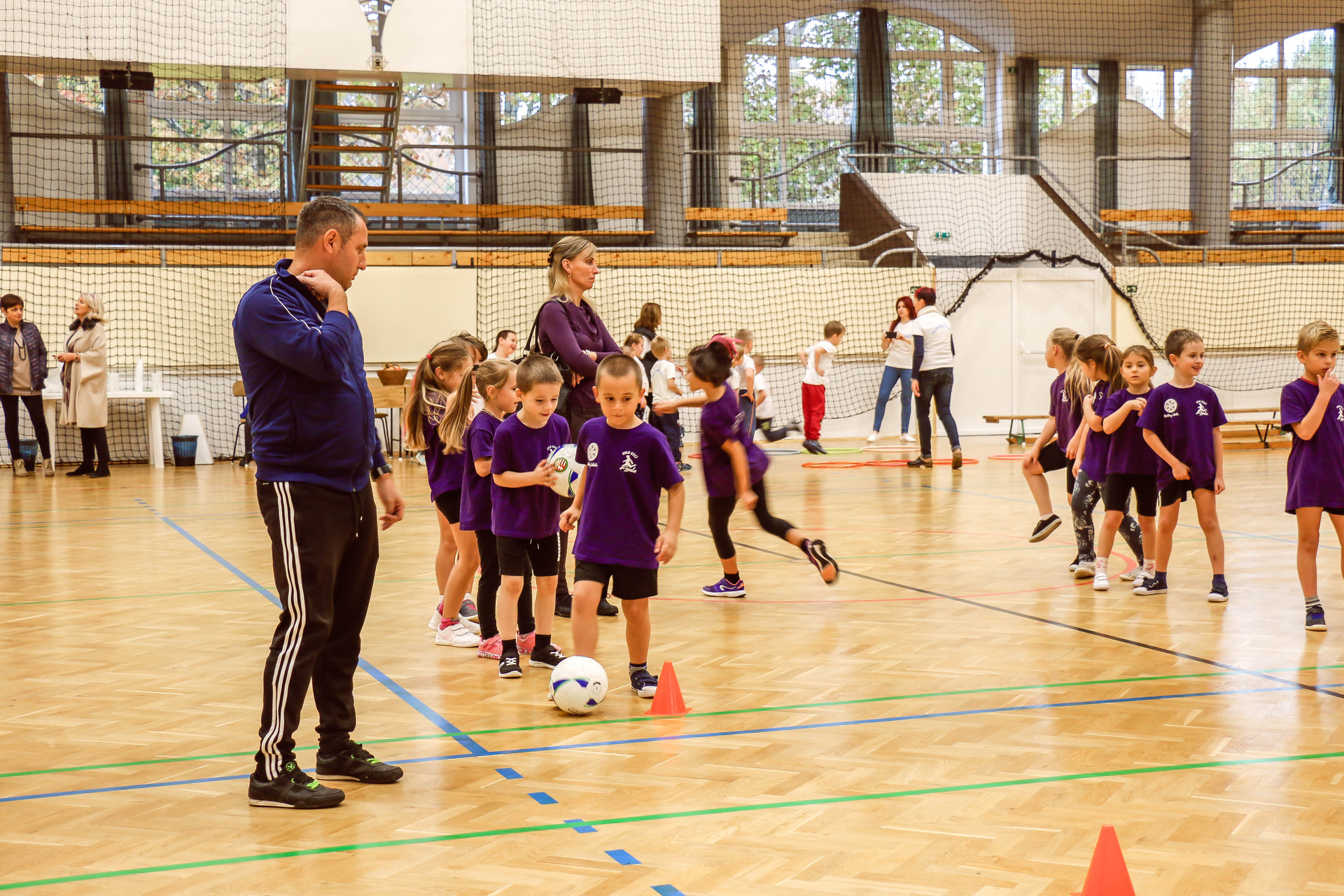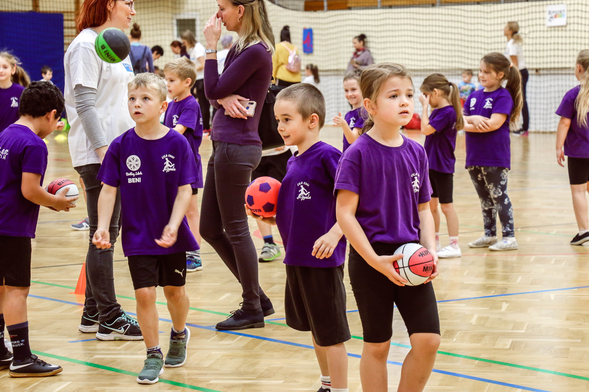 A legkisebbeket érkezés után az óvoda vezetője köszöntötte, majd egy rövid bemelegítés következett és minden apróság kipróbálhatott egy-egy labdajátékot, így lehetőségük volt kosarazni, kézilabdázni és focizni is.