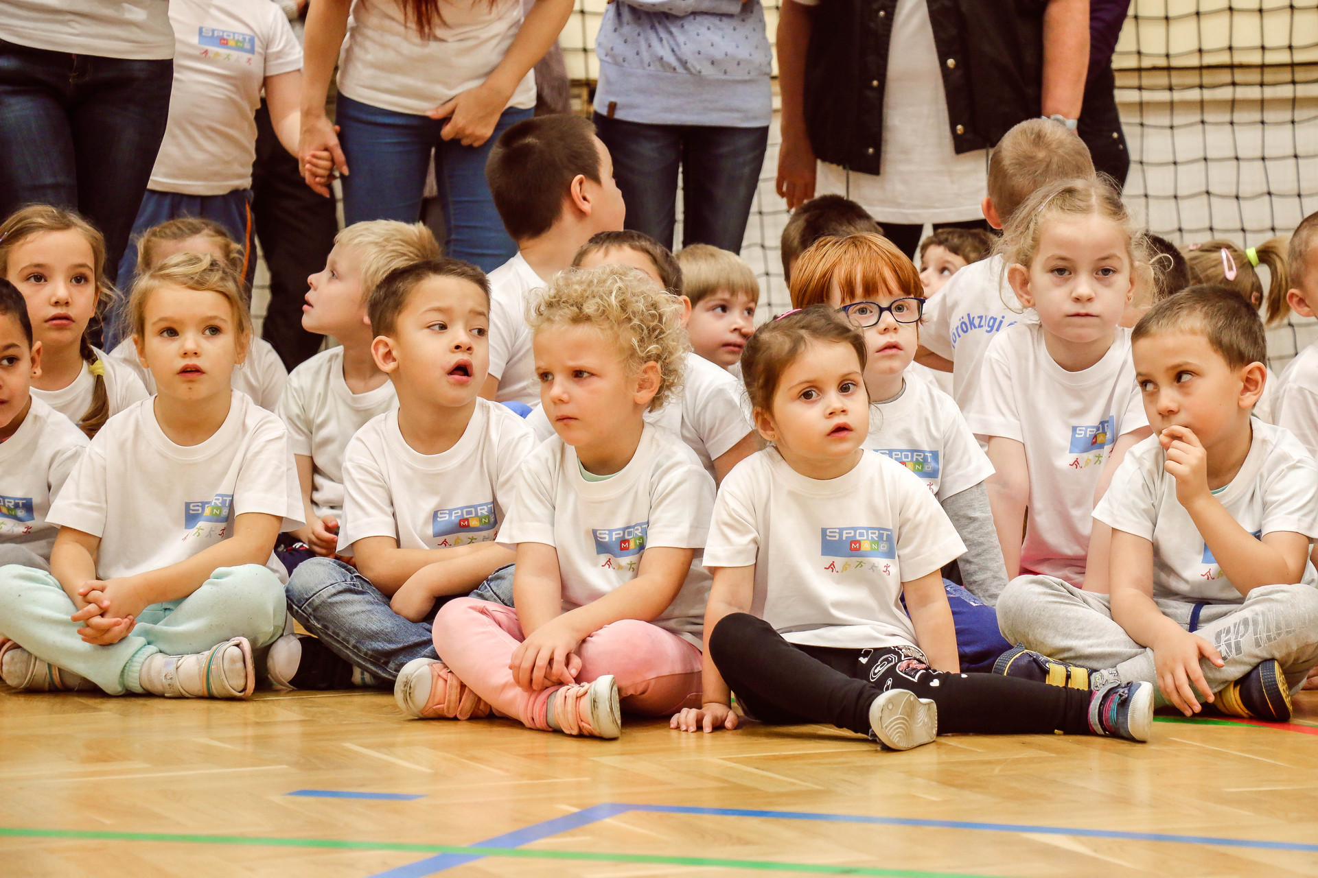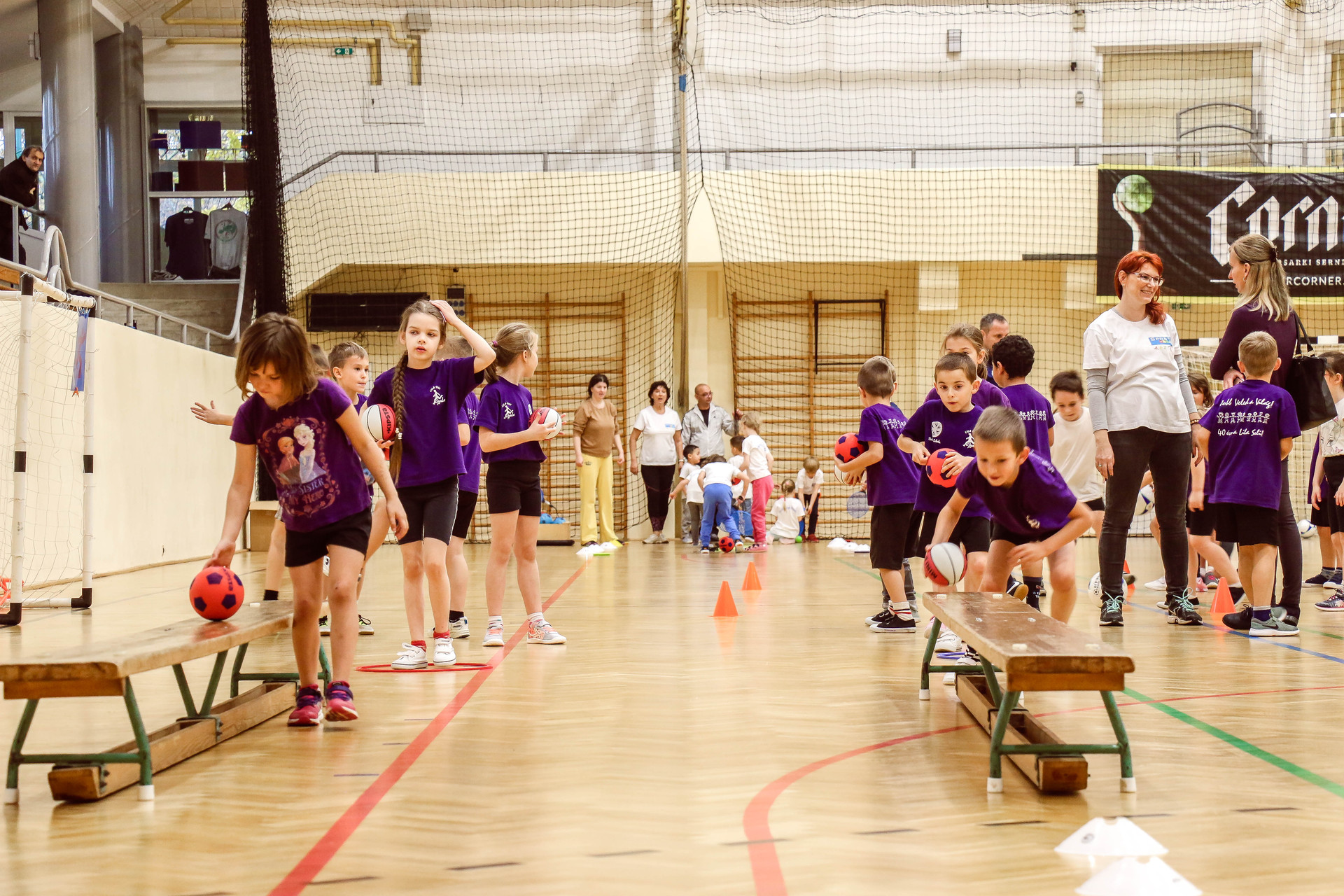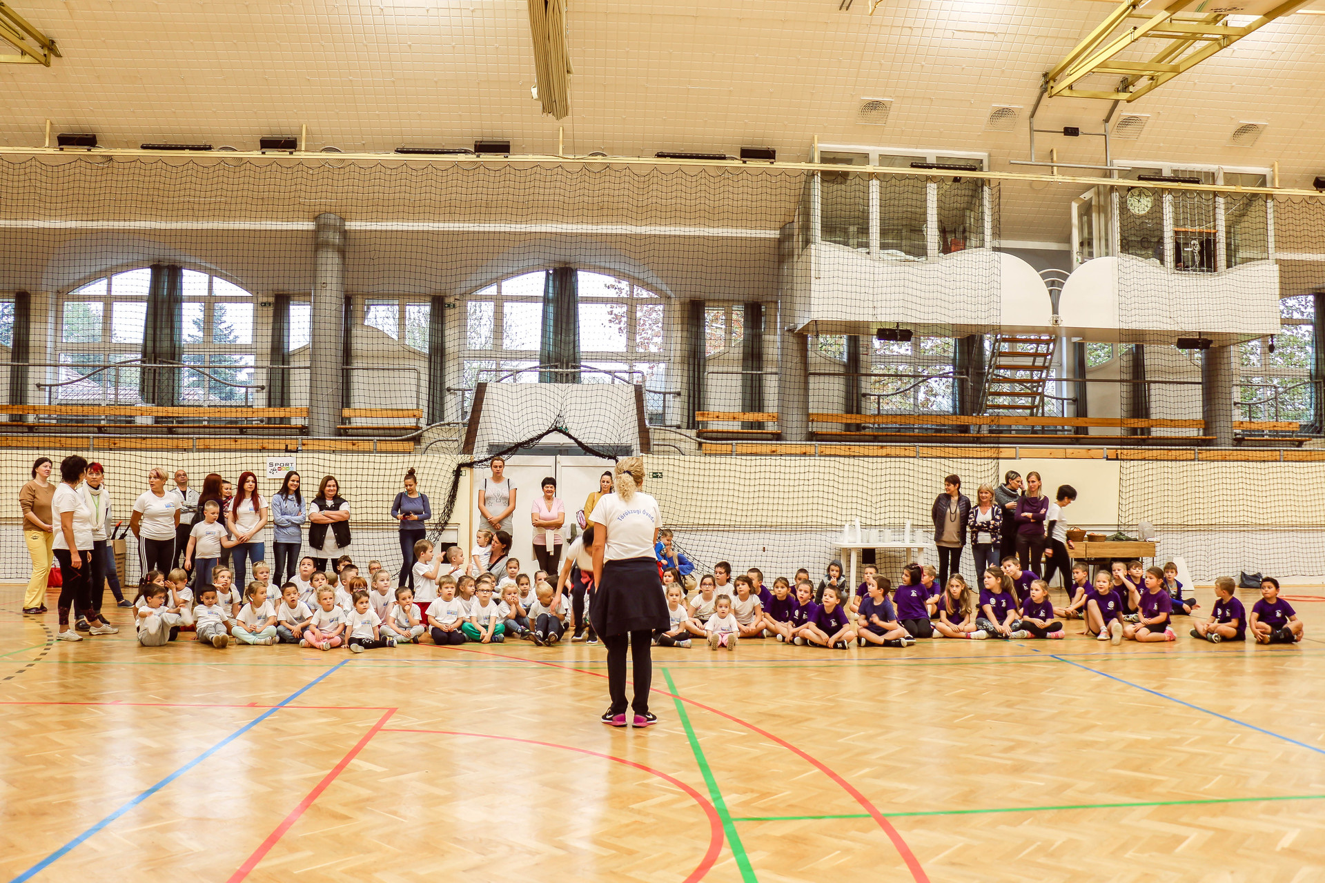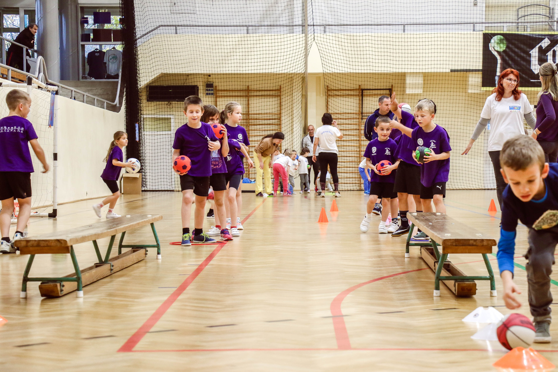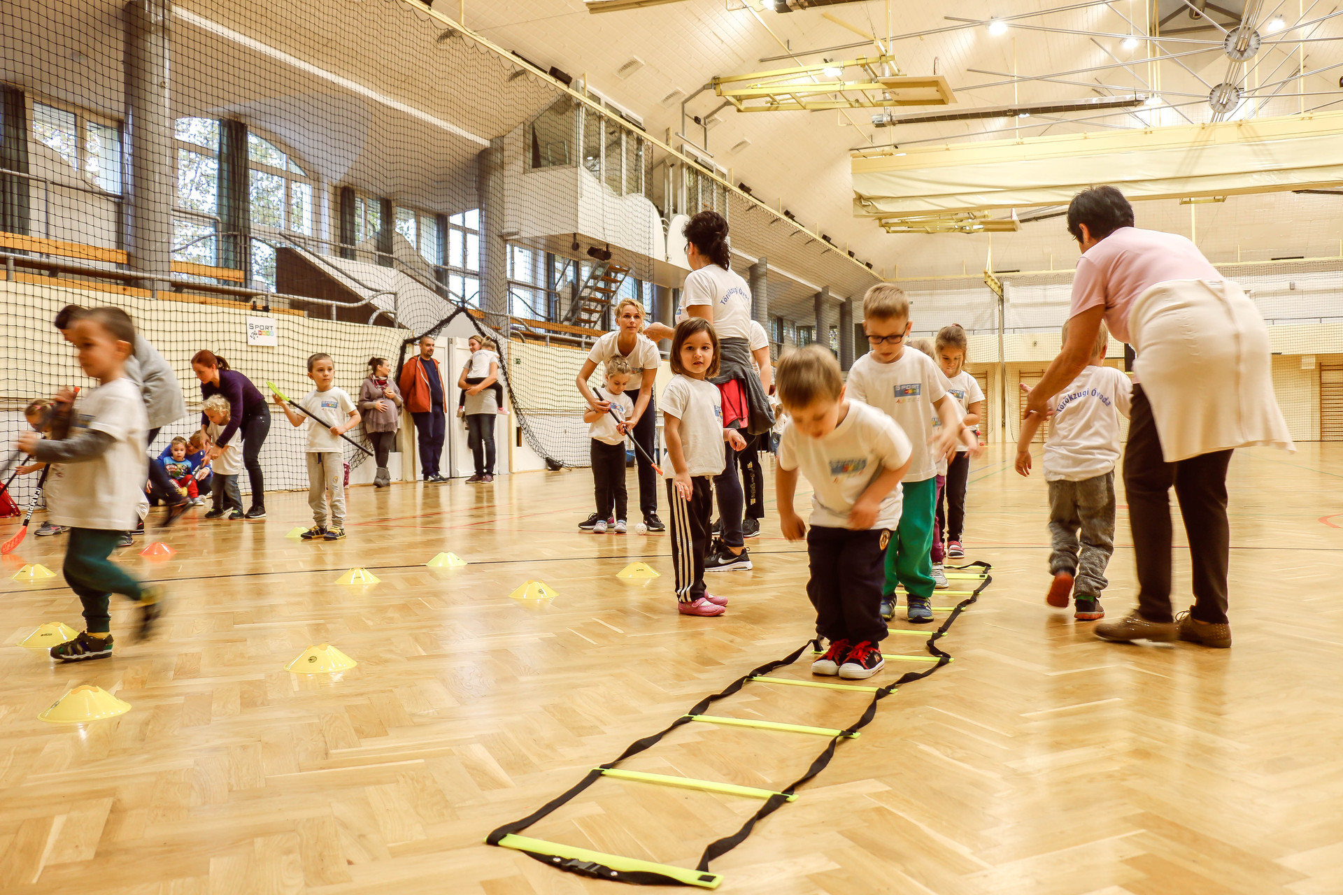 A legkisebbeket érkezés után az óvoda vezetője köszöntötte, majd egy rövid bemelegítés következett és minden apróság kipróbálhatott egy-egy labdajátékot, így lehetőségük volt kosarazni, kézilabdázni és focizni is.