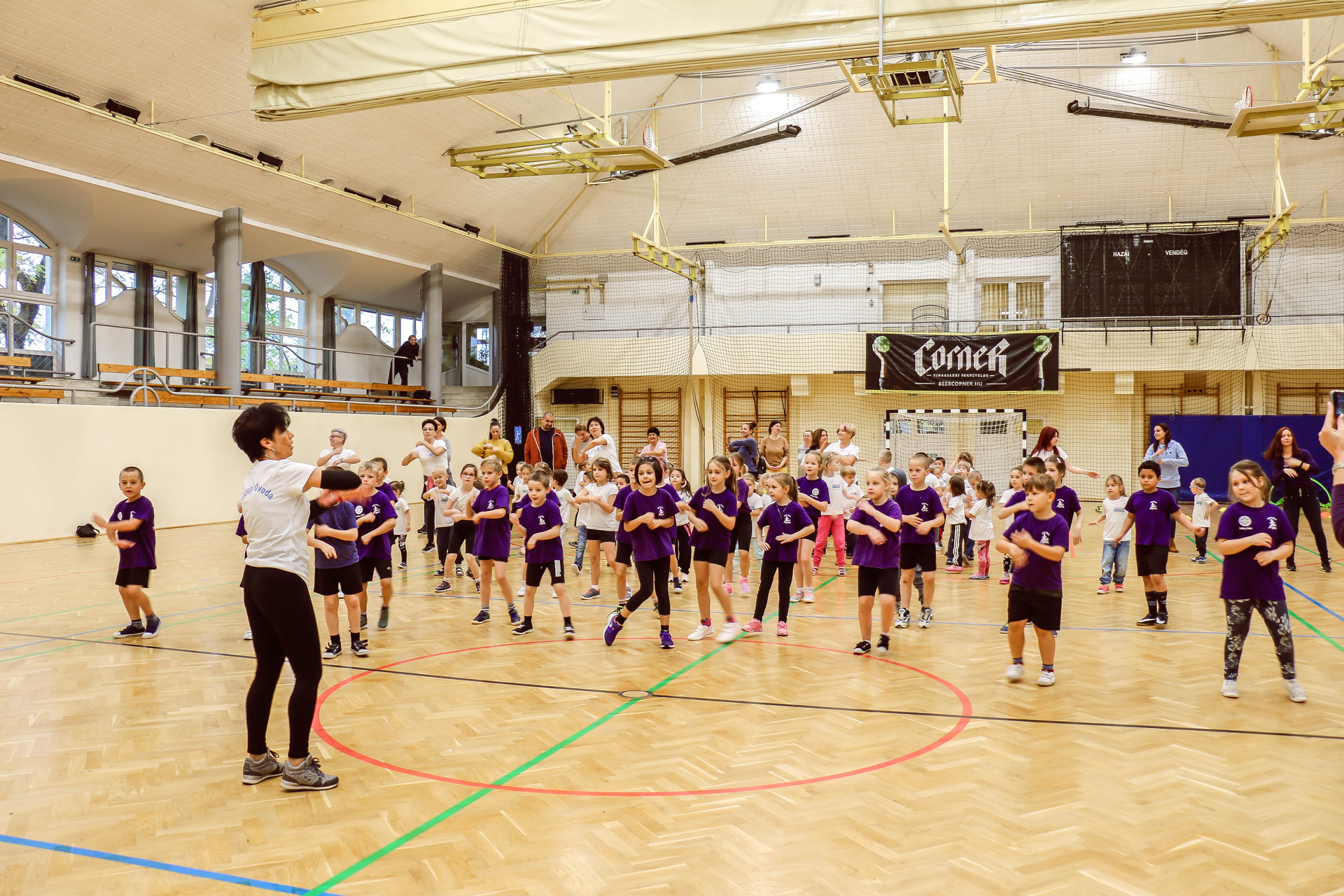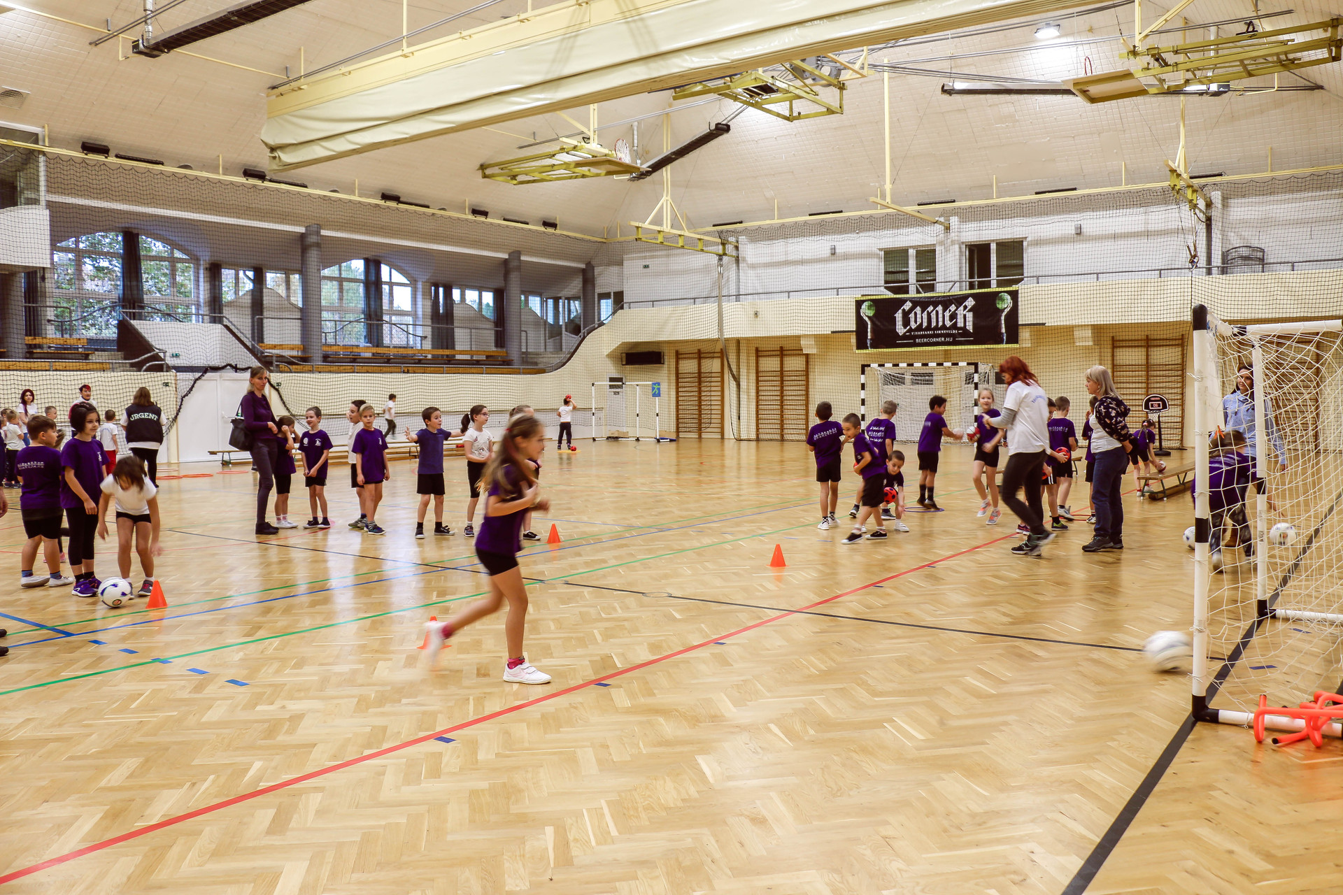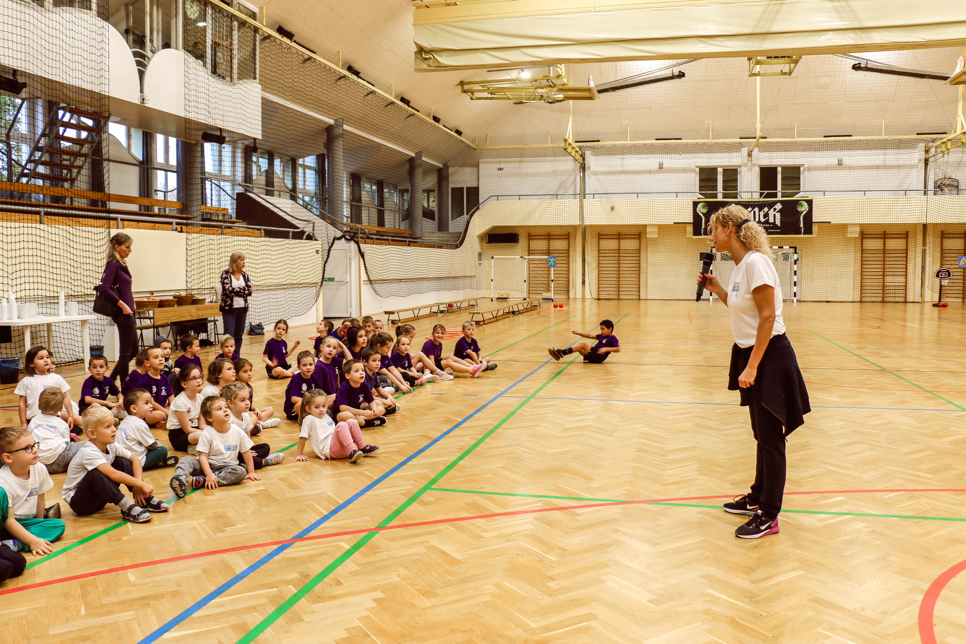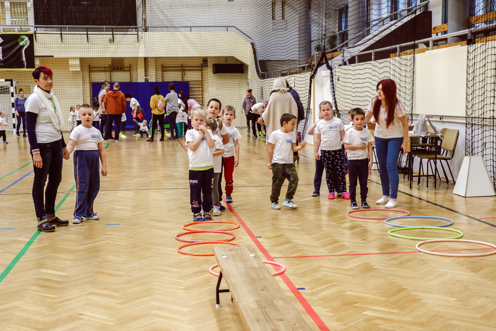 A legkisebbeket érkezés után az óvoda vezetője köszöntötte, majd egy rövid bemelegítés következett és minden apróság kipróbálhatott egy-egy labdajátékot, így lehetőségük volt kosarazni, kézilabdázni és focizni is.