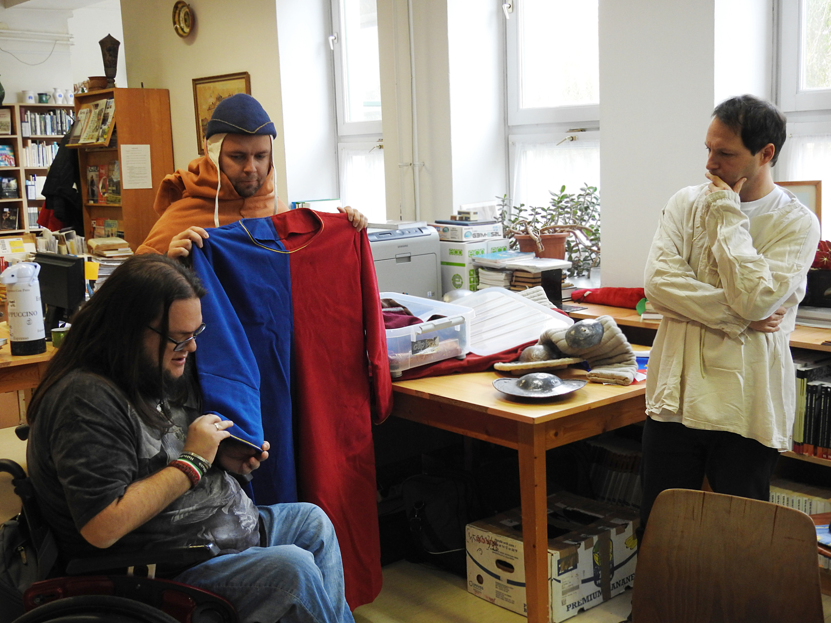 Az előadás közben körbejárt a teremben egy díszes posztó, amiből majd főnemesi öltözetet fognak készíteni, egy igazi középkori övnek a másolata, amely eredetijének az egyik övcsatját egy idős bácsi fordította ki a földből, majd megpróbálta beolvasztani, de végül megmenekült a műtárgy. A csaton egy harcjelenet látható, az övet pedig fémgombok díszítik, melyek mindegyikén egy-egy szenthez intézett latin könyörgés szerepel.