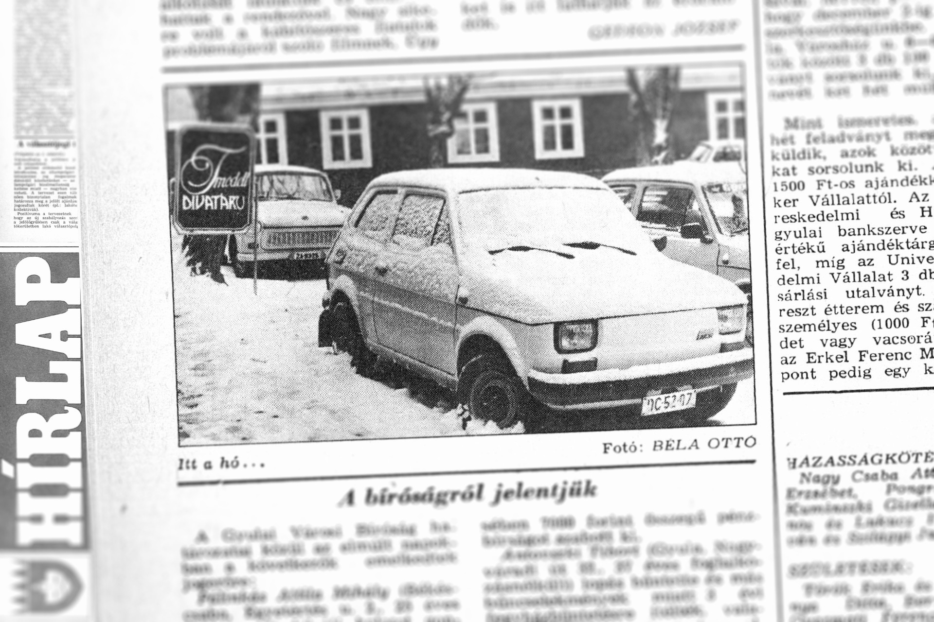 Kispolszkik és Trabantok Béla Ottó fotóján a Gyulai Hírlap 1988. november 25-én megjelent lapszámában. A kép alatt röviden csak ennyi: Itt a hó... A kép bal szélén egy T-modell reklámtábla, a többi már csak emlék, ahogy a régi kiosztású rendszámtáblák is...