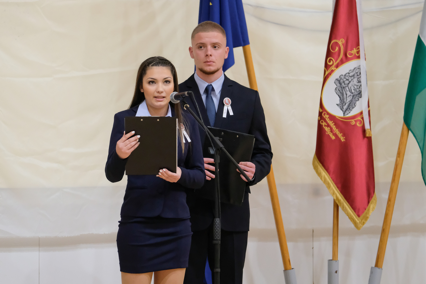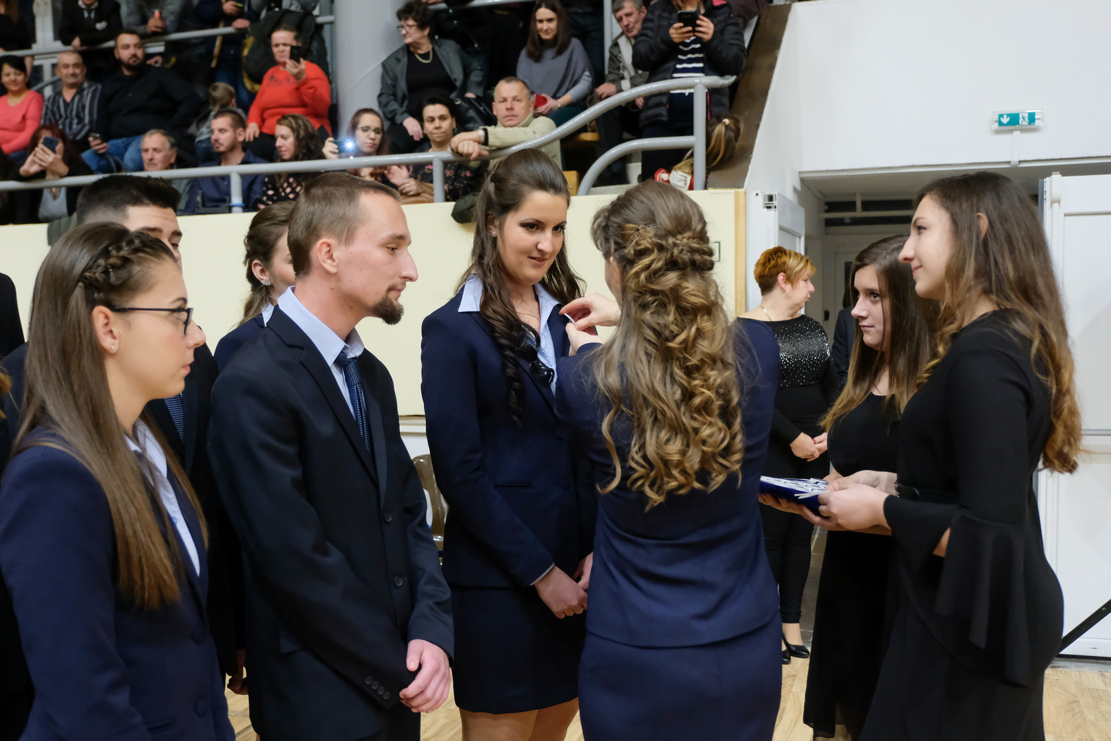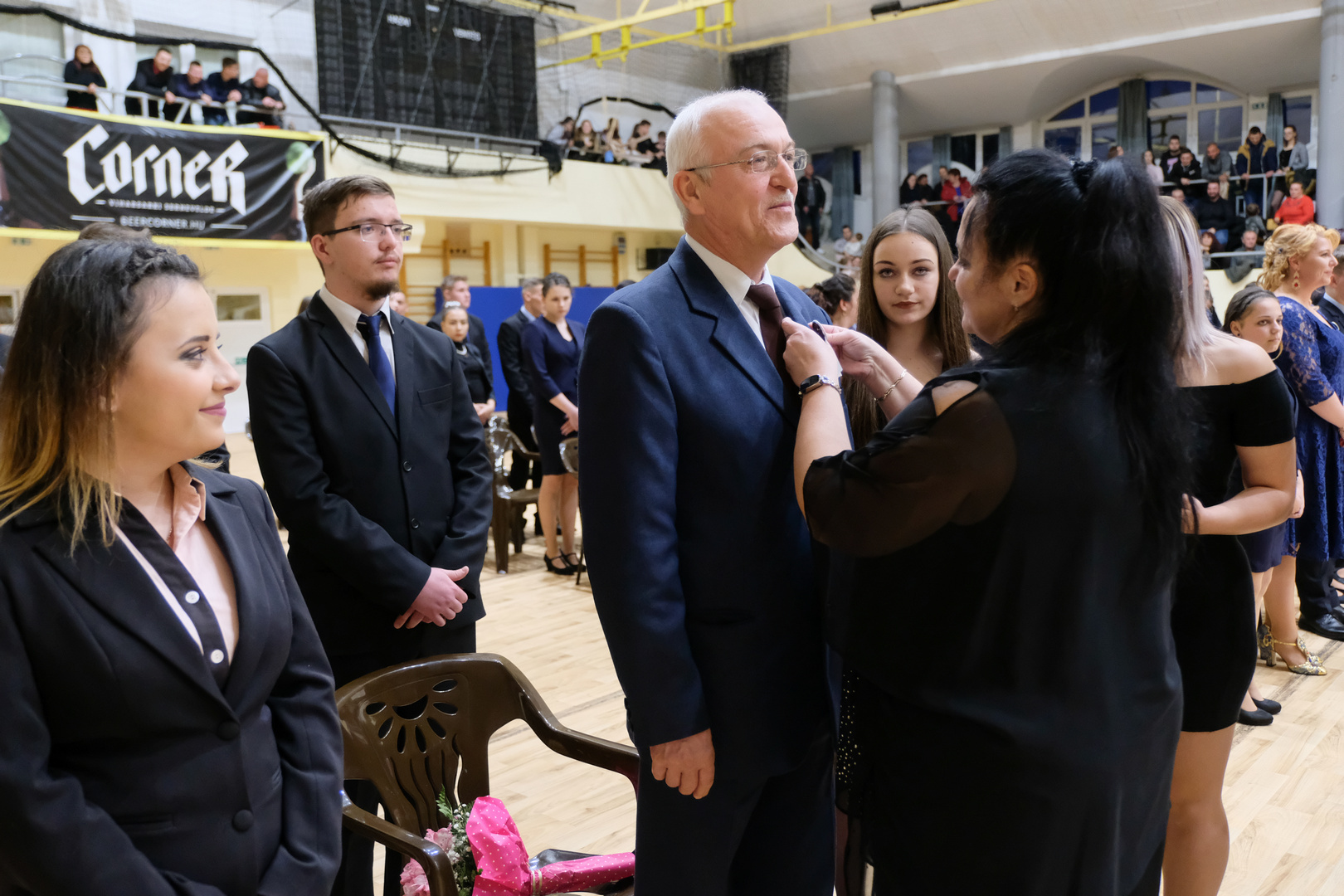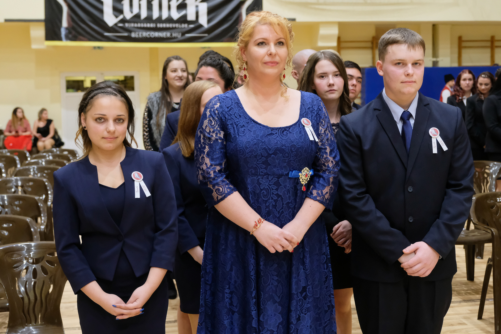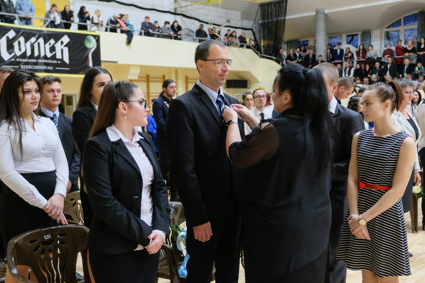 A köszöntő után az első szalagokat Czeglédiné Szappanos Anita és Kovács Zsuzsanna, a szakképzési centrum főigazgatója kapták meg, majd ketten feltűzték a szalagokat a száznegyvennégy végzősre is.