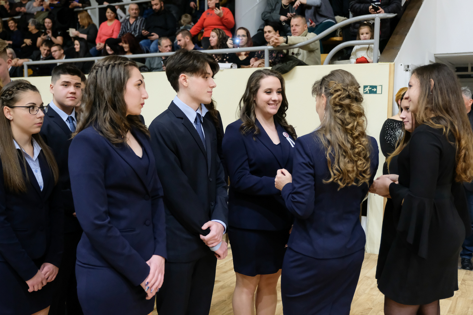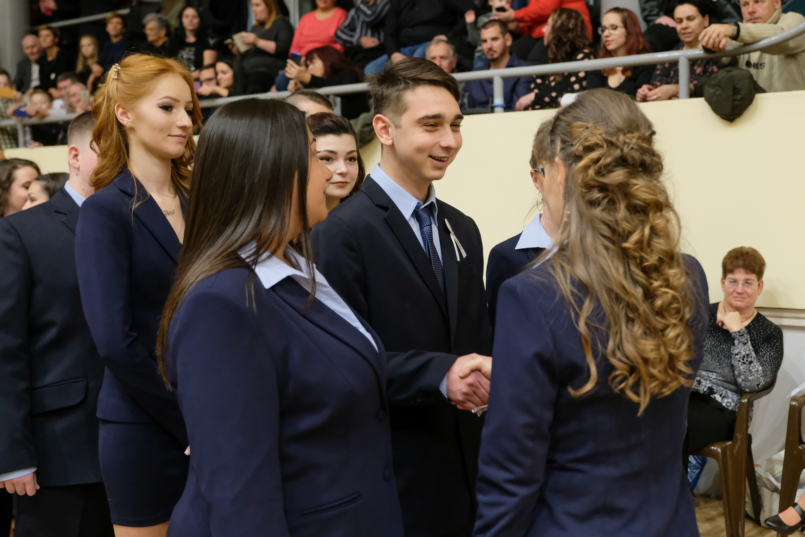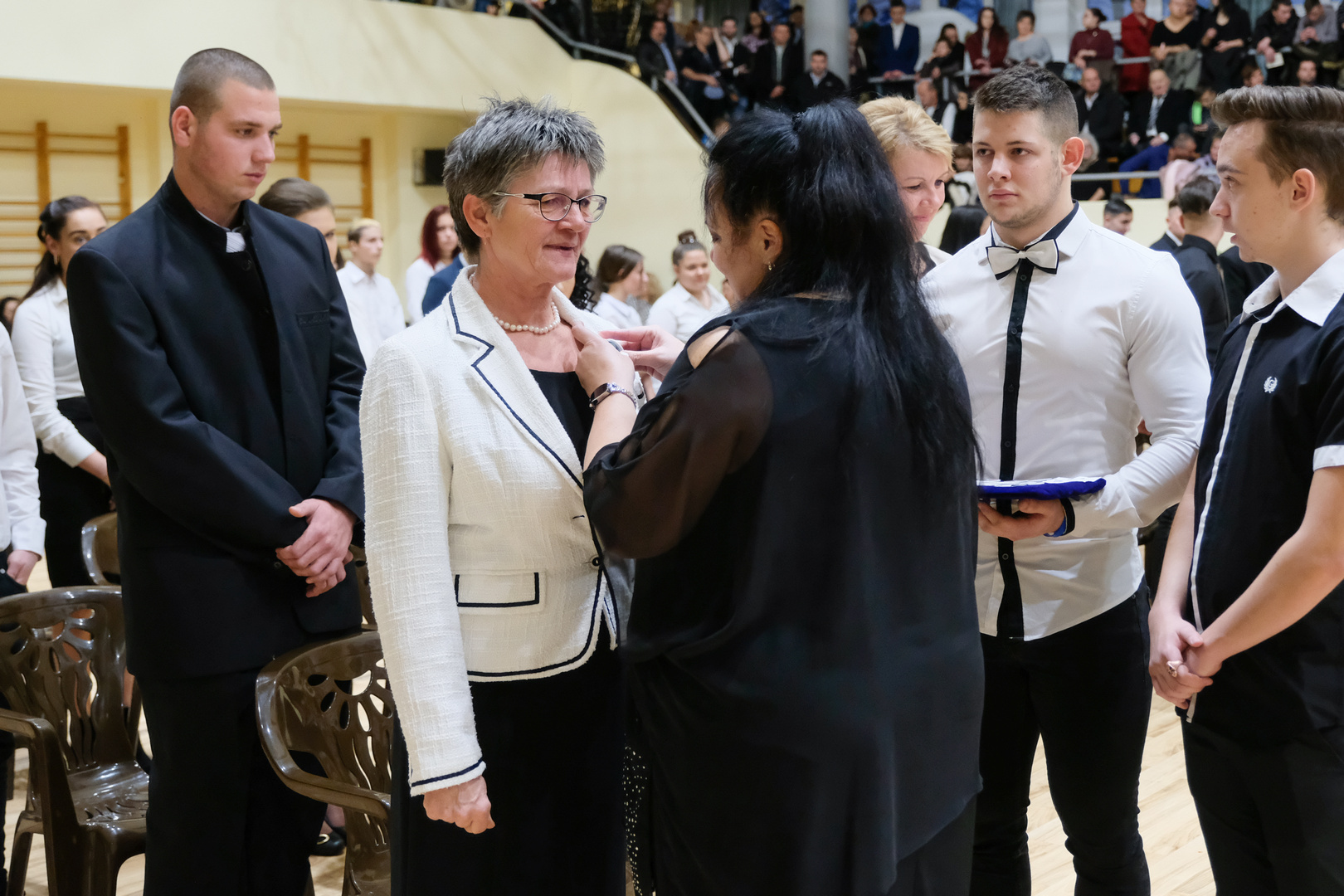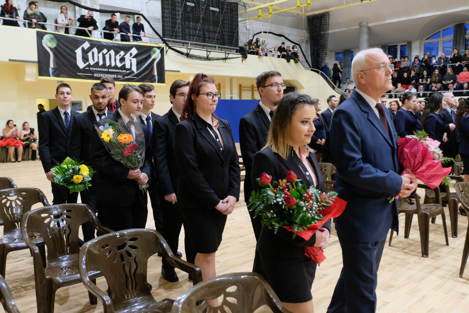 A köszöntő után az első szalagokat Czeglédiné Szappanos Anita és Kovács Zsuzsanna, a szakképzési centrum főigazgatója kapták meg, majd ketten feltűzték a szalagokat a száznegyvennégy végzősre is.