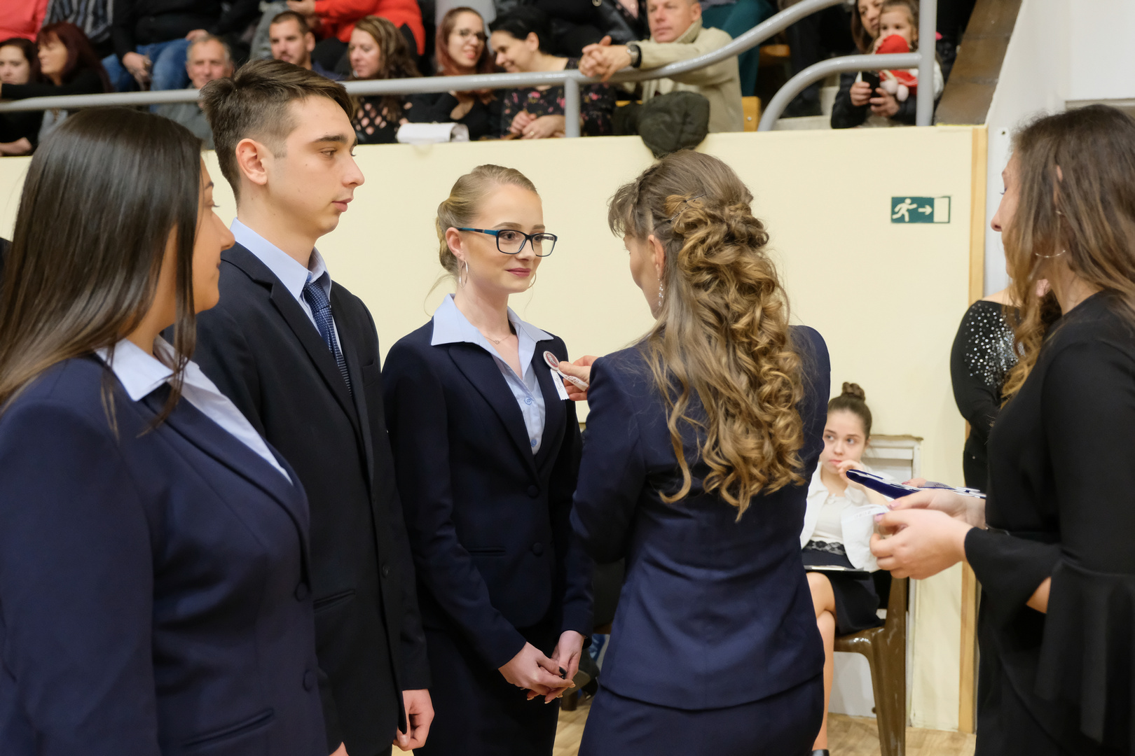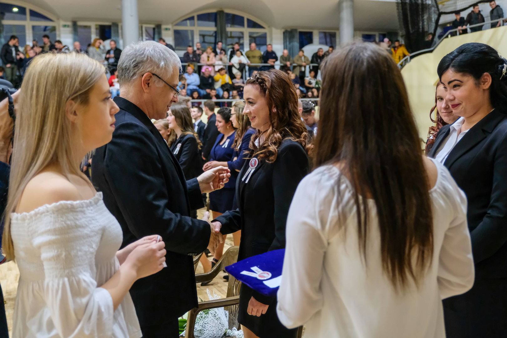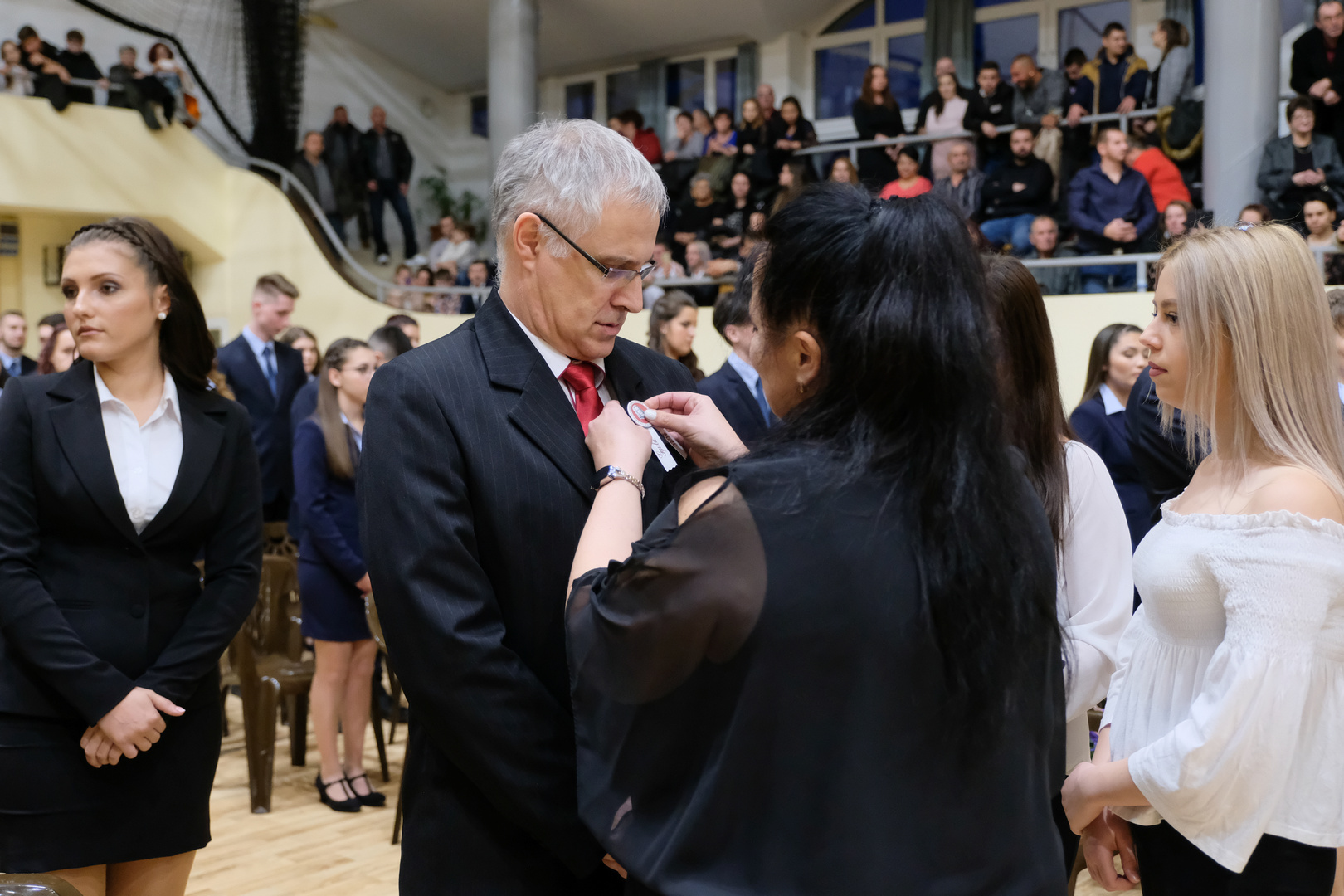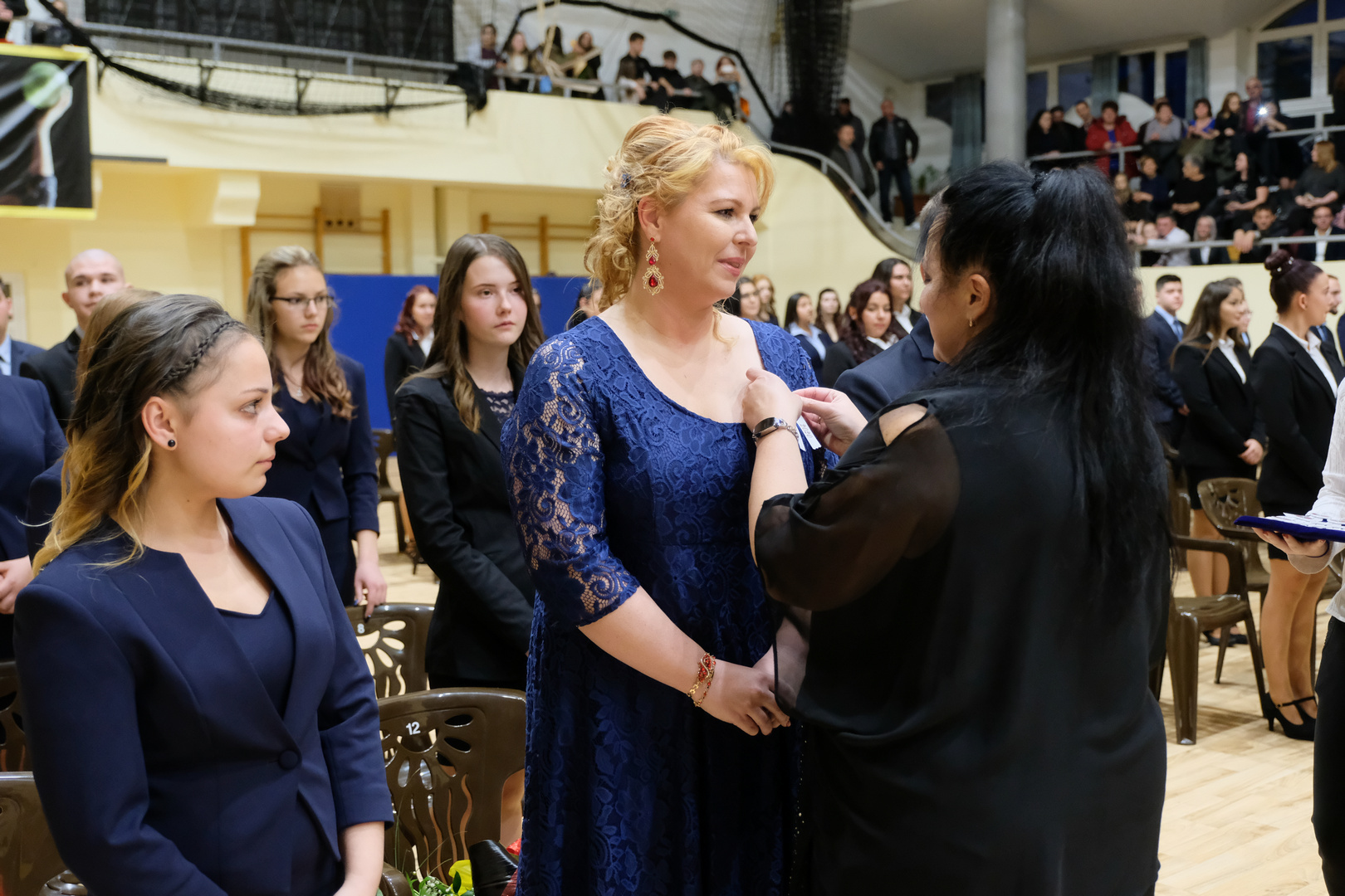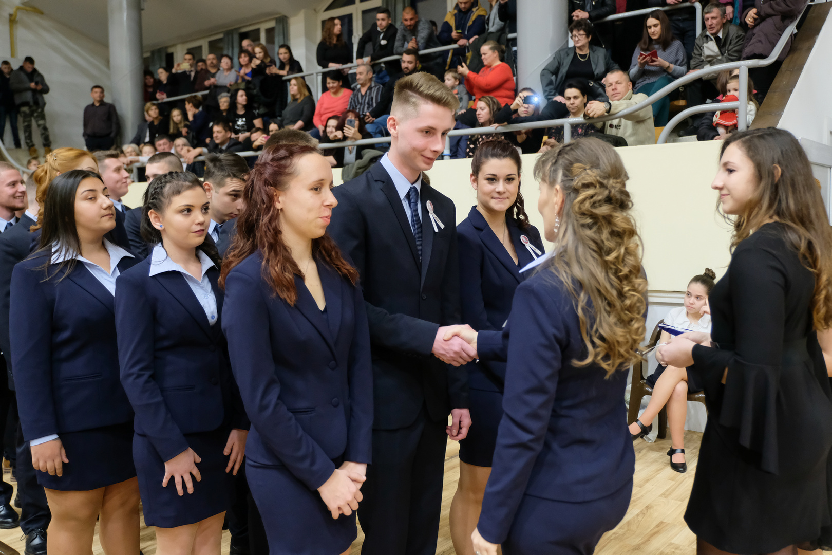 A köszöntő után az első szalagokat Czeglédiné Szappanos Anita és Kovács Zsuzsanna, a szakképzési centrum főigazgatója kapták meg, majd ketten feltűzték a szalagokat a száznegyvennégy végzősre is.