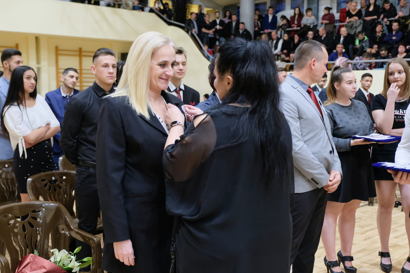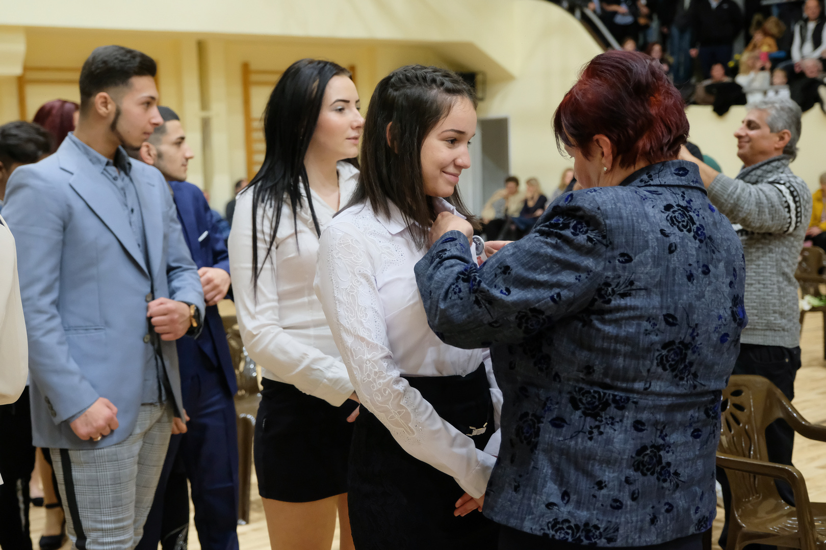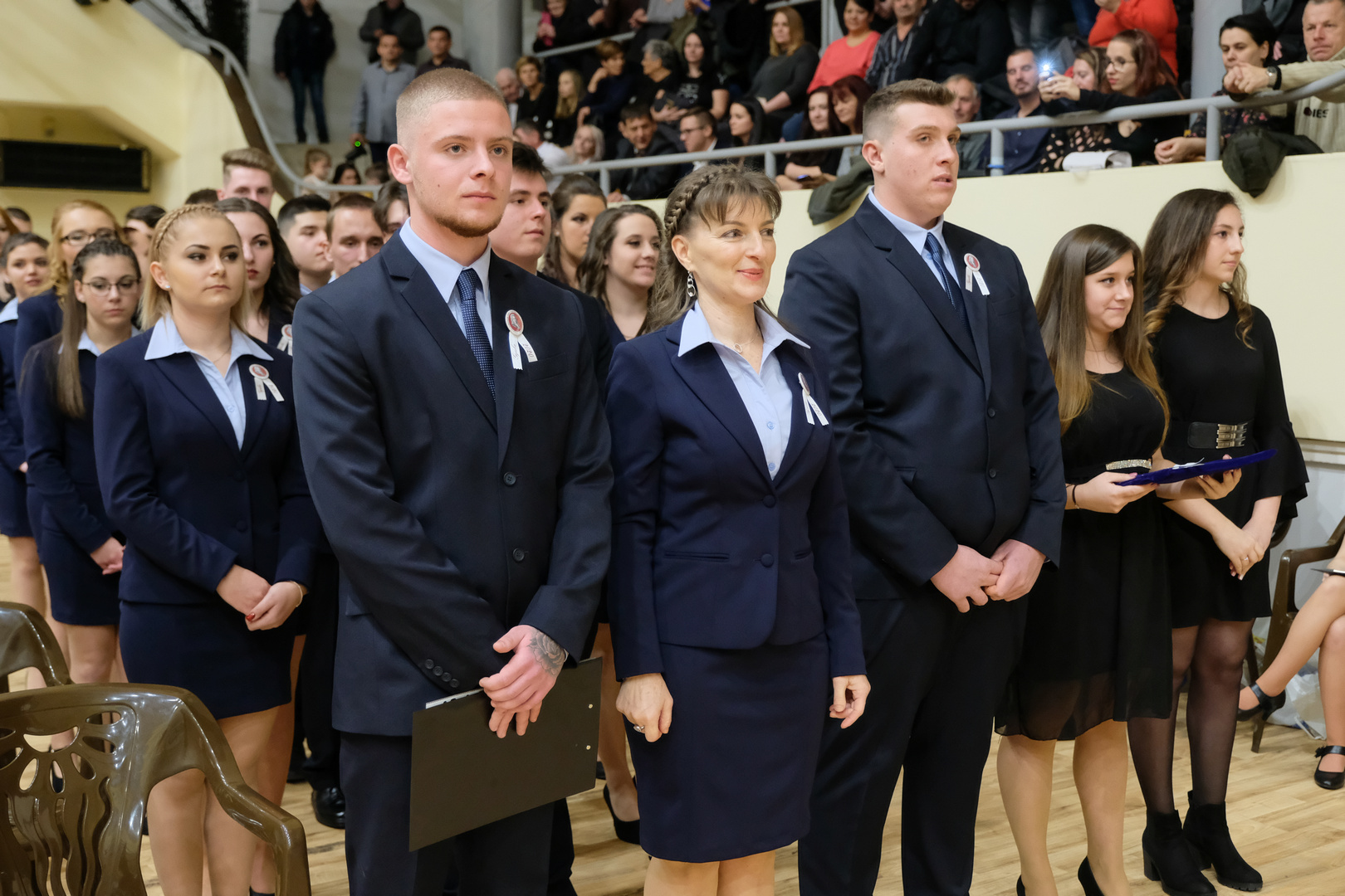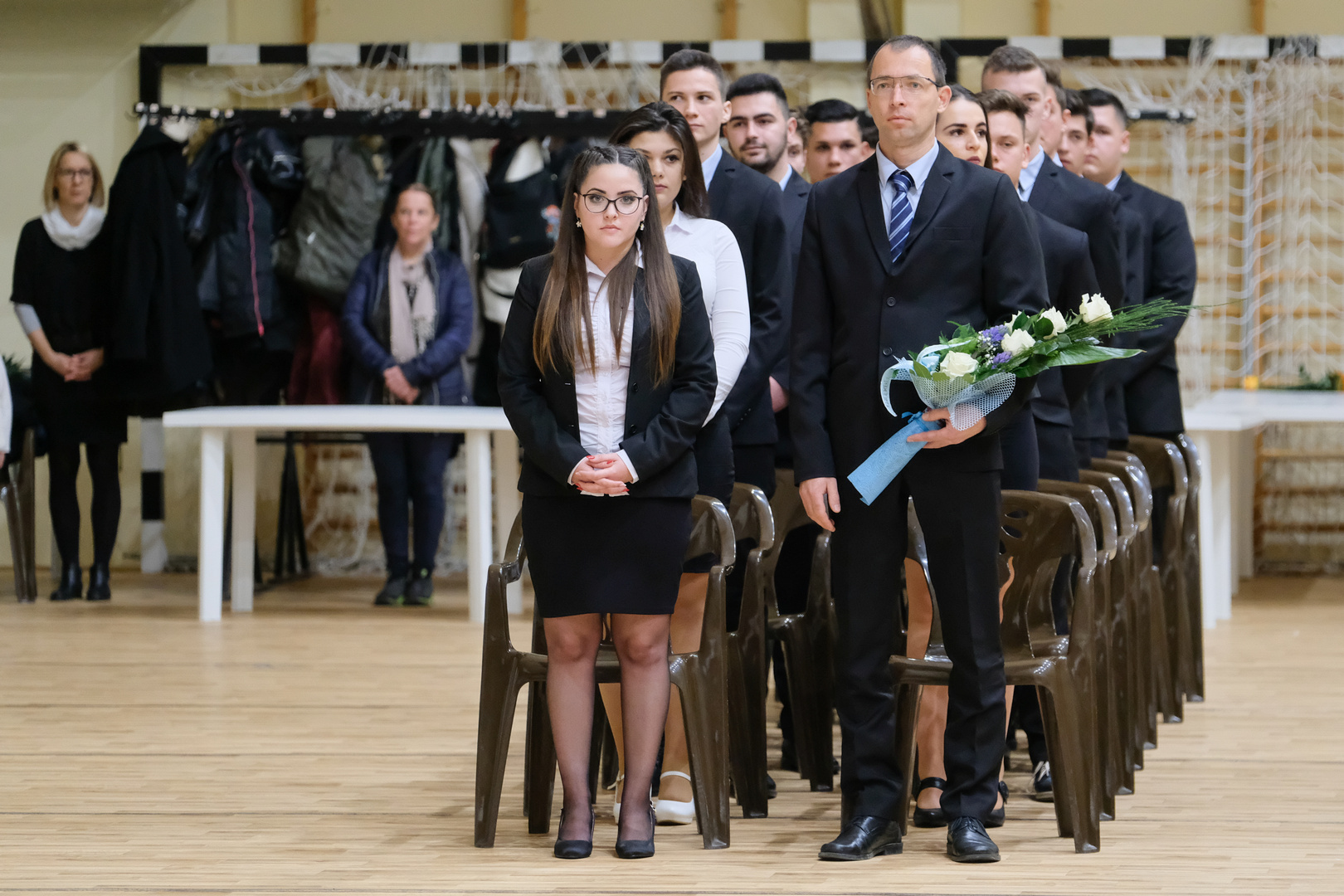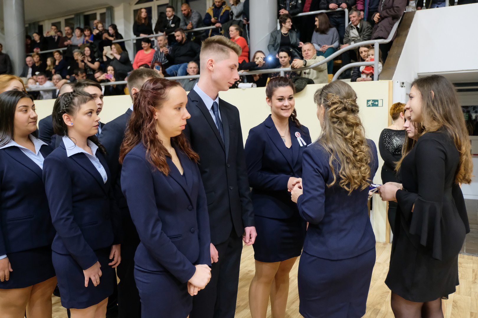 A köszöntő után az első szalagokat Czeglédiné Szappanos Anita és Kovács Zsuzsanna, a szakképzési centrum főigazgatója kapták meg, majd ketten feltűzték a szalagokat a száznegyvennégy végzősre is.
