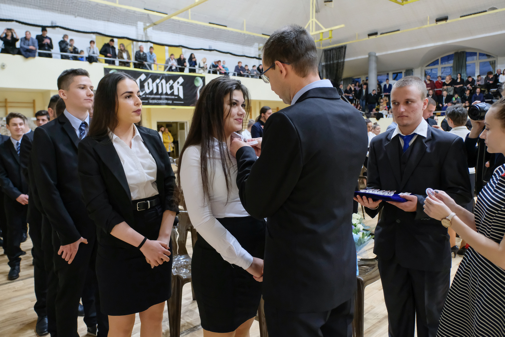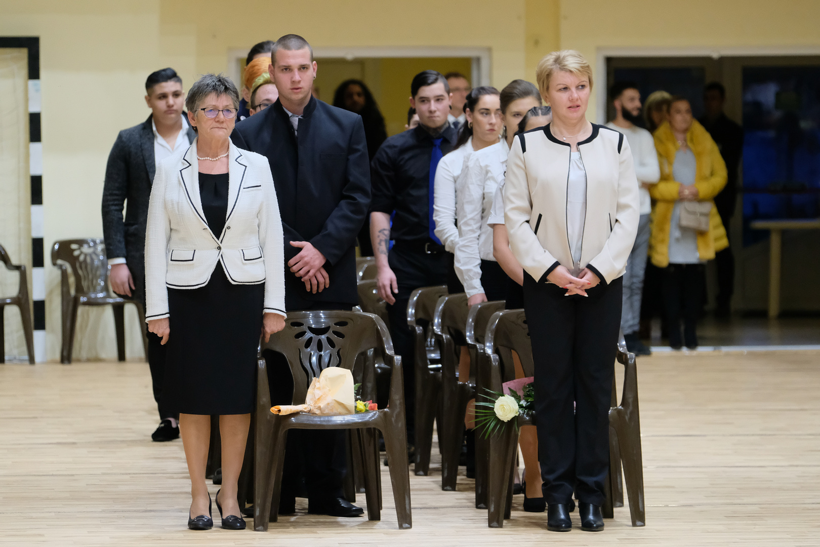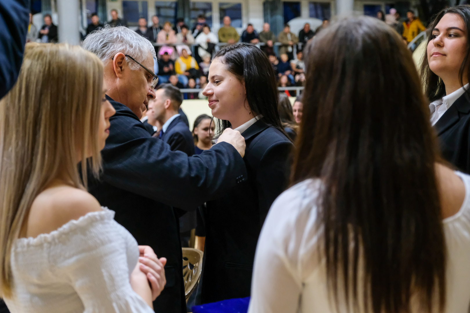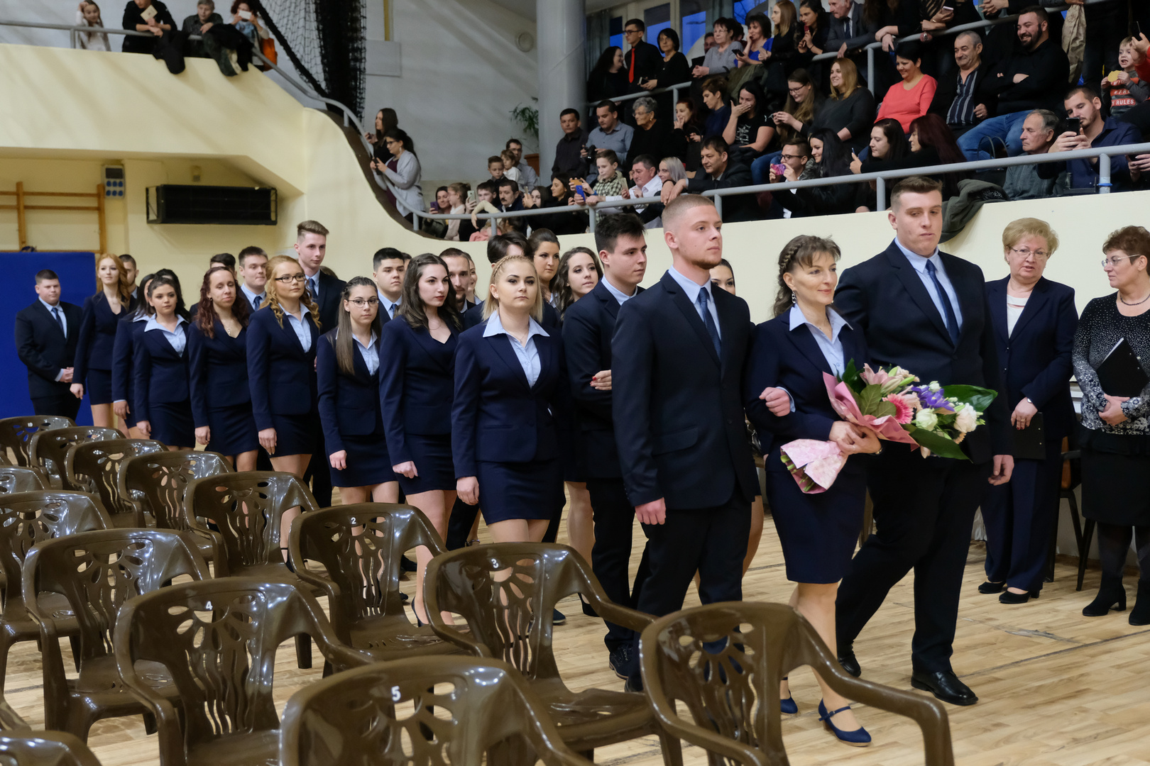 A köszöntő után az első szalagokat Czeglédiné Szappanos Anita és Kovács Zsuzsanna, a szakképzési centrum főigazgatója kapták meg, majd ketten feltűzték a szalagokat a száznegyvennégy végzősre is.
