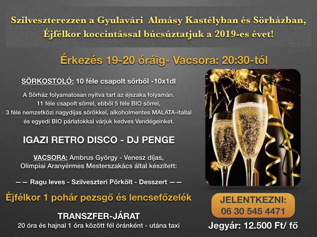 A ragulevesből, pörköltből és desszertből álló vacsorát Ambrus György mesterszakács készíti el, éjfélkor pedig lencsefőzeléket szolgálnak fel a bulizóknak. A talpalávalót DJ Penge fogja biztosítani, a helyszínre 20 órától hajnal egyig félóránként transzferjárat indul.