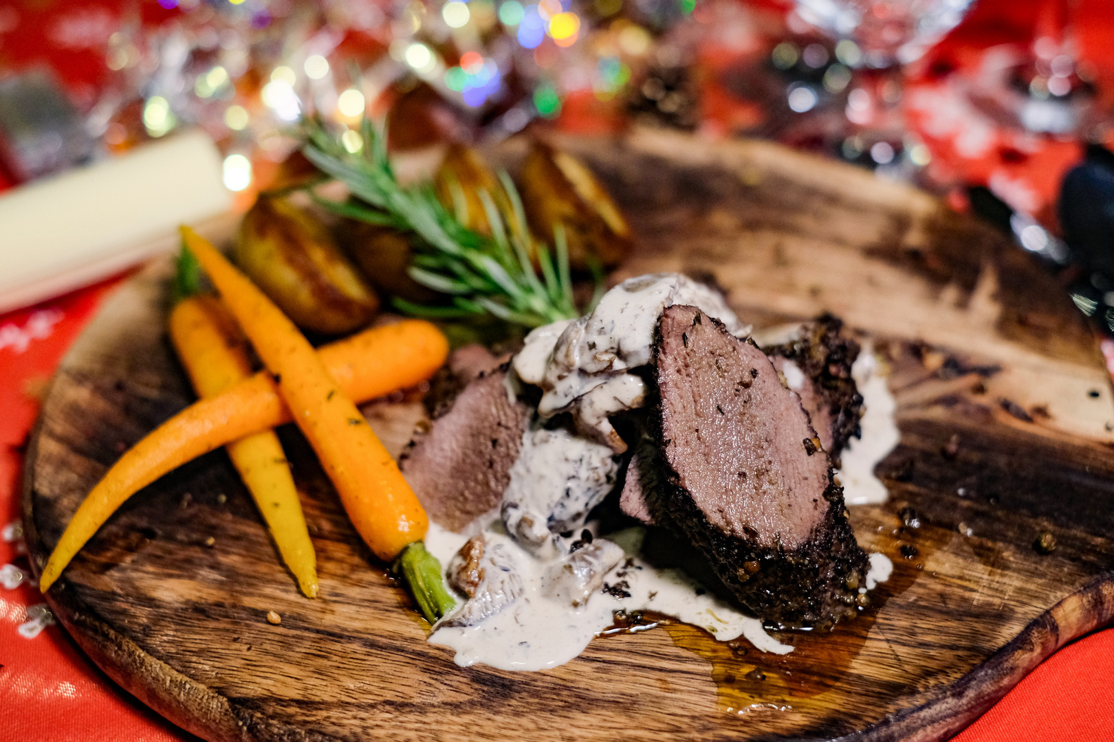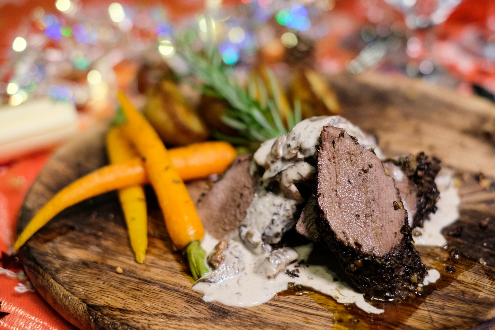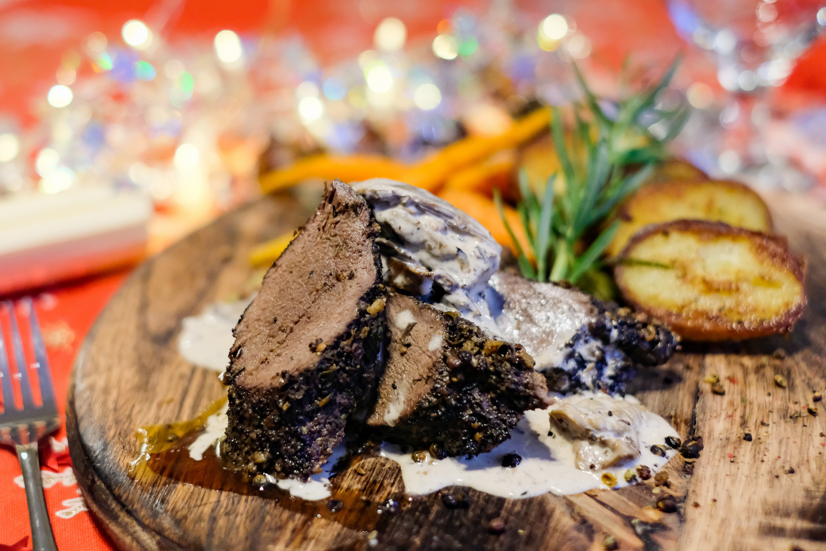 Tarka borsos, kakukkfüves kéregben sült őzgerinc erdeigomba-mártással