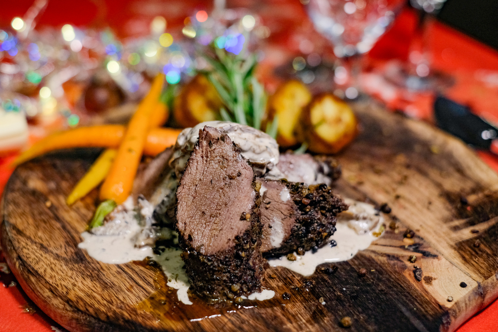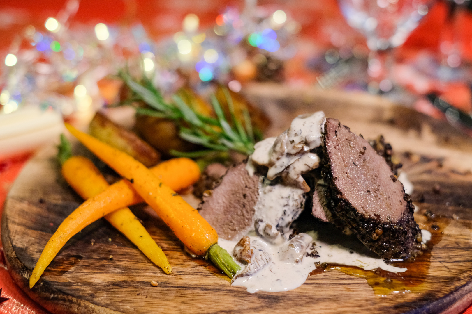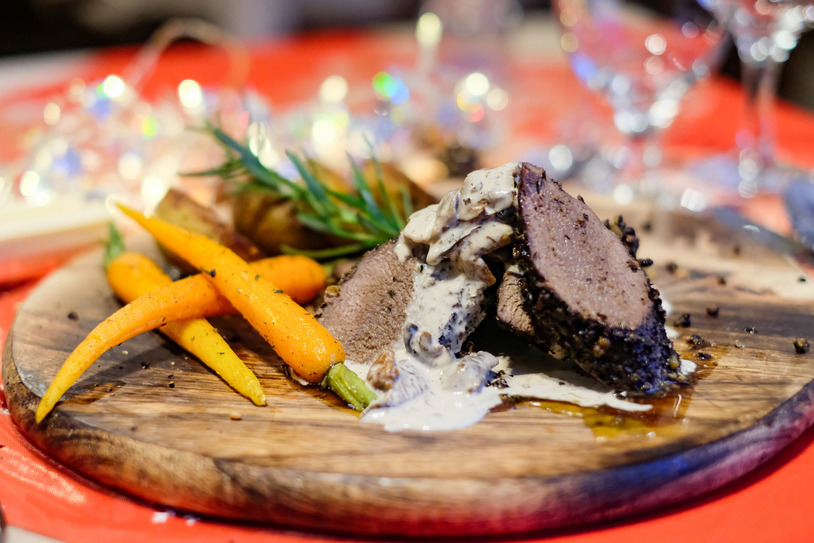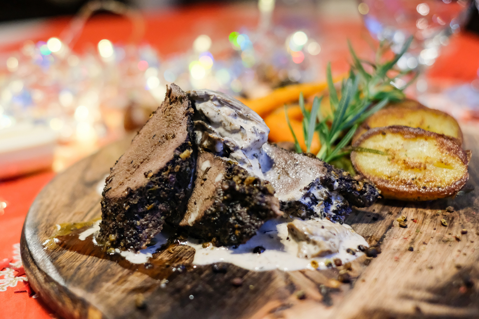 Tarka borsos, kakukkfüves kéregben sült őzgerinc erdeigomba-mártással