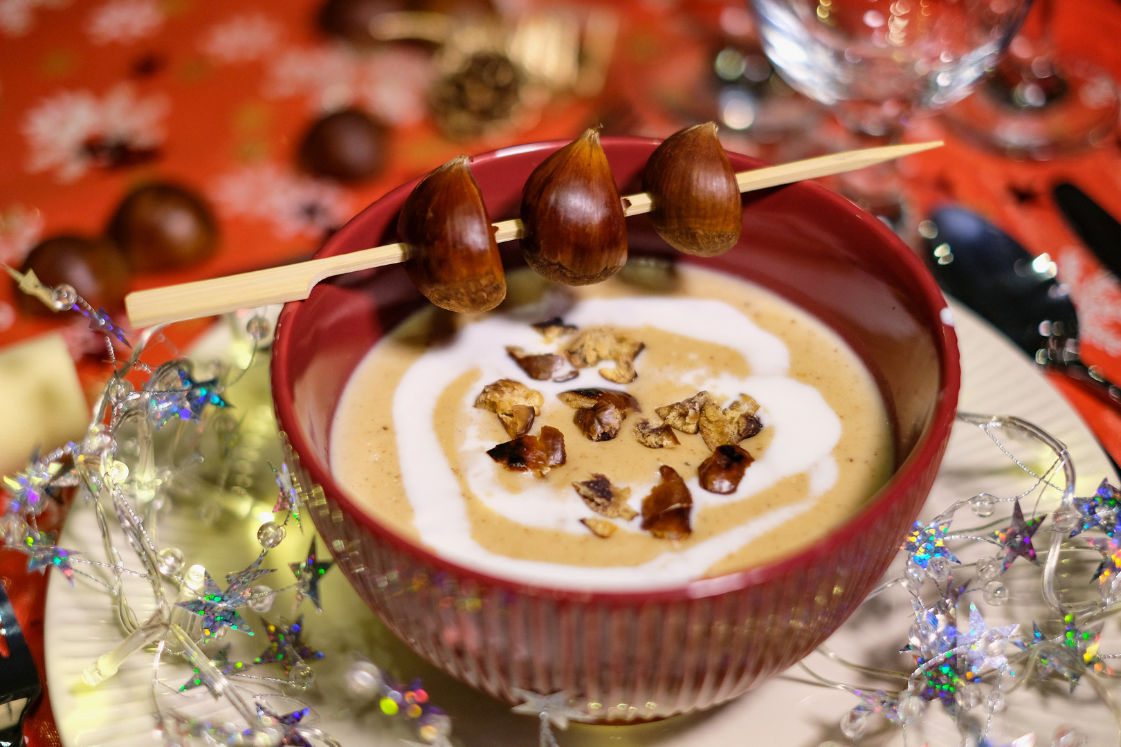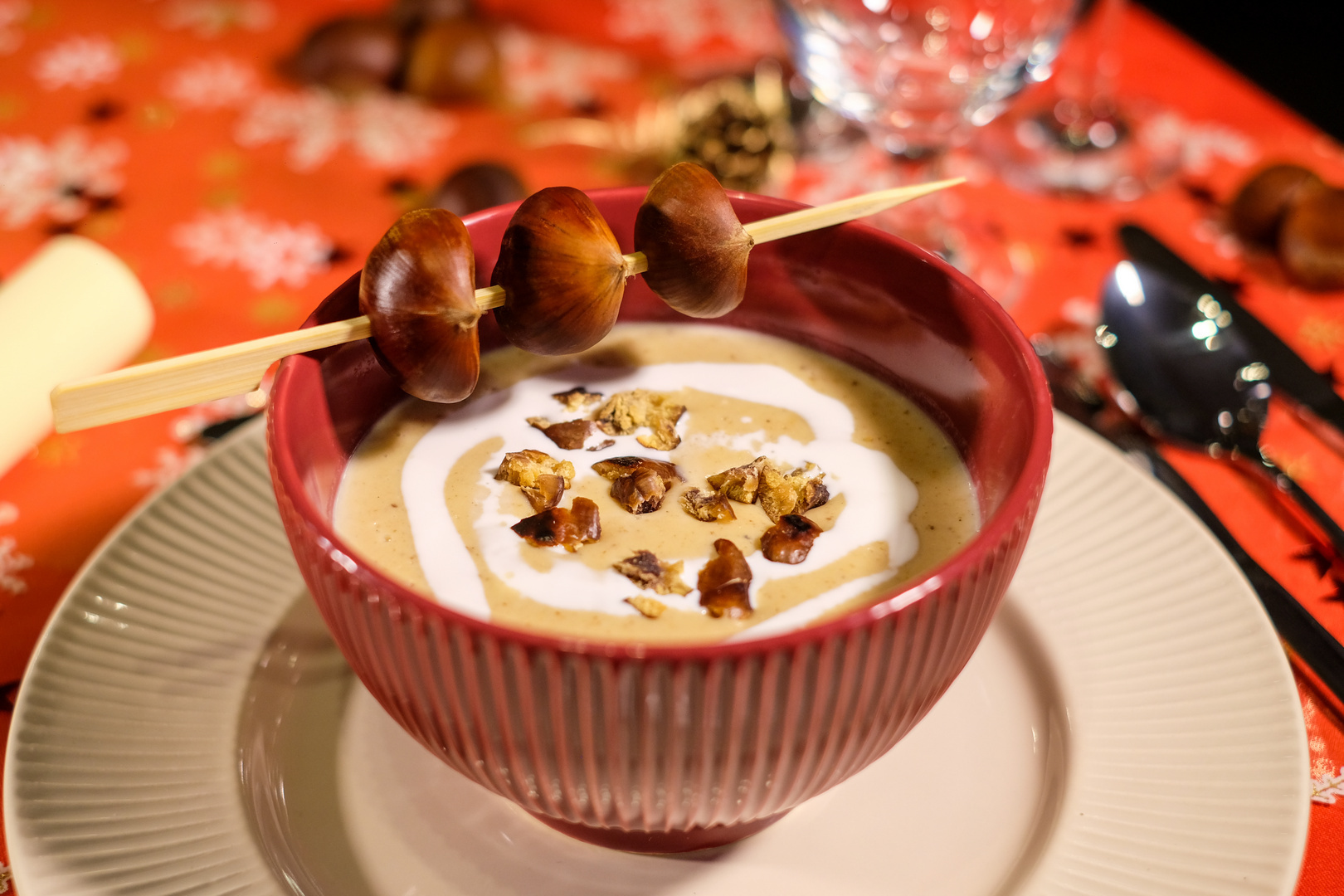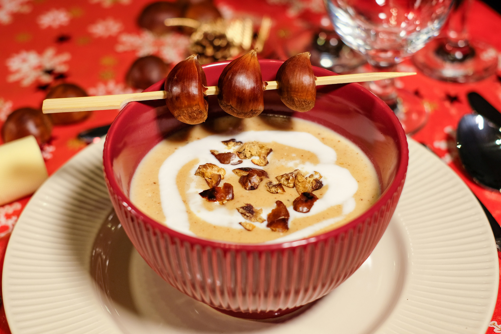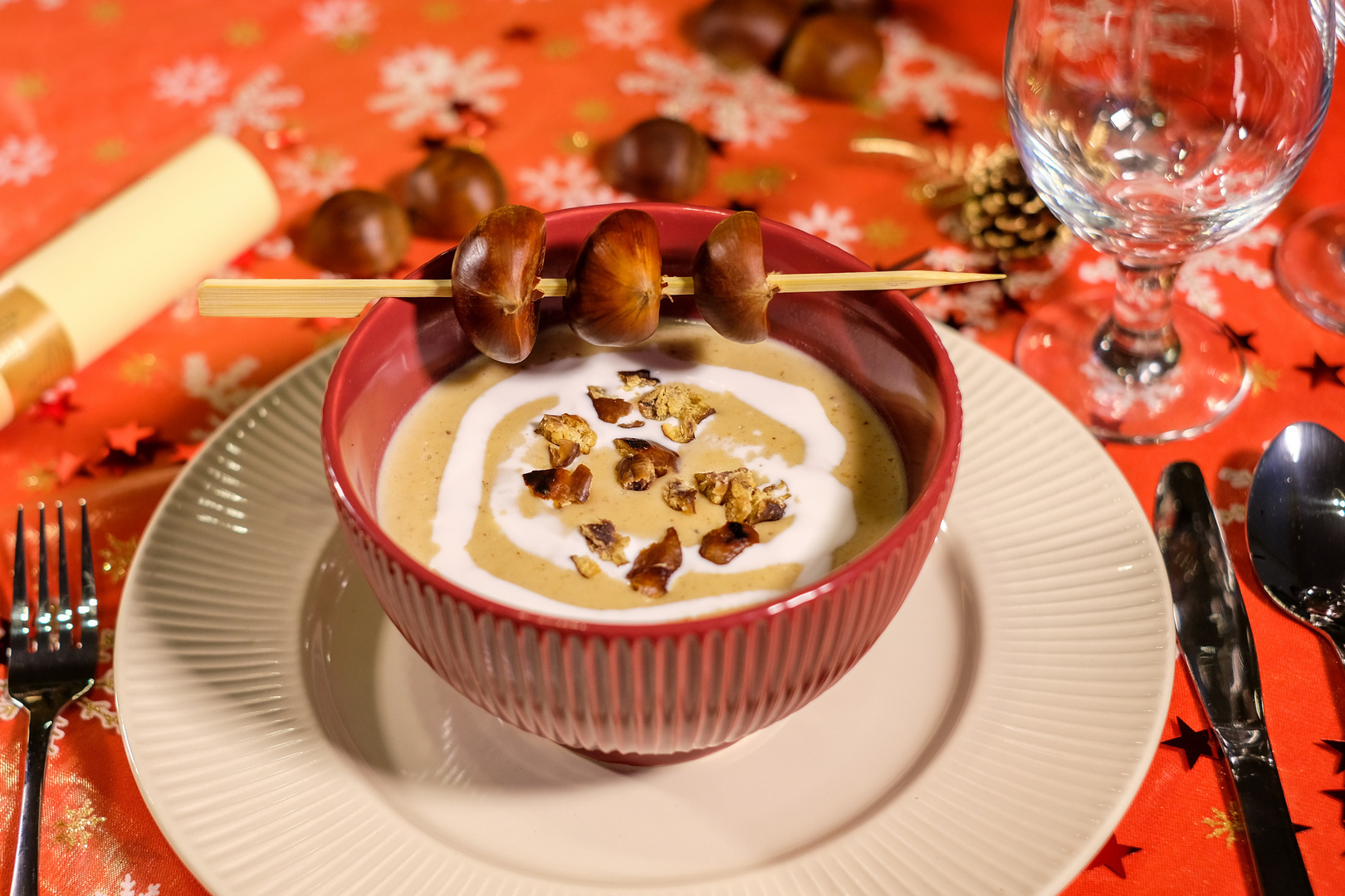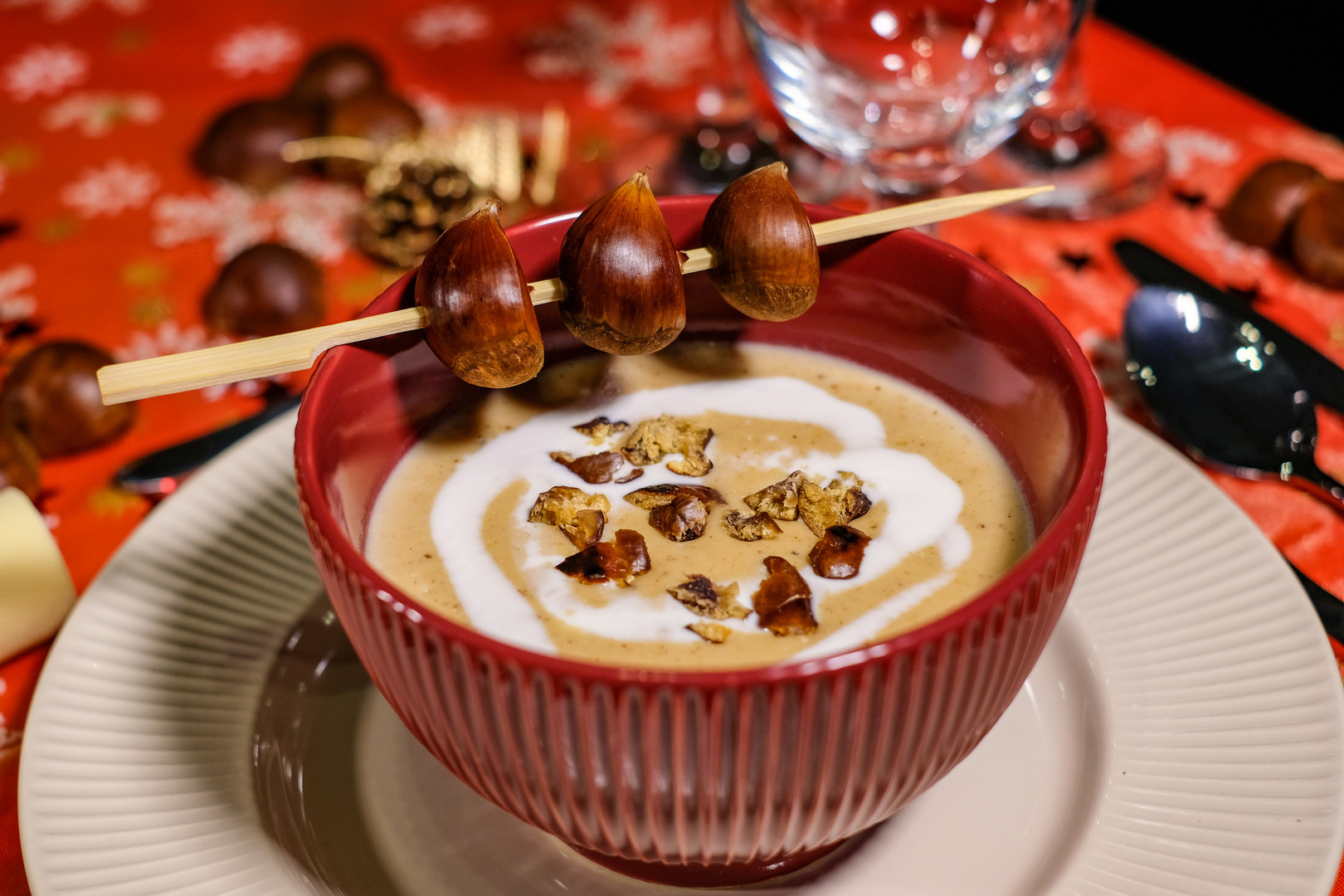 A hámozott, felkockázott almát és a főtt gesztenyét nagyjából 20 percig főzzük kb. 8 dl tejben. Főzés közben hozzáadjuk a cukrot és a rumaromát. 20 perc után összeturmixoljuk, majd visszatesszük a lángra. Közben a maradék tejjel kikeverjük a pudingport, és hozzáadjuk a leveshez a főzőtejszínnel együtt. Folyamatos kavarás mellett felforraljuk, majd egy percig még a tűzön hagyjuk.