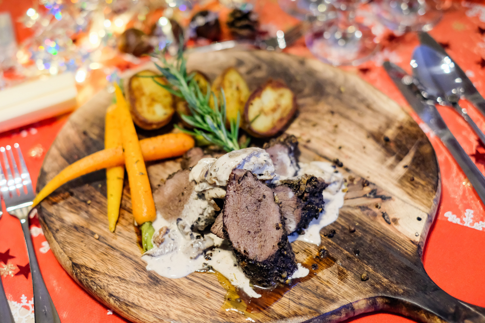 A húsokat meglocsoljuk olívaolajjal, majd sózzuk, borsozzuk. Egyesével betekerjük frissen tartó fóliába, majd 48 óráig hűtőben pihentetjük őket. A háromféle borsot durvára őröljük vagy törjük, és a húsokat beleforgatjuk, majd olajjal felhevített serpenyőbe tesszük, és kérget sütünk rájuk. Ezután 160 fokra melegített sütőbe helyezzük őket egy kis alaplével, és 60–80 percig sütjük. Közben 10 percenként meglocsolgatjuk. A sárgarépát és a burgonyát (héjában) enyhén sós vízben puhára főzzük. A répát a kakukkfűvel, a burgonyát a rozmaringgal vajon megpirítjuk. Ízlés szerint sót és borsot adunk hozzá. Az erdeigomba-mártáshoz kevés olívaolajon megdinszteljük a gombakeveréket, amit sóval, borssal ízesítünk. Kis idő elteltével hozzáadunk 1 dl száraz fehérbort, és 1-2 percig együtt forraljuk őket, ezután hozzáadjuk az alaplevet és a főzőtejszínt is.
