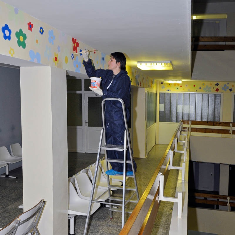 – Korábban volt egy olyan elképzelés, hogy esetleg gyerekszakrendelések is helyet kapnak majd az épületben, s felkértek, készítsünk dekorációt, amely barátságosabbá teheti az apróságok számára a környezetet – folytatta. Később a gyerekszakrendelések mégsem kerültek az intézetbe, de az alkotó már tovább is gondolta a dekoráció lehetőségét: ha nem a gyerekek, akkor a felnőttek számára szeretné kellemesebbé, vidámabbá tenni a környezetet. Esztendőknek kellett eltelniük, hogy az elképzelés valósággá válhasson: az alkotó a kórház vezetőségének támogatása mellett tavaly december elején kezdhetett hozzá a munkához, melynek finanszírozásához sikerült szponzorokat is találnia. - Két szponzor támogatja a munkámat, emelte ki Focht Anita, az egyik a bátyám, a másik pedig a Caparol Hungária Kft. A festékgyártó céggel a bátyám segítségével kerültem kapcsolatba, s ahogy meghallották, mit is szeretnék csinálni, azonnal igent mondtak. Nagyon örülök, hogy sikerült, és teljesülhet a vágyam, mert folyton keresve az új kihívásokat, nemcsak a végeredmény tölt el örömmel, hanem roppantul élvezem magát az utat is, amíg odáig eljutok. Rengeteg energiával tölt fel.