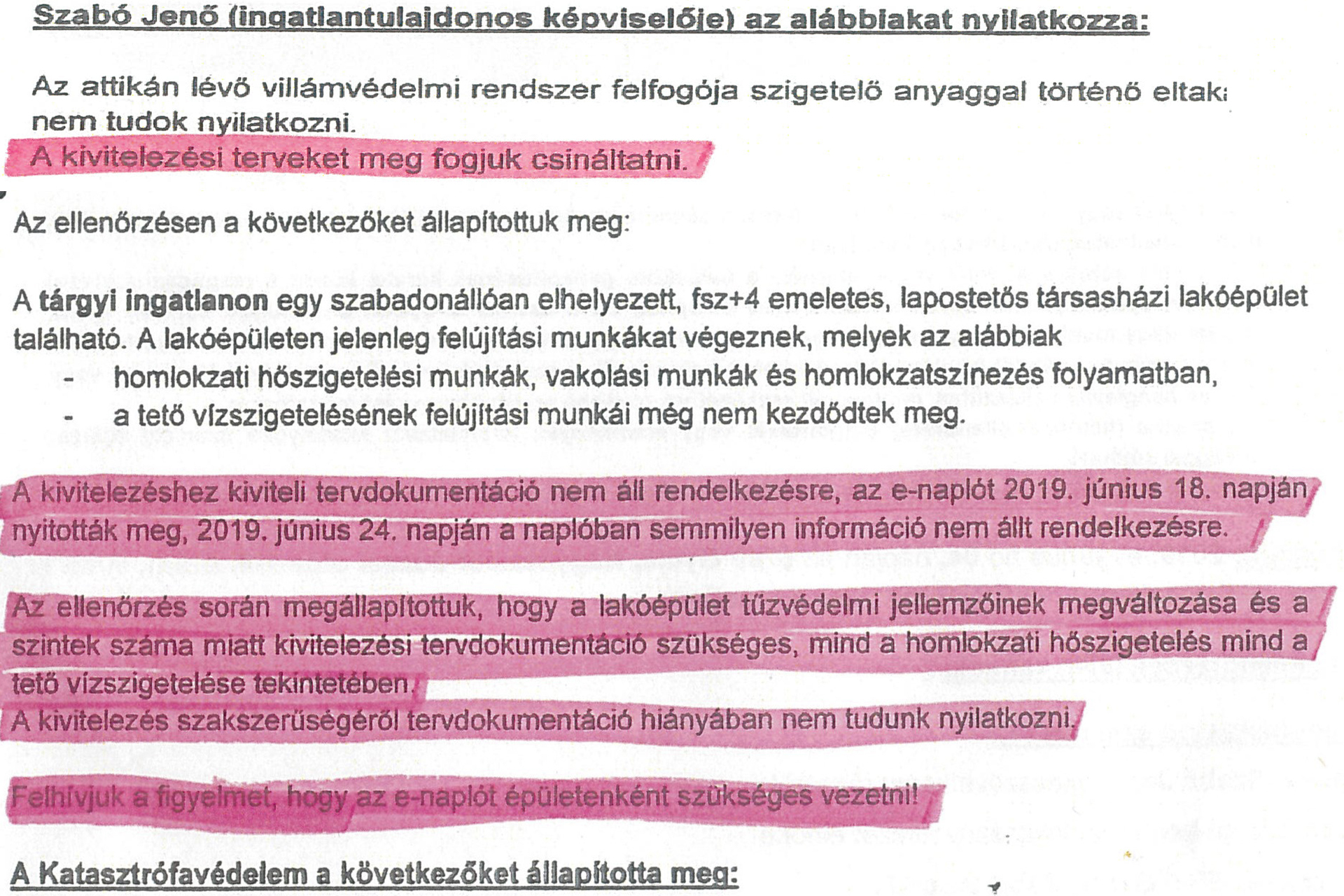- Az ellenőrzésen az is megállapításra került hogy "a lakóépület tűzvédelmi jellemzőinek megváltozása és a szintek száma miatt kivitelezési tervdokumentáció szükséges, MIND A HOMLOKZATI HŐSZIGETELÉS, MIND A TETŐ VÍZSZIGETELÉSE TEKINTETÉBEN."