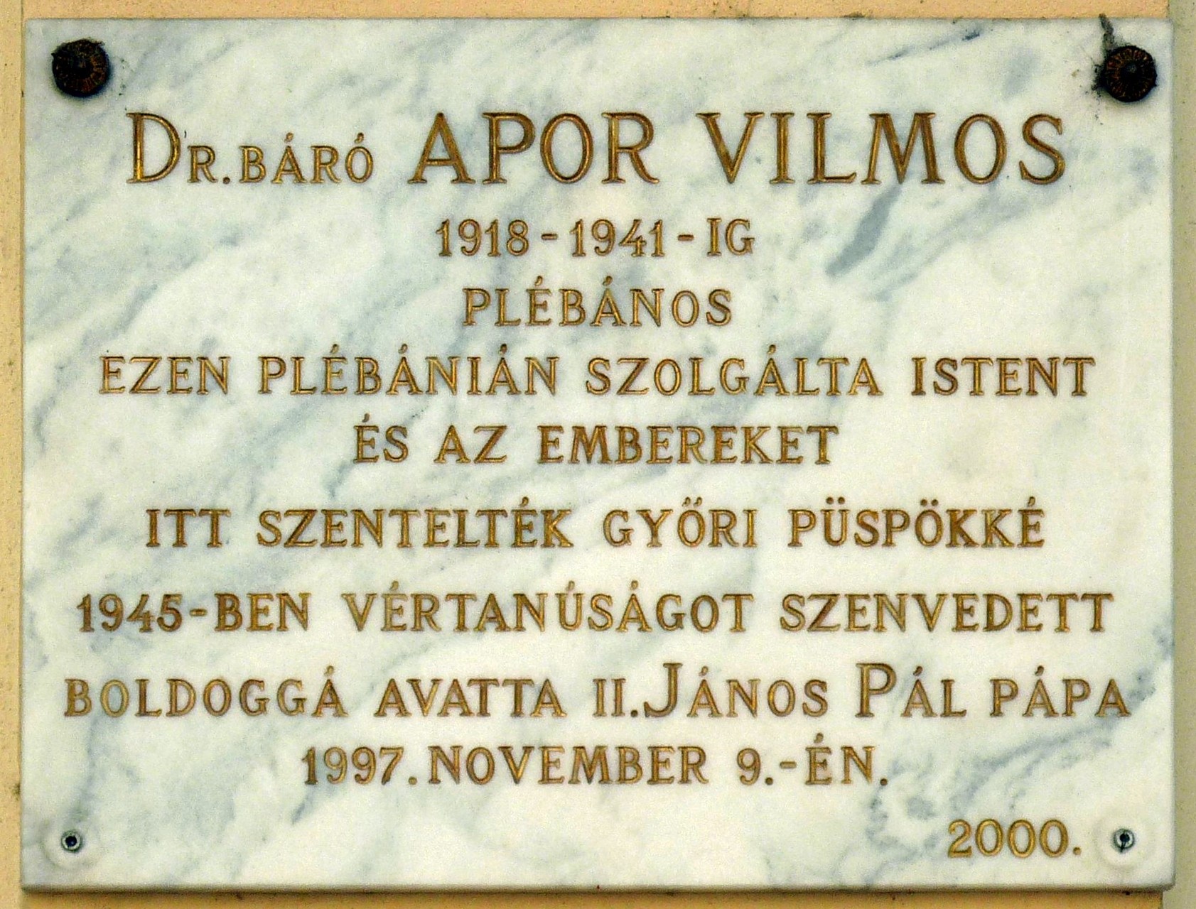 20 évvel ezelőtt, 2000. február 29-én ünnepélyesen elhelyezték a plébánia épületének falán az Apor-emléktáblát. Beszédet dr. Mánya Tibor, az Apor Vilmos Emlékbizottság gyulai szervezetének elnöke mondott.