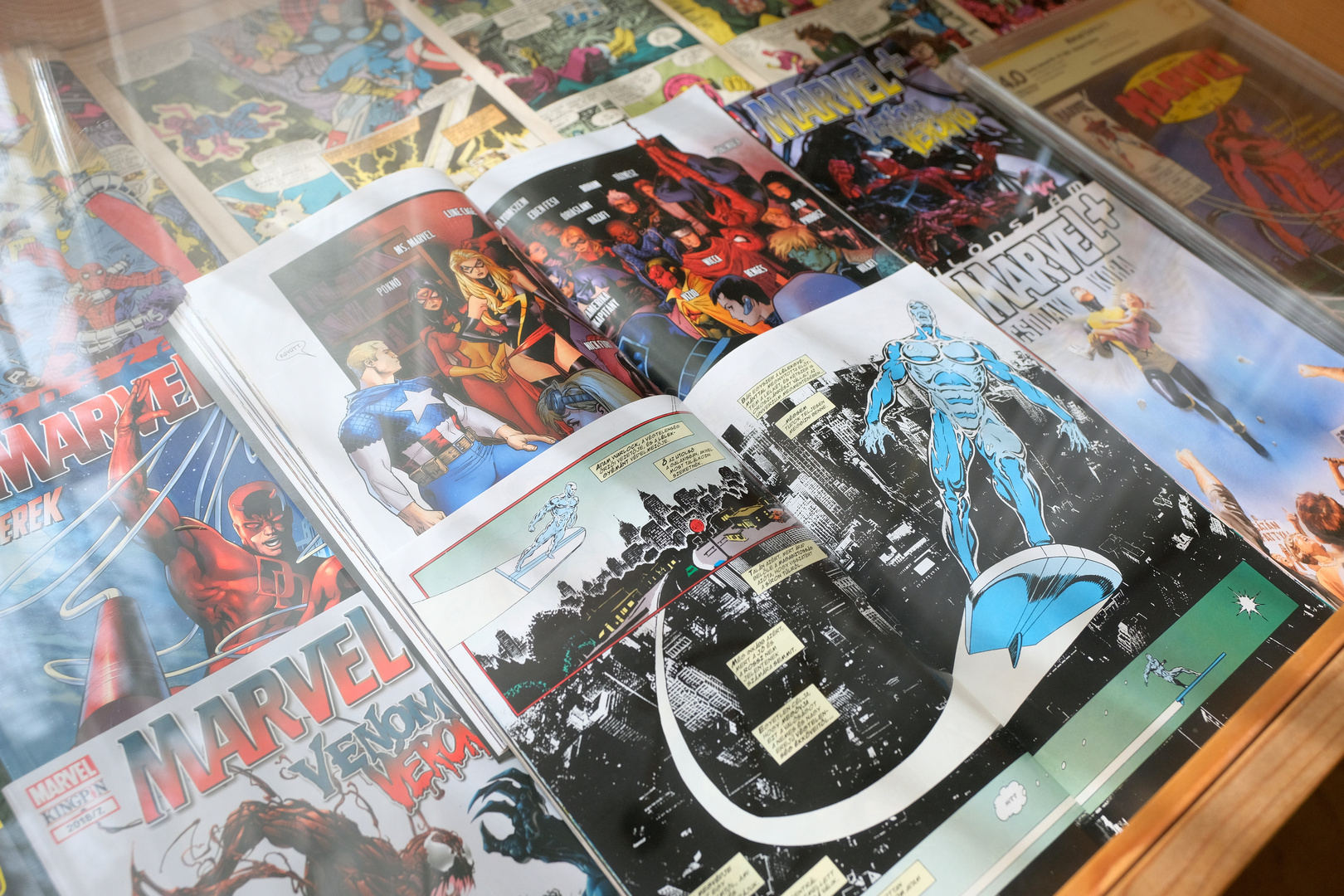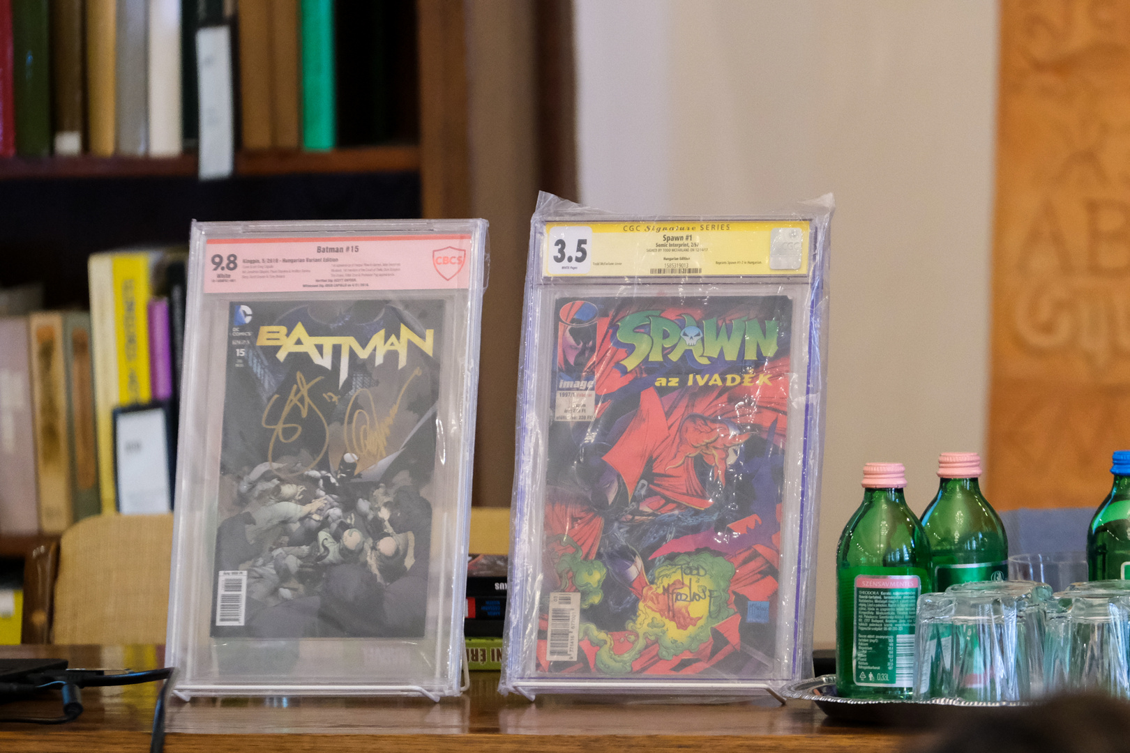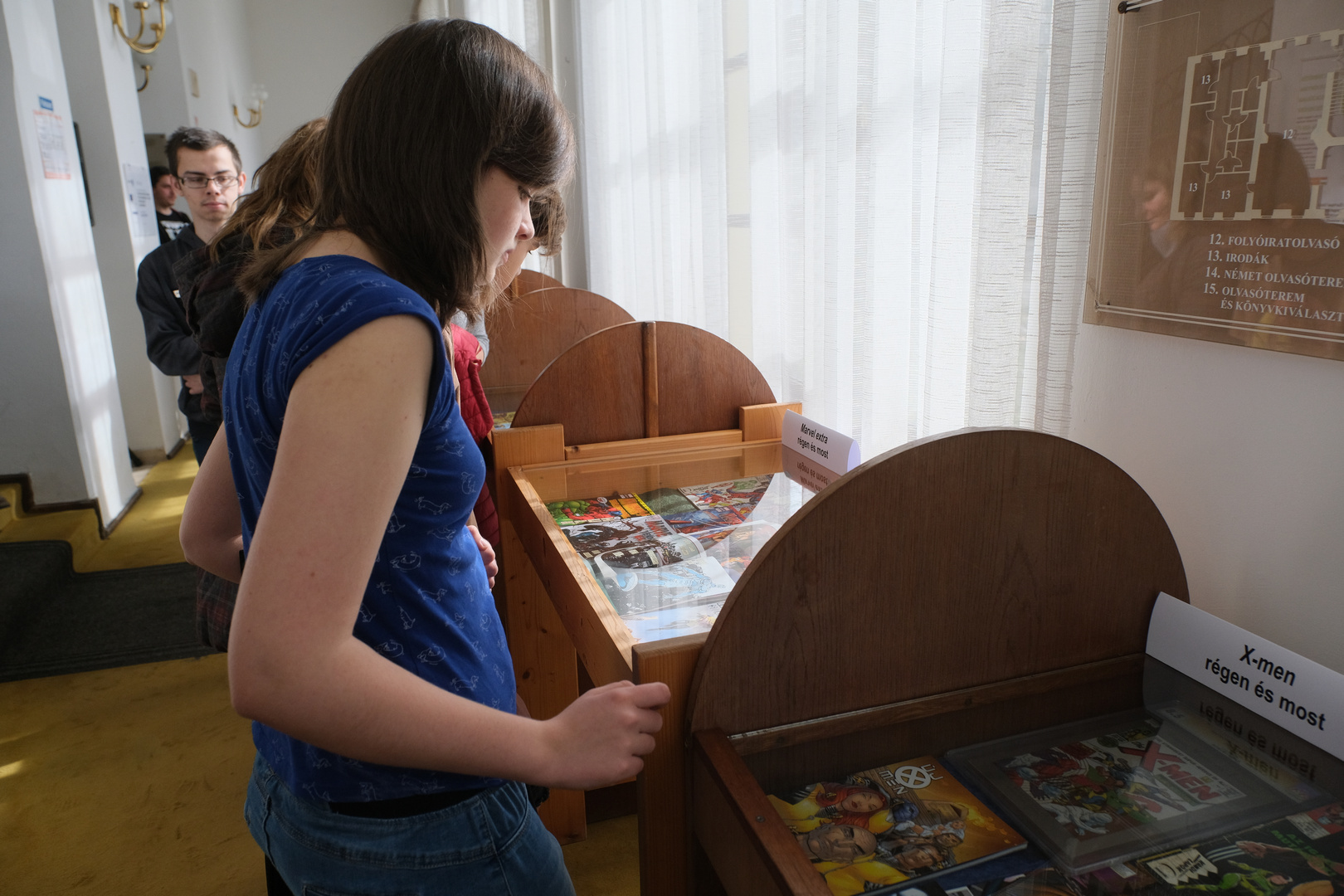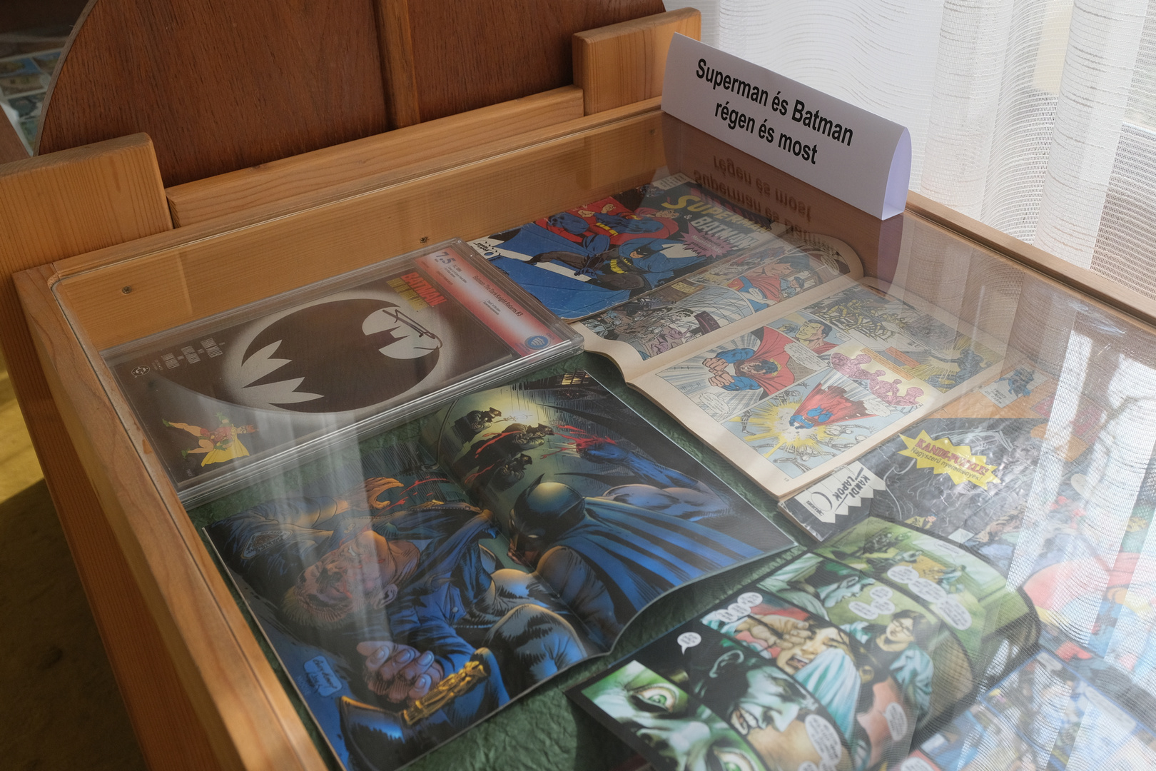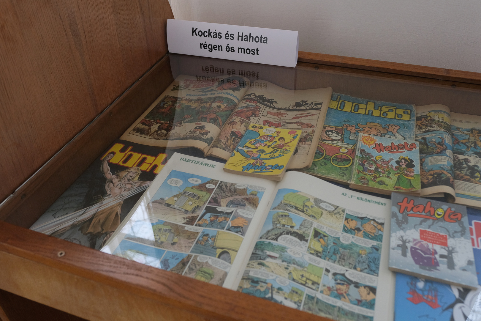 Az üveglapok alatt felfedezhettük a korabeli Kockásokat, Hahotákat és az első Magyarországon megjelent szuperhősöket bemutató füzeteket is, de a legújabb, gyakran könyvvastagságú kötetek is helyet kaptak a kiállított anyagban.