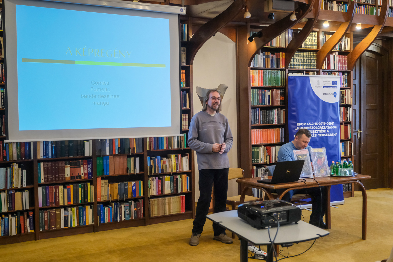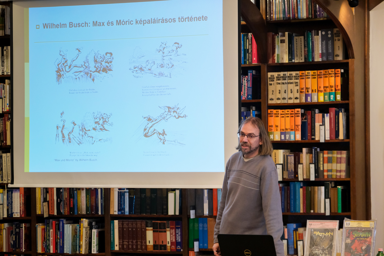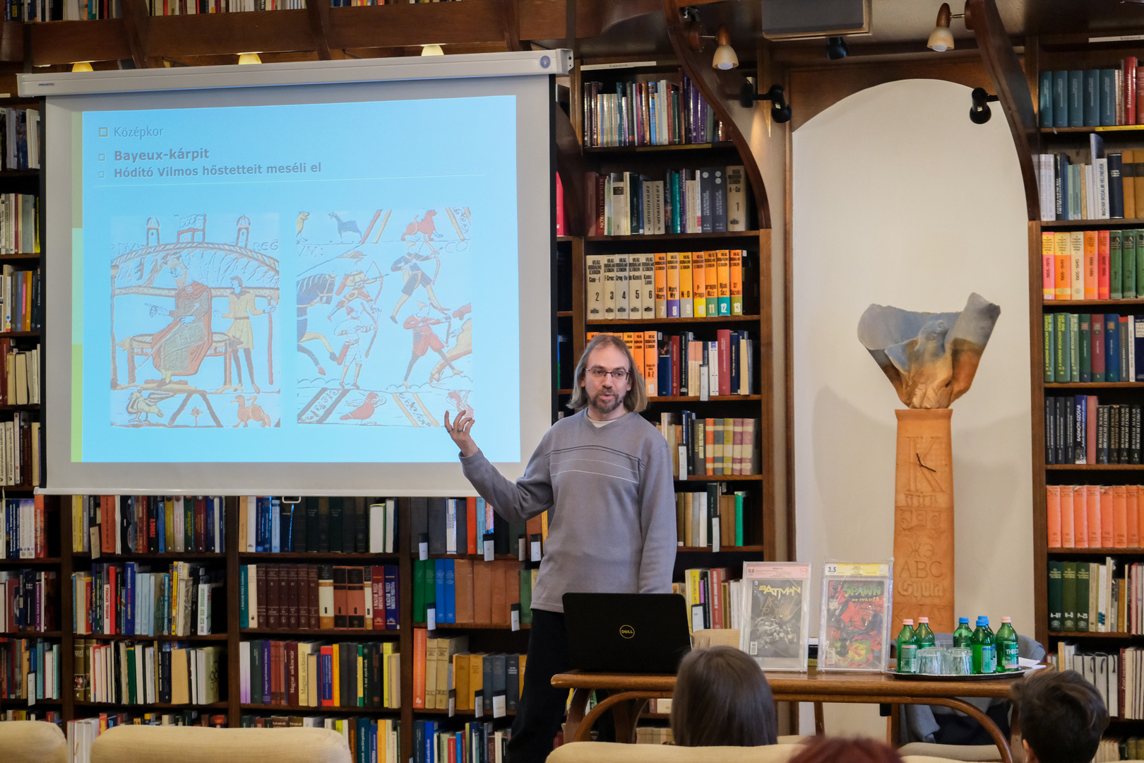 Halmi Zsolt előadásában a képregények kialakulásának történetébe vezette be a hallgatóságot. Az előzmények egészen a barlangrajzokig nyúlnak vissza, de képekben meséltek el történeteket az egyiptomiak, a rómaiak és a görögök is, illetve a középkorból is találhatunk példákat.