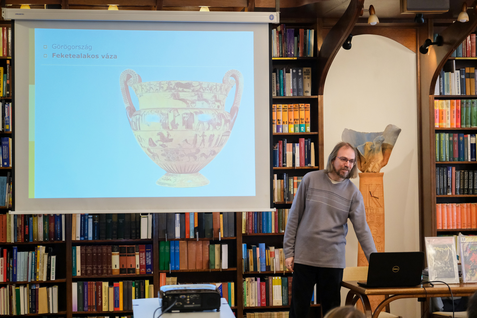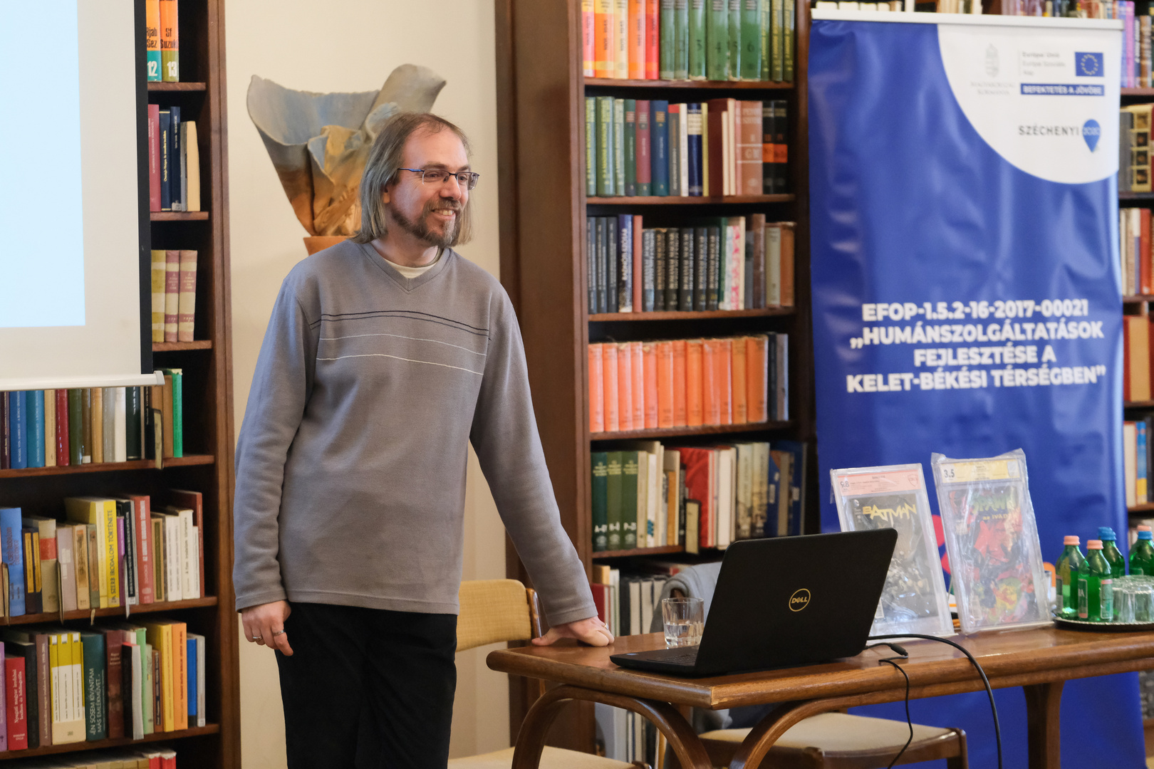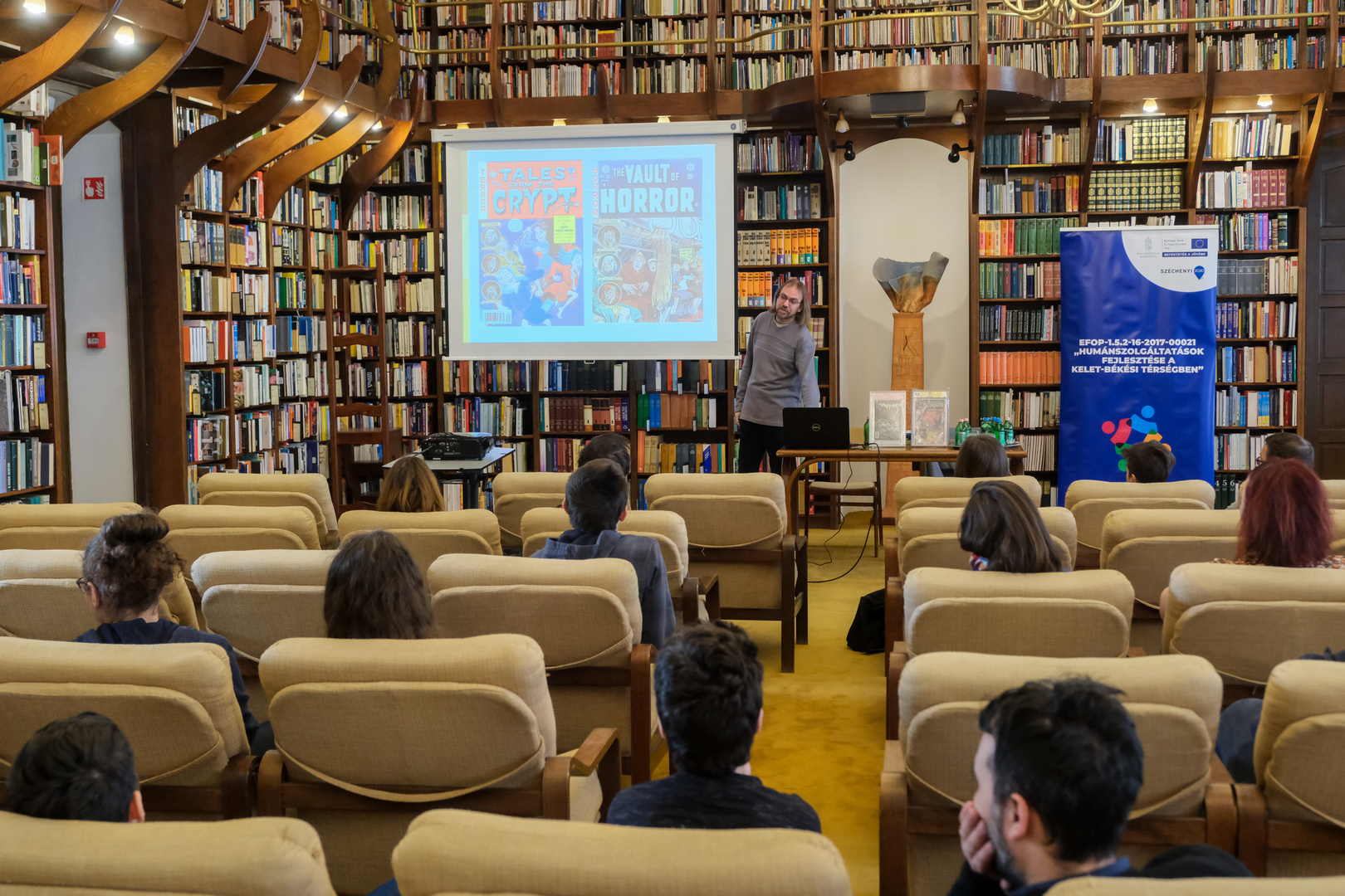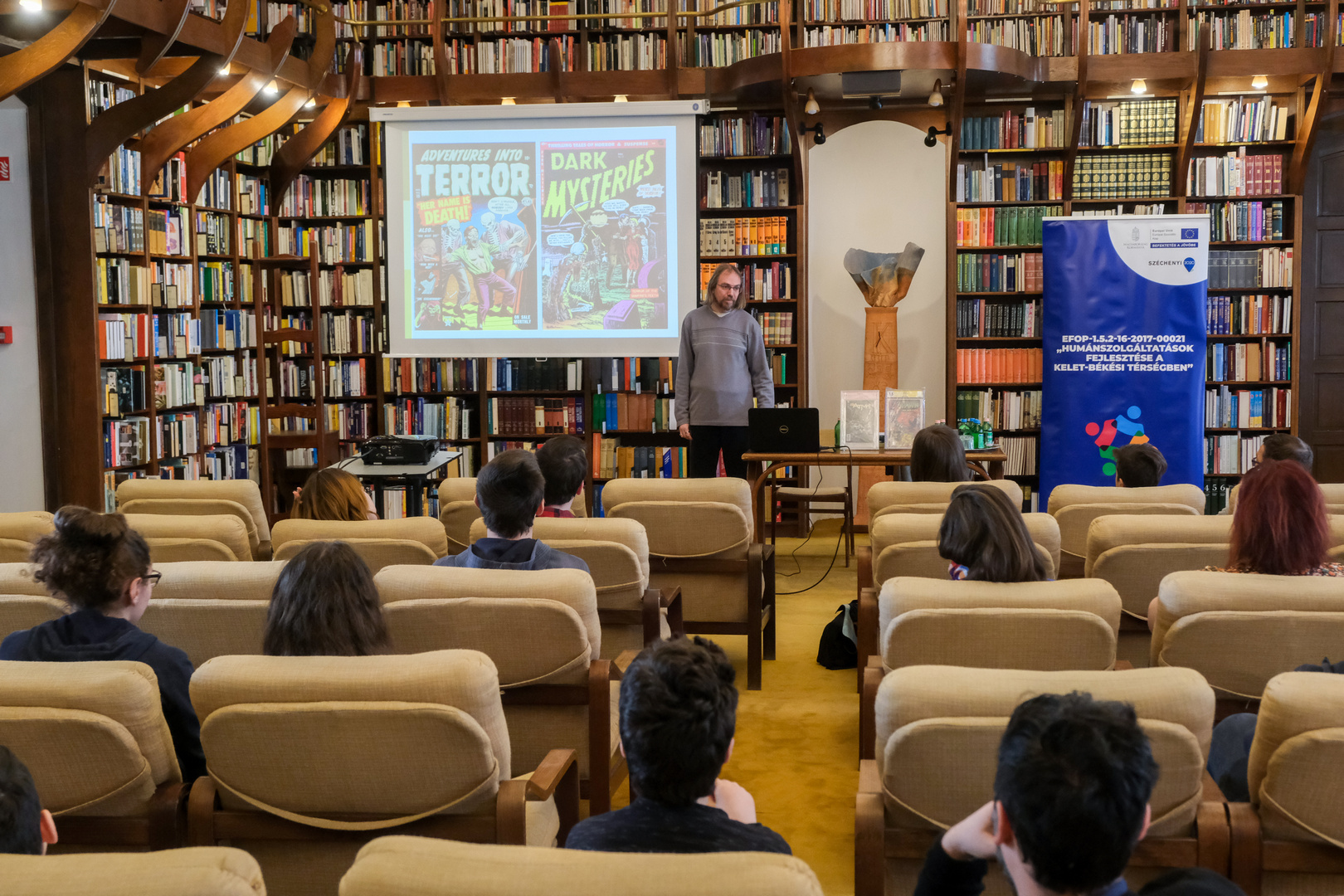 Halmi Zsolt előadásában a képregények kialakulásának történetébe vezette be a hallgatóságot. Az előzmények egészen a barlangrajzokig nyúlnak vissza, de képekben meséltek el történeteket az egyiptomiak, a rómaiak és a görögök is, illetve a középkorból is találhatunk példákat.