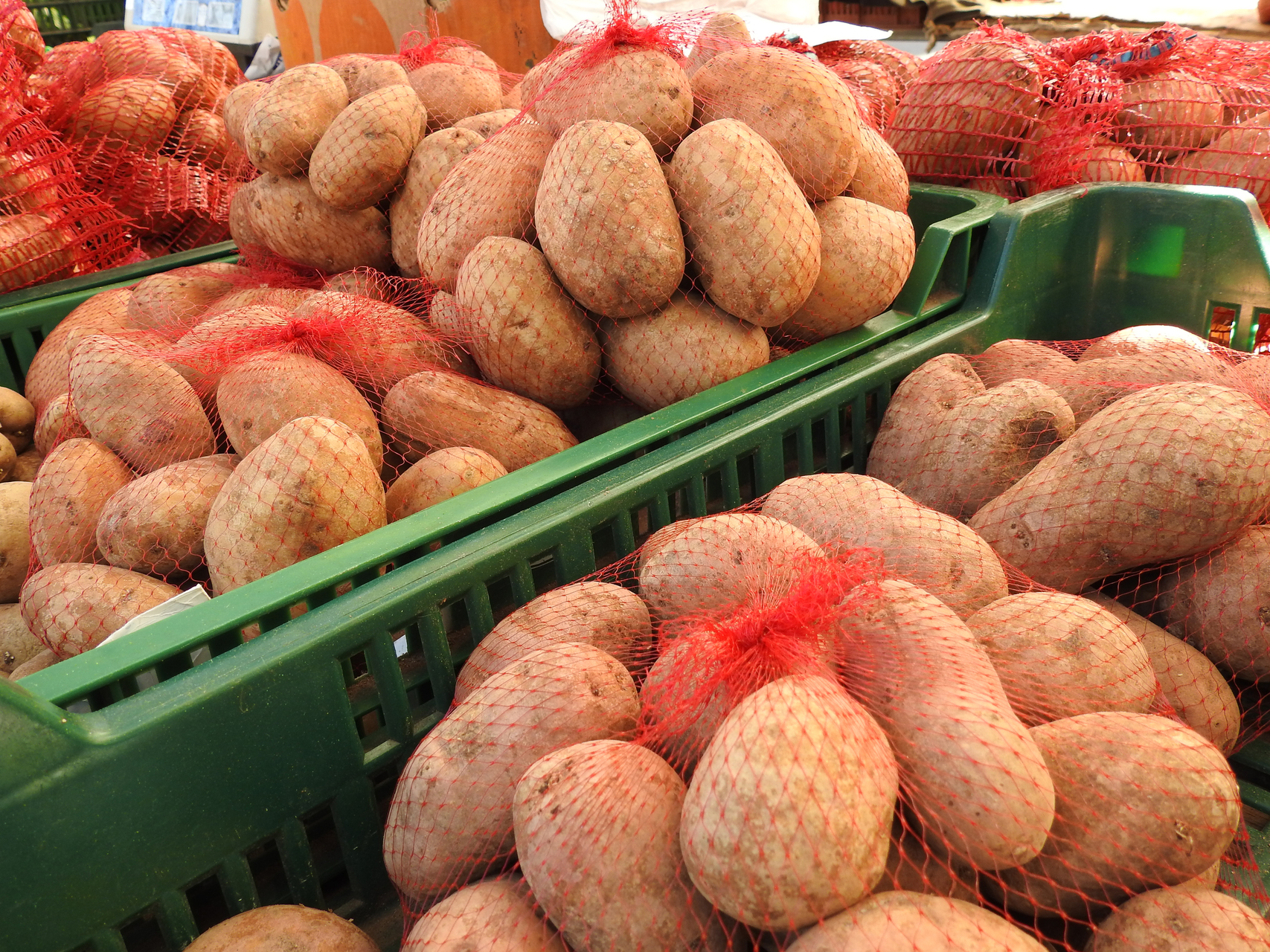 Ottjártunkkor legalább hatféle burgonyát árultak, sárga színű, édeskés fajtát és nagy méretű, fehér húsú krumplit is találtunk.