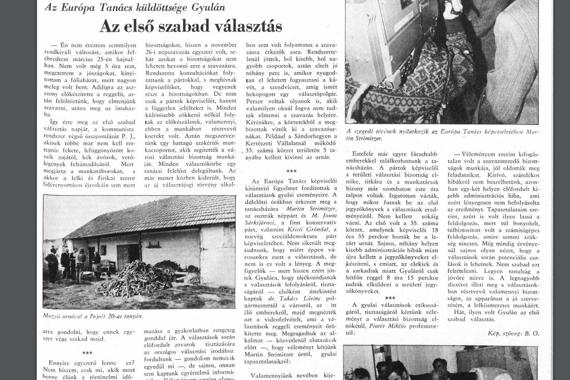 (...) Az Európa Tanács képviselői kitüntető figyelmet fordítottak a választások gyulai eseményeire. A délelőtti órákban érkezett meg a tanácsházára Martin Strimitzer, az osztrák néppárt és M. Jouni Sarkijarovi, a finn konzervatív párt, valamint Kristi Gröndal, a norvég szociáldemokrata párt képviseletében. Nem sikerült megtudnunk, hogy miért éppen városunkra esett a választásuk, de nem is ez volt a lényeg. A megfigyelők – mert hiszen ezért jöttek Gyulára, hogy tájékozódjanak a választások lefolyásáról, tisztaságáról – elsőként áttekintést kaptak dr. Takács Lőrinc polgármestertől a városról, az itt élő emberekről, majd megnézték azt a videófelvételt, ami a választások reggeli eseményeit örökítette meg (...)