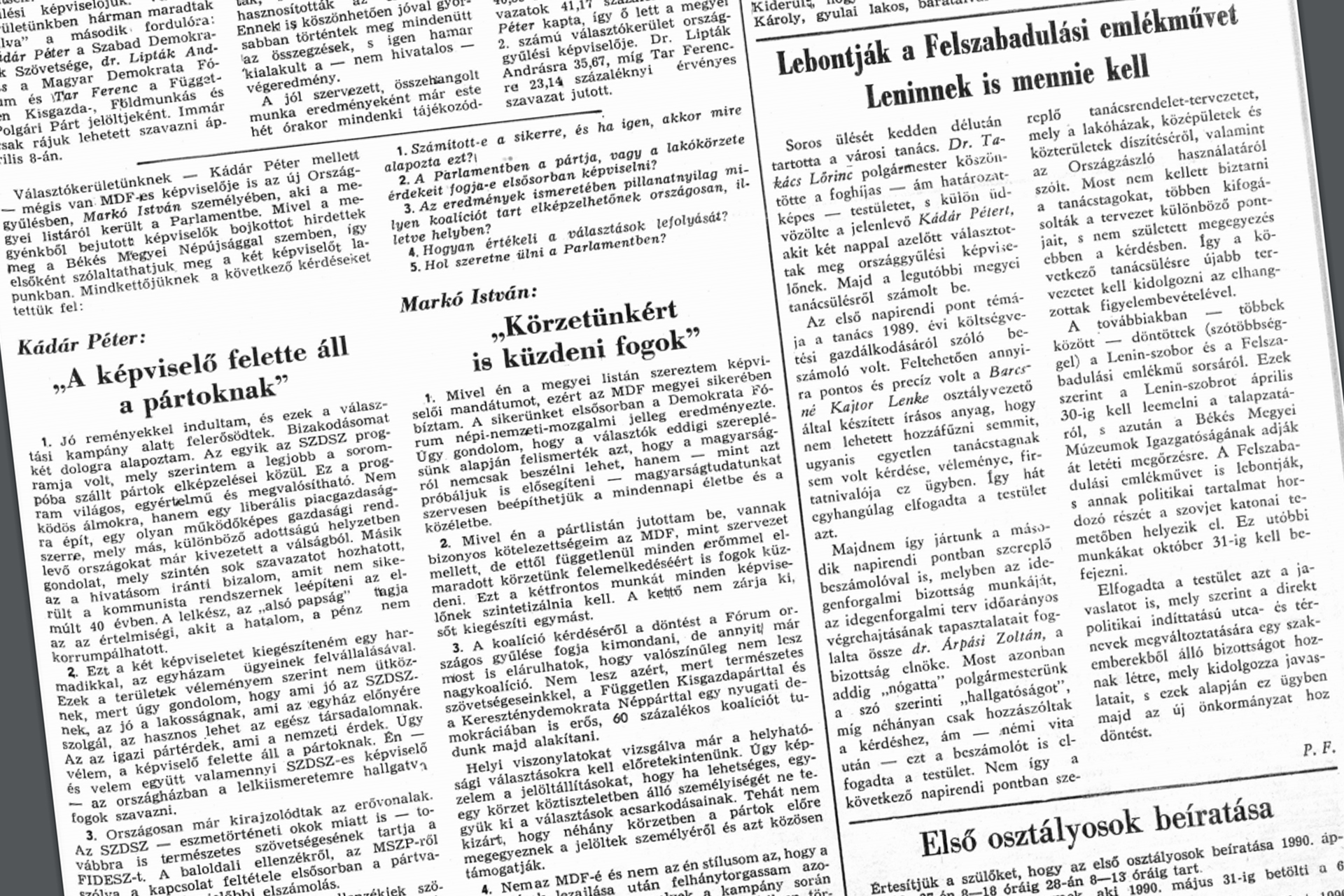 Soros ülését kedden délután tartotta a városi tanács. Dr. Takács Lőrinc polgármester köszöntötte a foghíjas – ám határozatképes – testületet, s külön üdvözölte a jelenlevő Kádár Pétert, akit két nappal azelőtt választottak meg országgyűlési képviselőnek. Majd a legutóbbi megyei tanácsülésről számolt be. (…) A továbbiakban – többek között – döntöttek (szótöbbséggel) a Lenin-szobor és a Felszabadulási emlékmű sorsáról. Ezek szerint a Lenin-szobrot április 30-ig kell leemelni a talapzatáról, s azután a Békés Megyei Múzeumok Igazgatóságának adják át letéti megőrzésre. A Felszabadulási emlékművet is lebontják, s annak politikai tartalmat hordozó részét a szovjet katonai temetőben helyezik el. Ez utóbbi munkákat október 31-ig kell be fejezni (…)