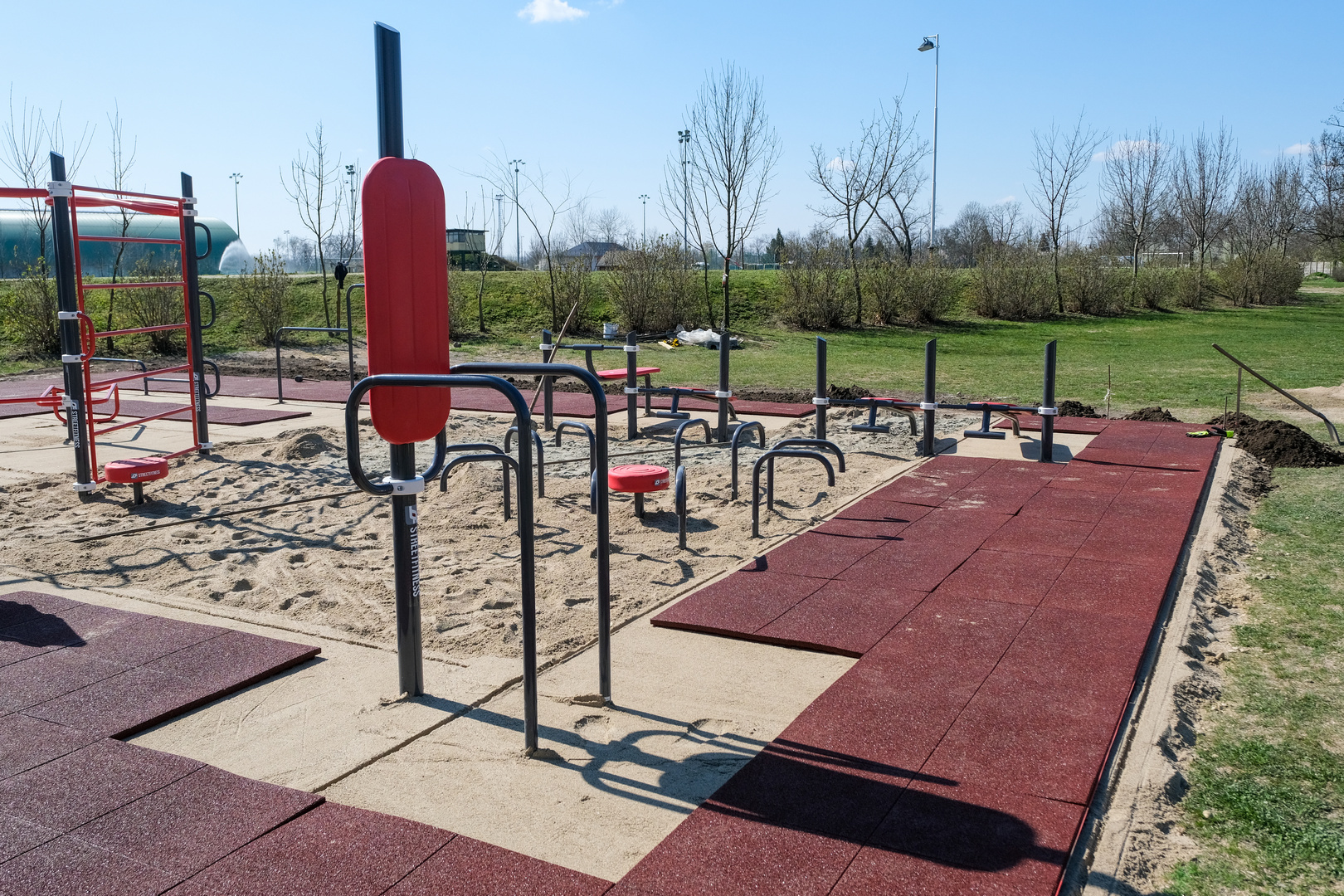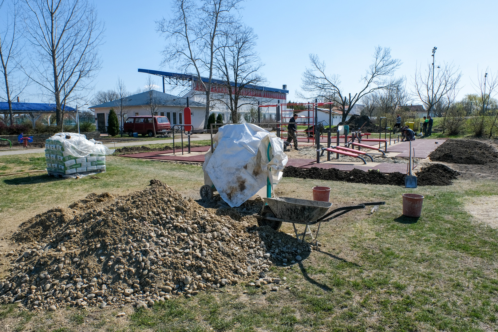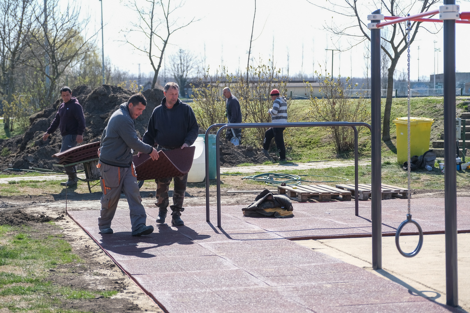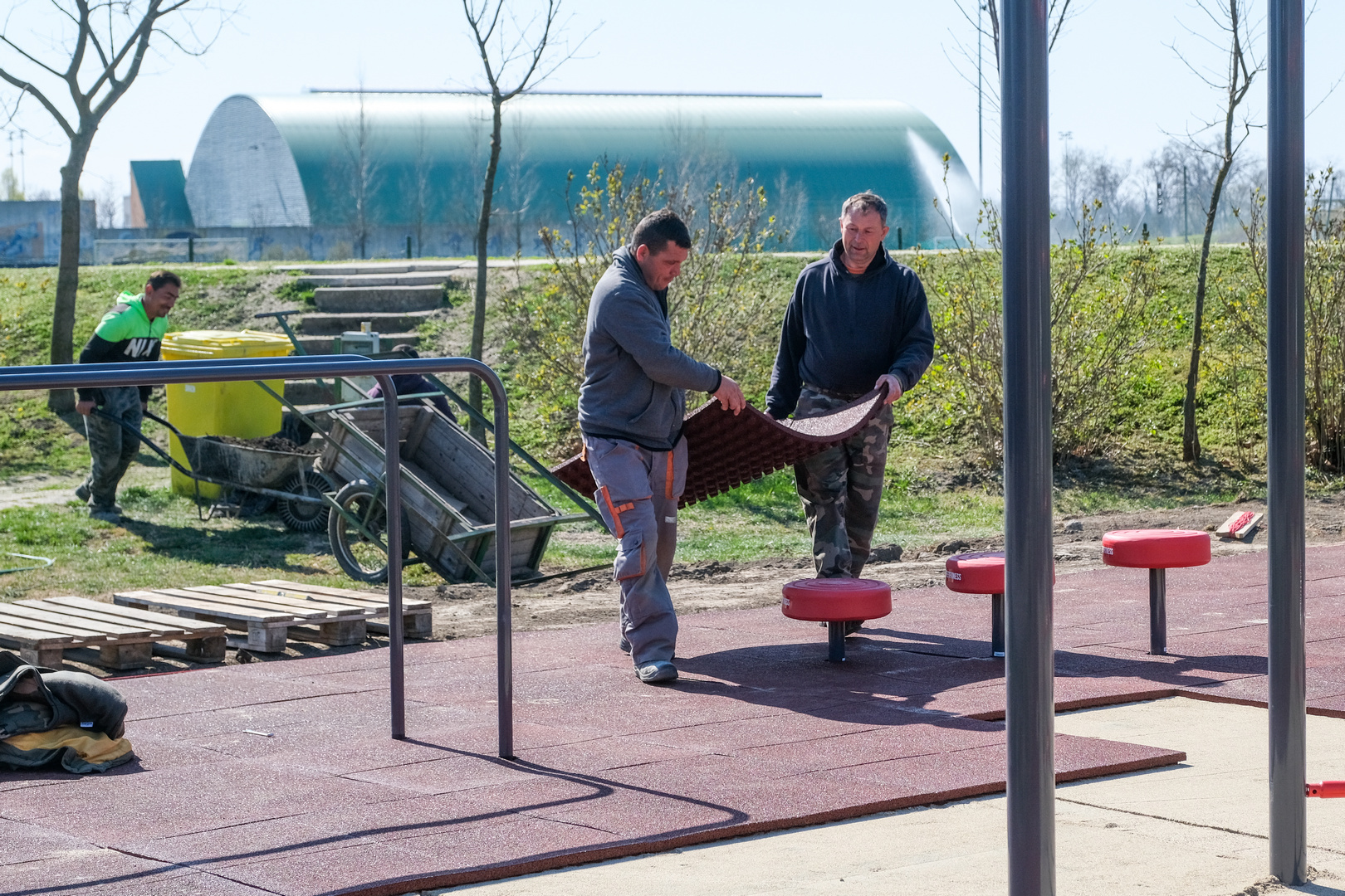 jelenleg a gumitégla burkolat elhelyezése folyik a sporttelep kültéri fitneszparkján