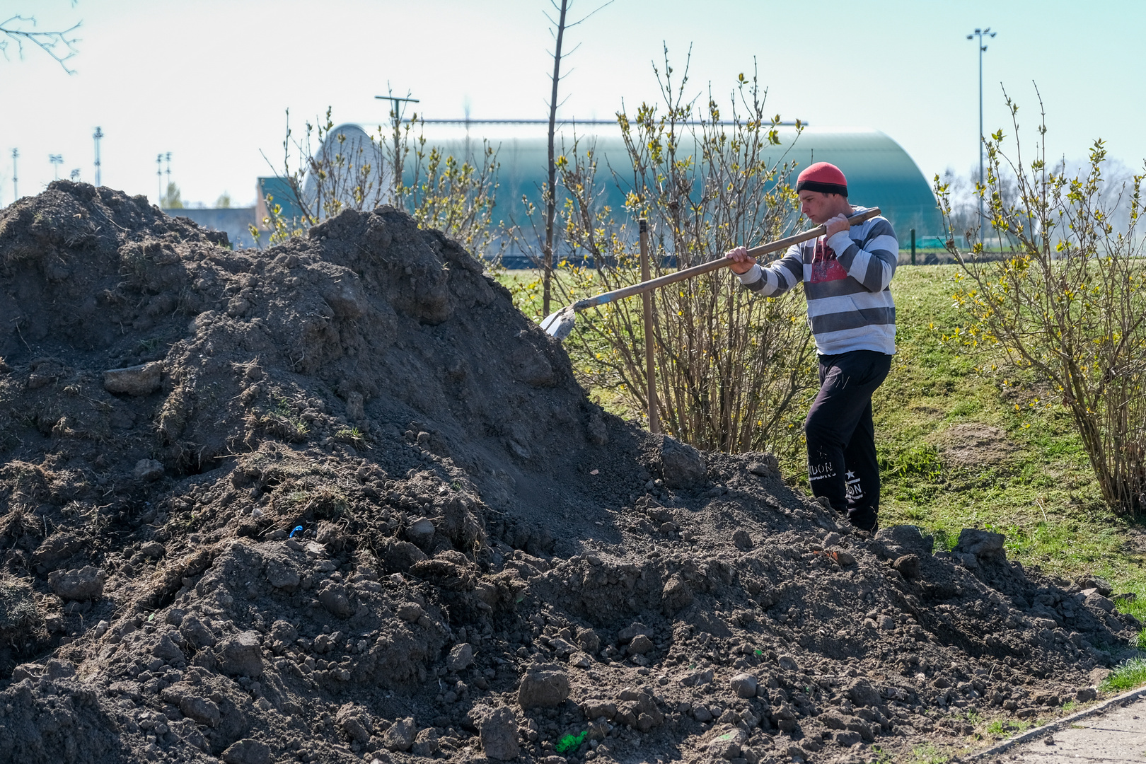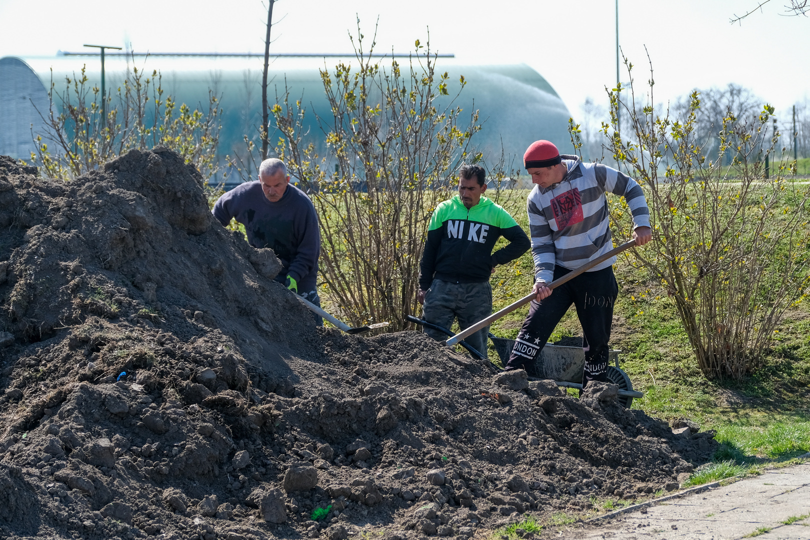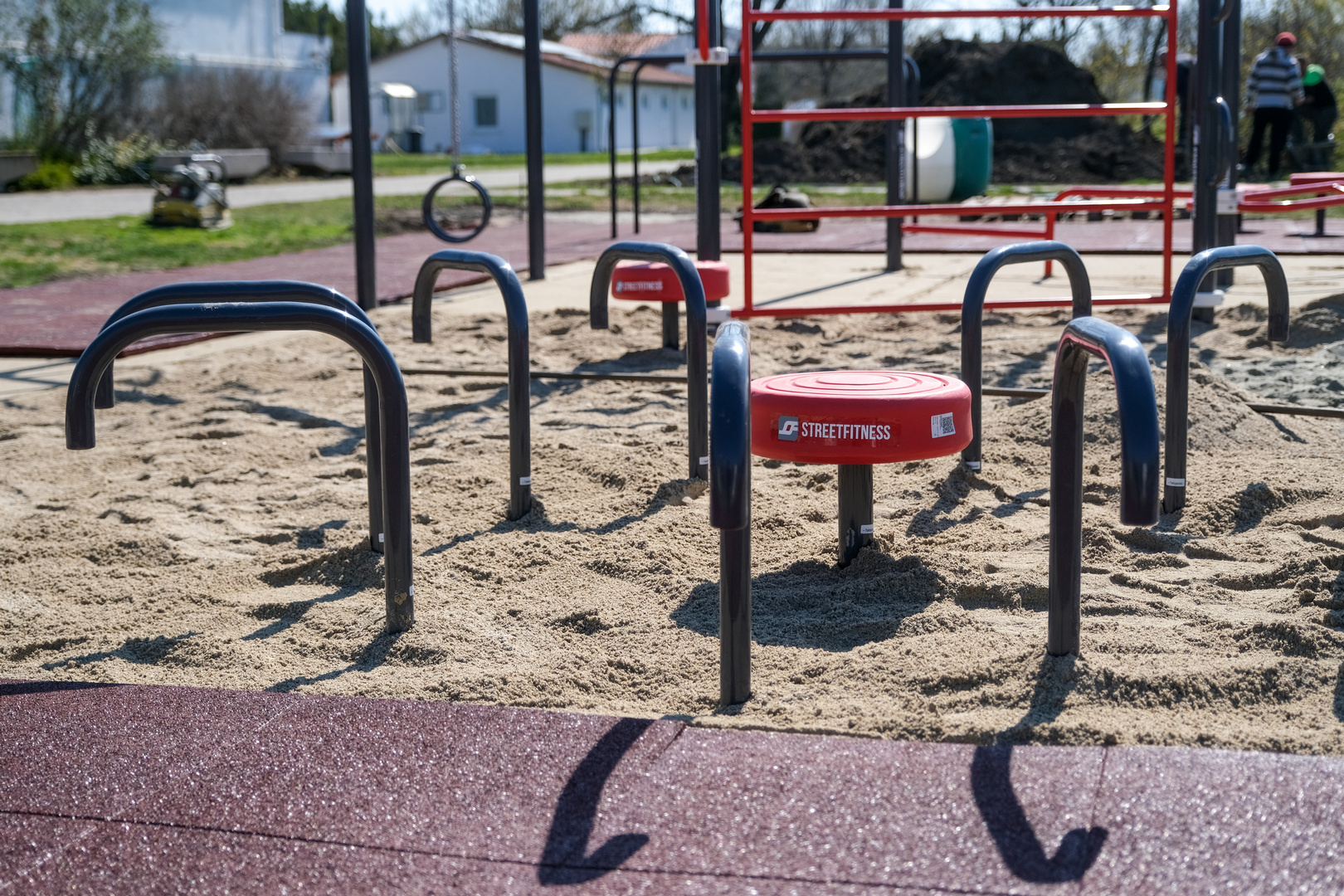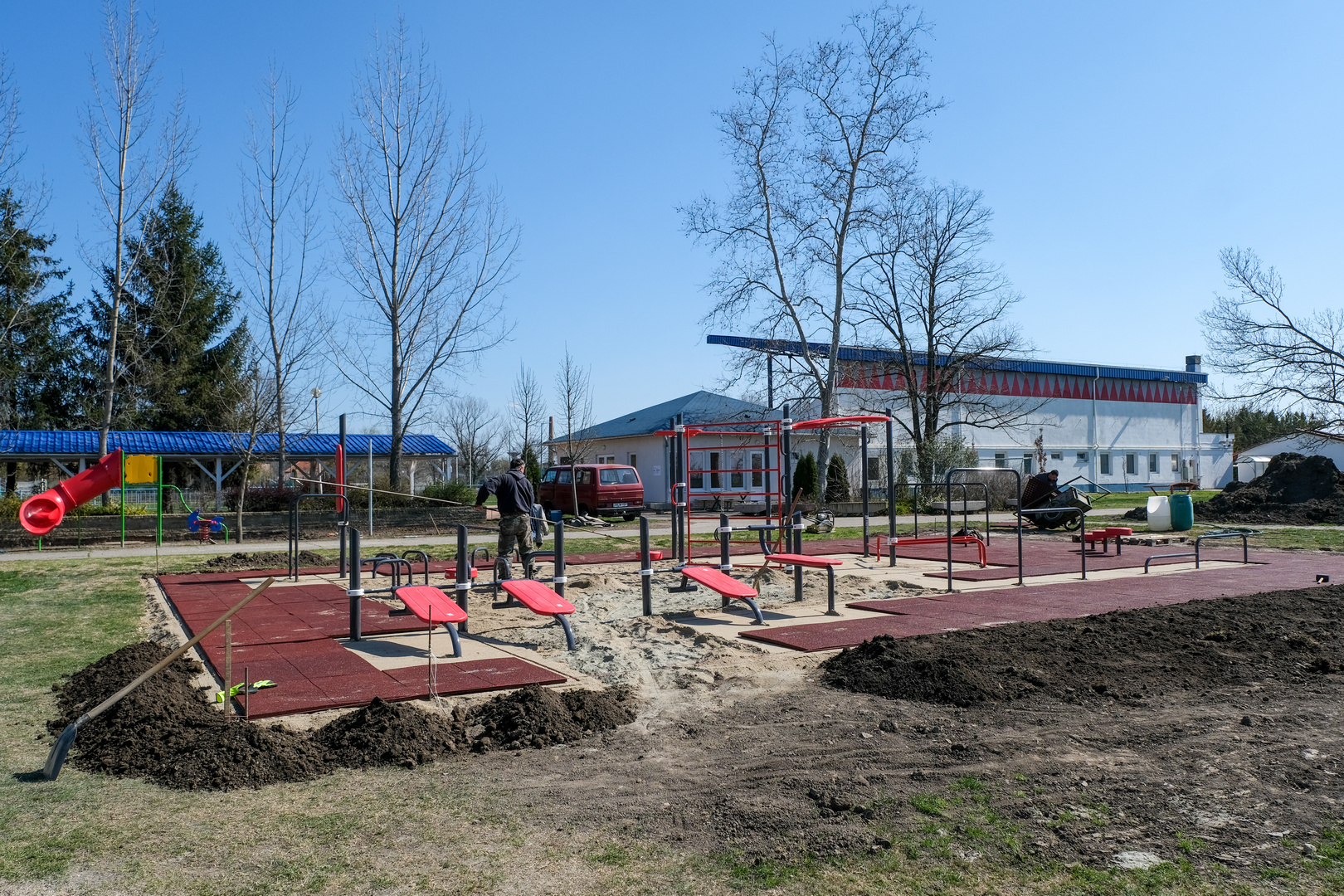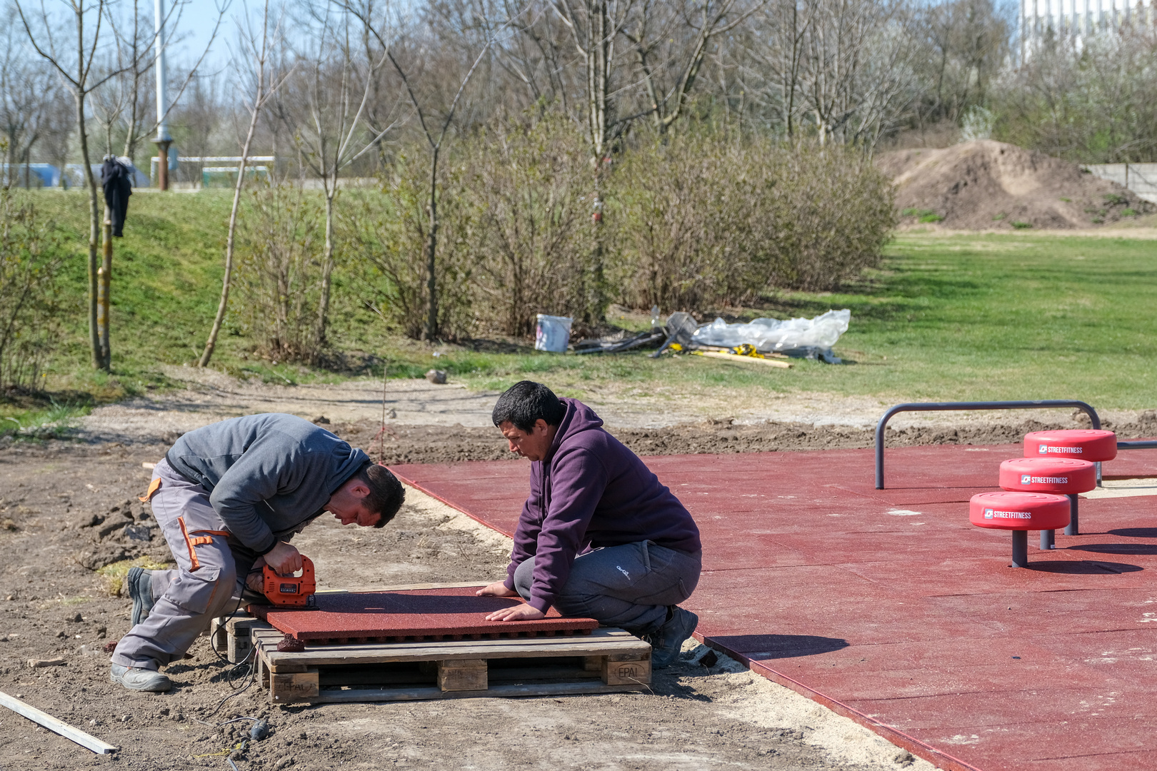 jelenleg a gumitégla burkolat elhelyezése folyik a sporttelep kültéri fitneszparkján