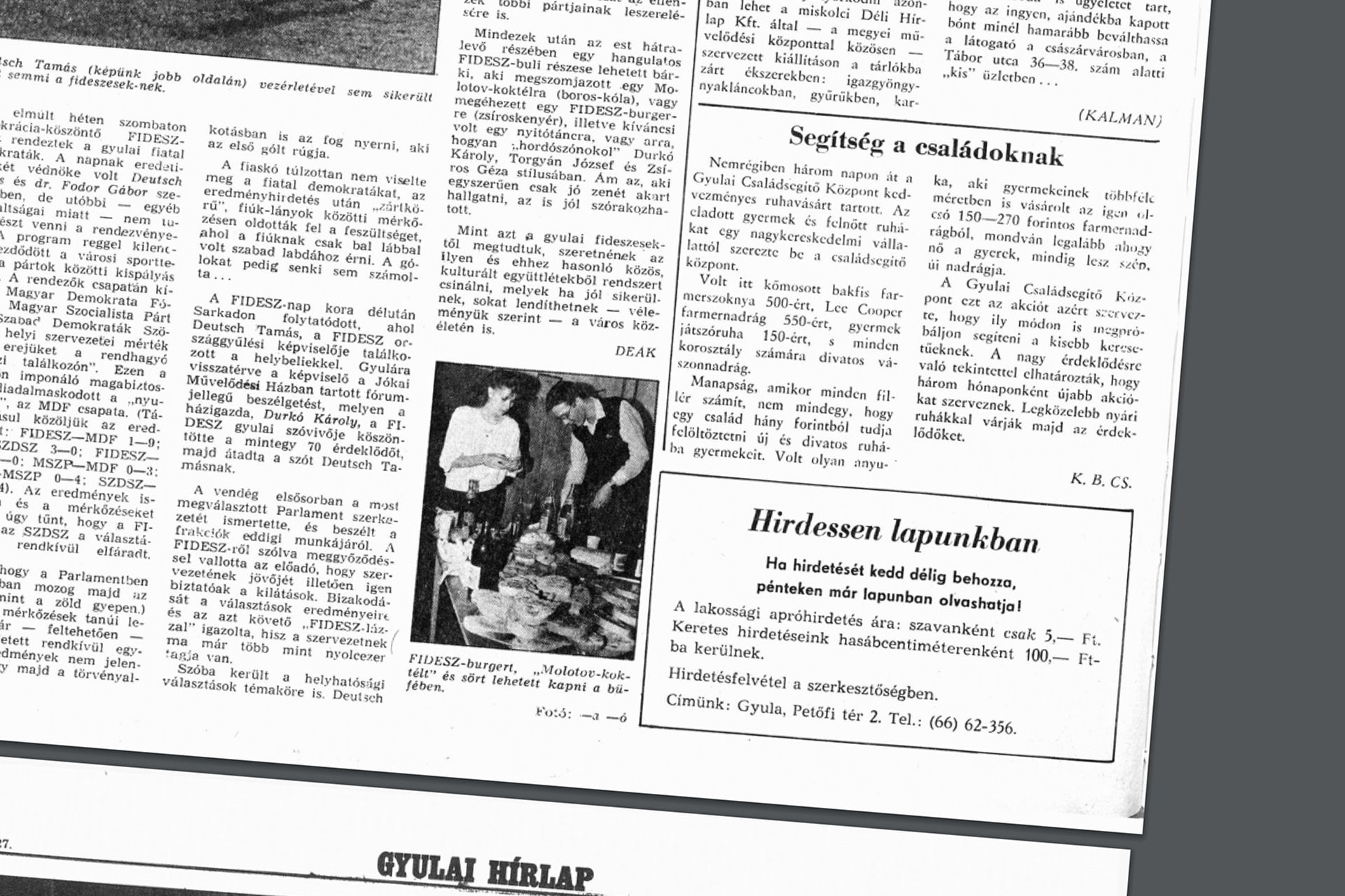Nemrégiben, három napon át, a Gyulai Családsegítő Központ kedvezményes ruhavásárt tartott. Az eladott gyermek- és felnőttruhákat egy nagykereskedelmi vállalattól szerezte be a családsegítő központ. Volt itt kőmosott bakfisfarmerszoknya 500-ért, Lee Cooper farmernadrág 550-ért, gyermekjátszóruha 150-ért, s minden korosztály számára divatos vászonnadrág. Manapság, amikor minden fillér számít, nem mindegy, hogy egy család hány forintból tudja felöltöztetni új és divatos ruhába gyermekeit. Volt olyan anyuka, aki gyermekeinek többféle méretben is vásárolt az igen olcsó 150–270 forintos farmernadrágból, mondván, legalább ahogy nő a gyerek, mindig lesz szép, új nadrágja (…)