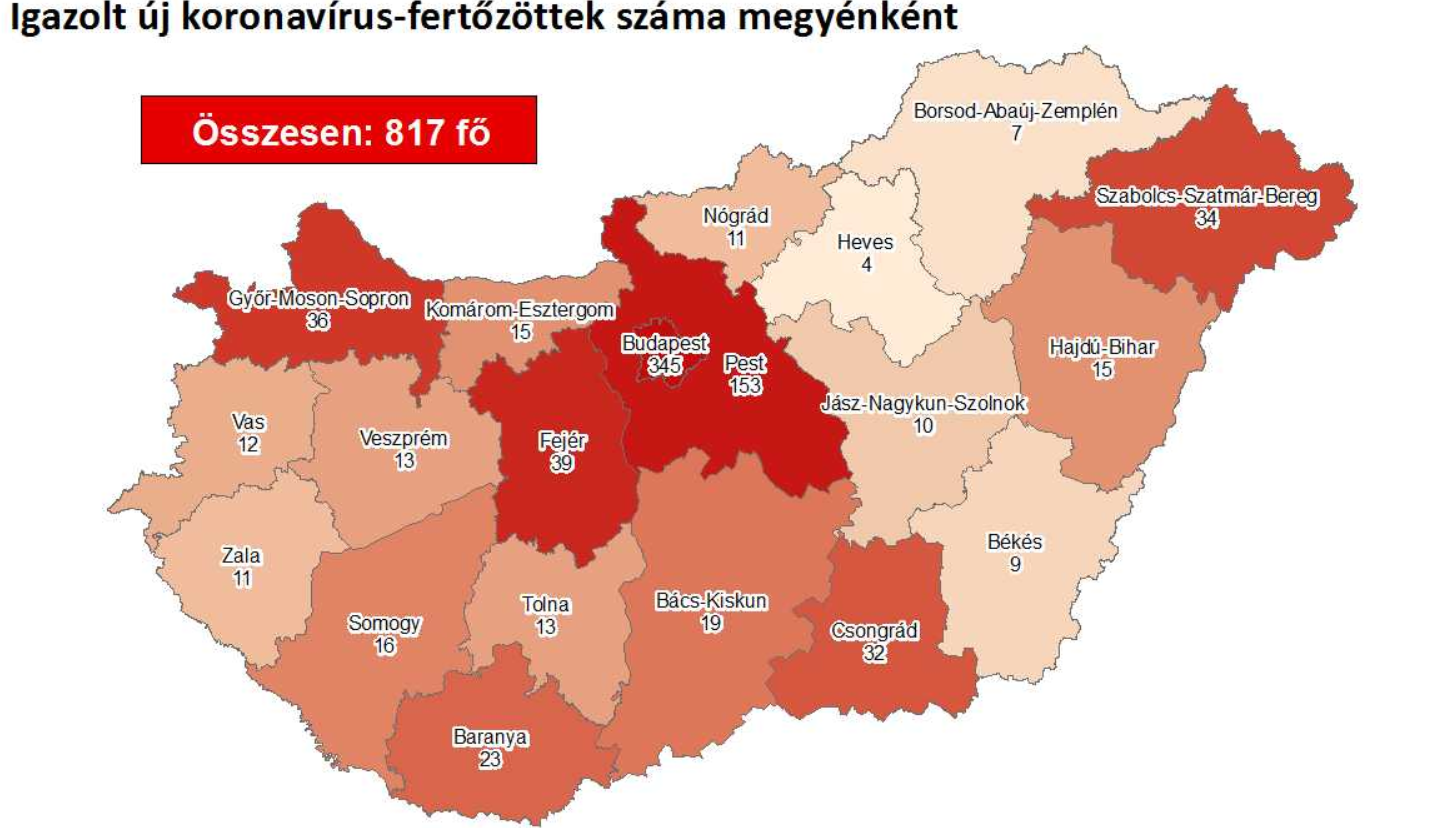 Az oldal térképe alapján továbbra is Budapesten (345 ember) és Pest megyében (153) van a legtöbb fertőzött.