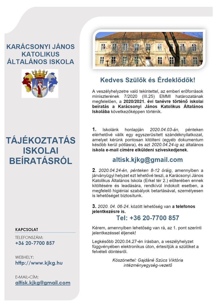 Tudnivalók a Karácsonyi János Katolikus Általános Iskolába való beiratkozásról