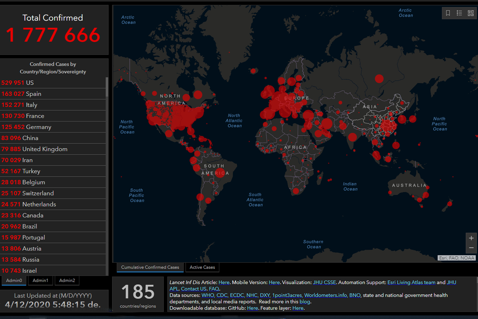 A szombat reggeli adatsorban 1 698 416 fertőzött, 96 432 halálos áldozat és 376 677 gyógyult szerepelt. A fertőzés 185 országban van jelen.