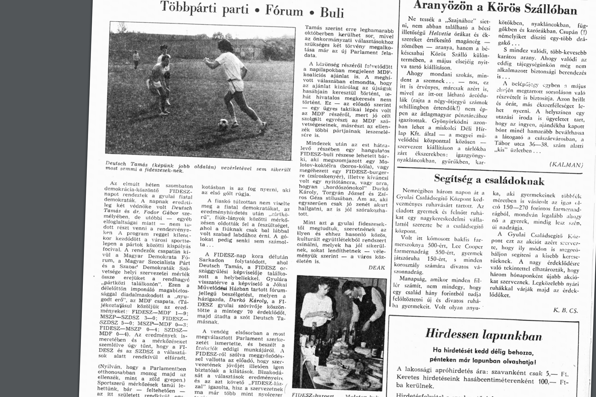 Az elmúlt héten szombaton demokráciaköszöntő Fidesz-napot rendeztek a gyulai fiatal demokraták. A napnak eredetileg két védnöke volt Deutsch Tamás és dr. Fodor Gábor személyében, de utóbbi – egyéb elfoglaltságai miatt – nem tudott részt venni a rendezvényeken. A program reggel kilenckor kezdődött a városi sporttelepen a pártok közötti kispályás focival. A rendezők csapatán kívül a Magyar Demokrata Fórum, a Magyar Szocialista Párt és a Szabad Demokraták Szövetségének helyi szervezetei mérték össze erejüket a rendhagyó „pártközi találkozón”. Ezen a délelőttön imponáló magabiztossággal diadalmaskodott a „nyugodt erő”, az MDF csapata. (Tájékoztatásul közöljük az eredményeket: Fidesz–MDF 1-9; MSZP–SZDSZ 3-0; Fidesz–SZDSZ 5-0; MSZP–MDF 0-3; Fidesz–MSZP 0-4; SZDSZ–MDF 0-4) (...)