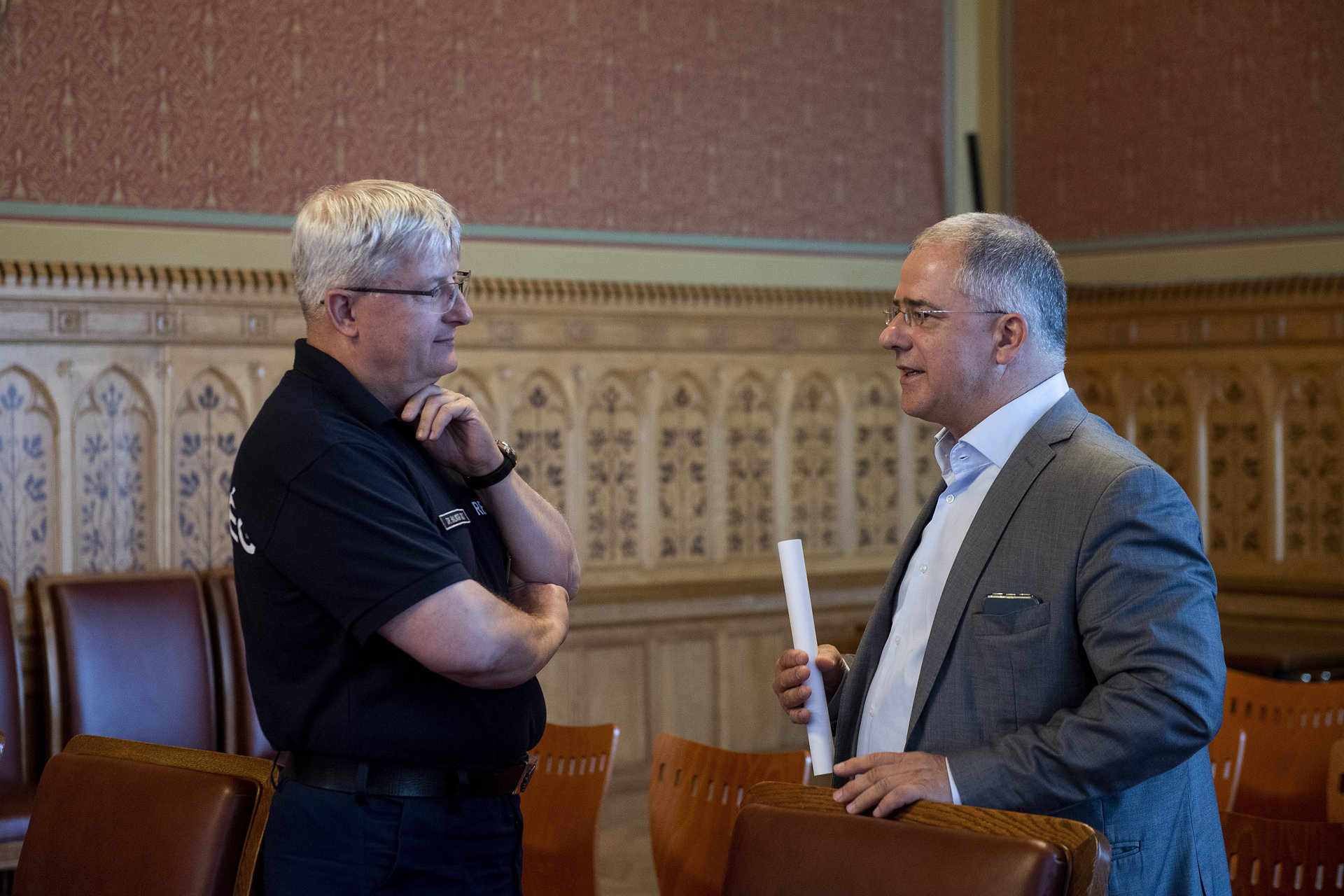 Halmosi Zsolt (bal oldalon), a járvány miatt kinevezett országos kórházfőparancsnok bizottsági meghallgatása, mellette kósa lajos